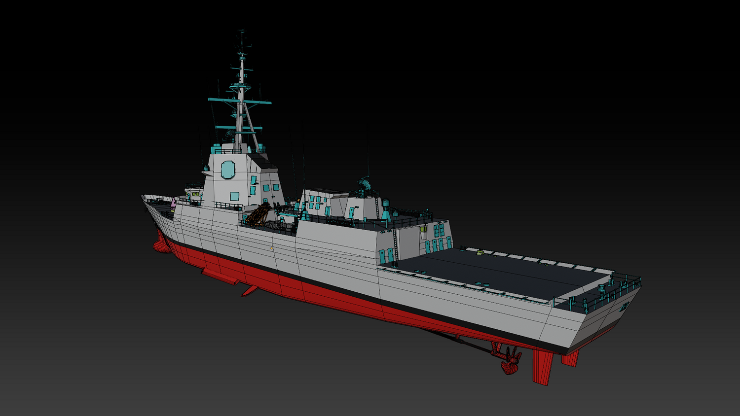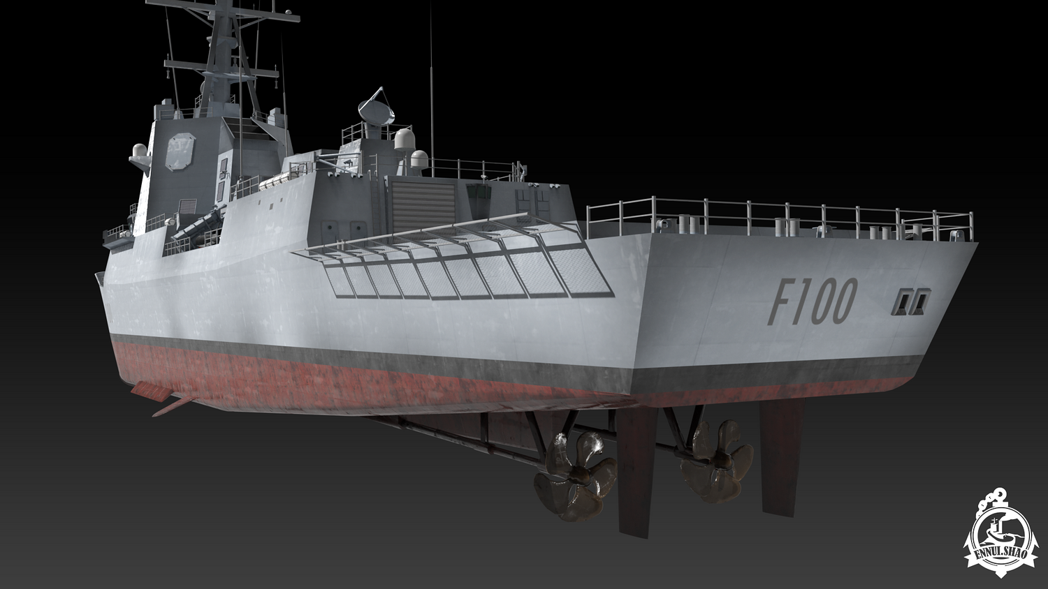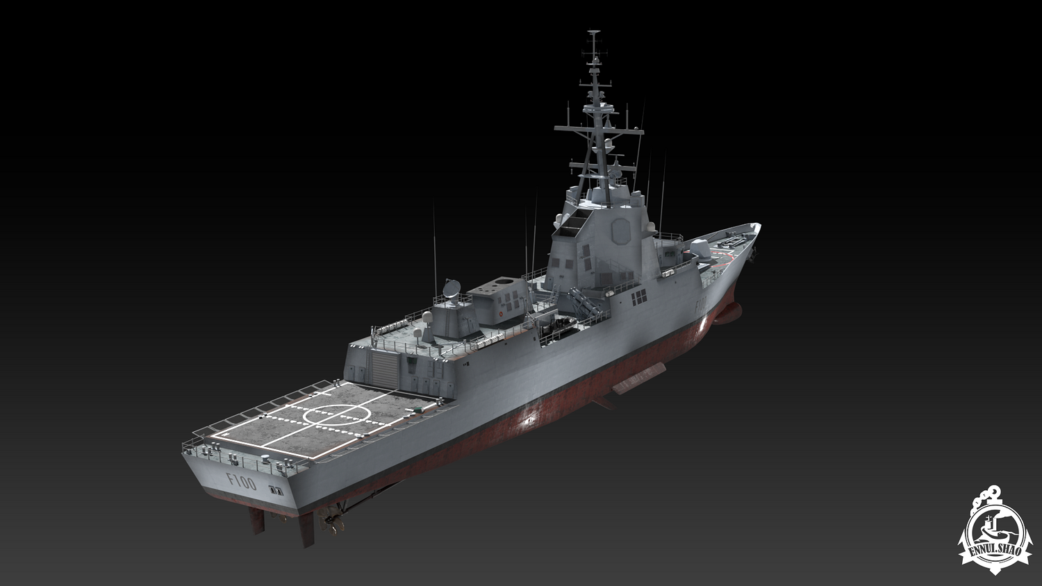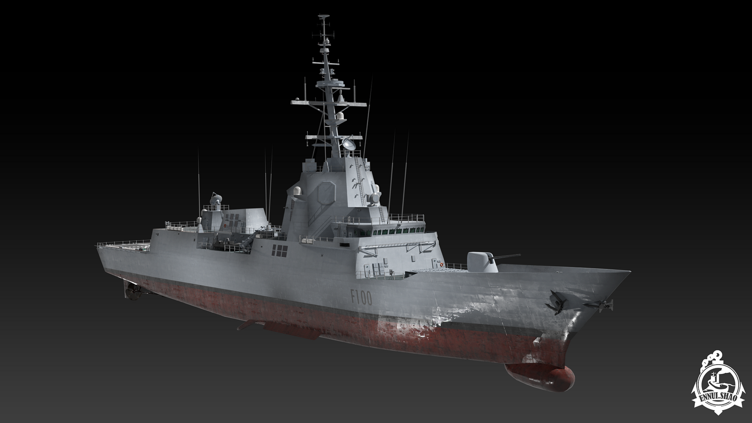 Spanish navy modern frigate SPS Alvaro de Bazan modeled with blender 3.5. 32 textures used, PBR material, UV mapped. The model is game-ready. FBX and OBJ format supported. All objects are named.