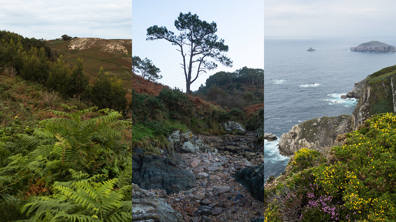 Tags: nature, scenery, view, environment, coastal landscape, cliff, beach, sand, grassy headland, lush vegetation, forest, seaside, tidal rocks, cliffside, panoramic vista, coastal wetlands, wild grassland, gorse bushes, natural reserve, scenic coastline, Atlantic shore, seascape, cinematic, trees, bushes, oceanic, wild, wildlife, seashore