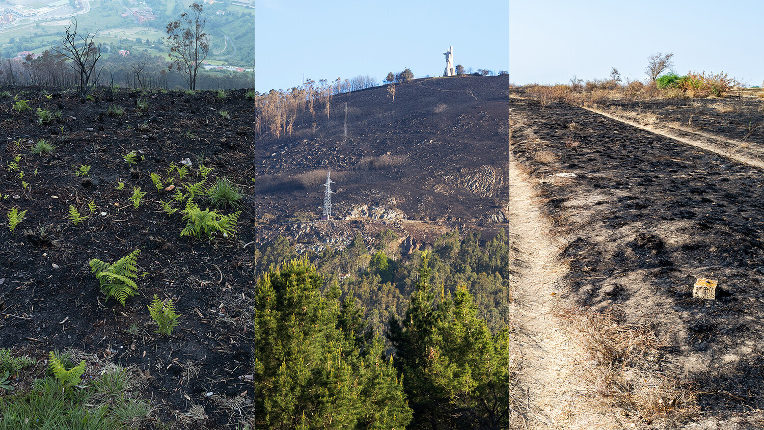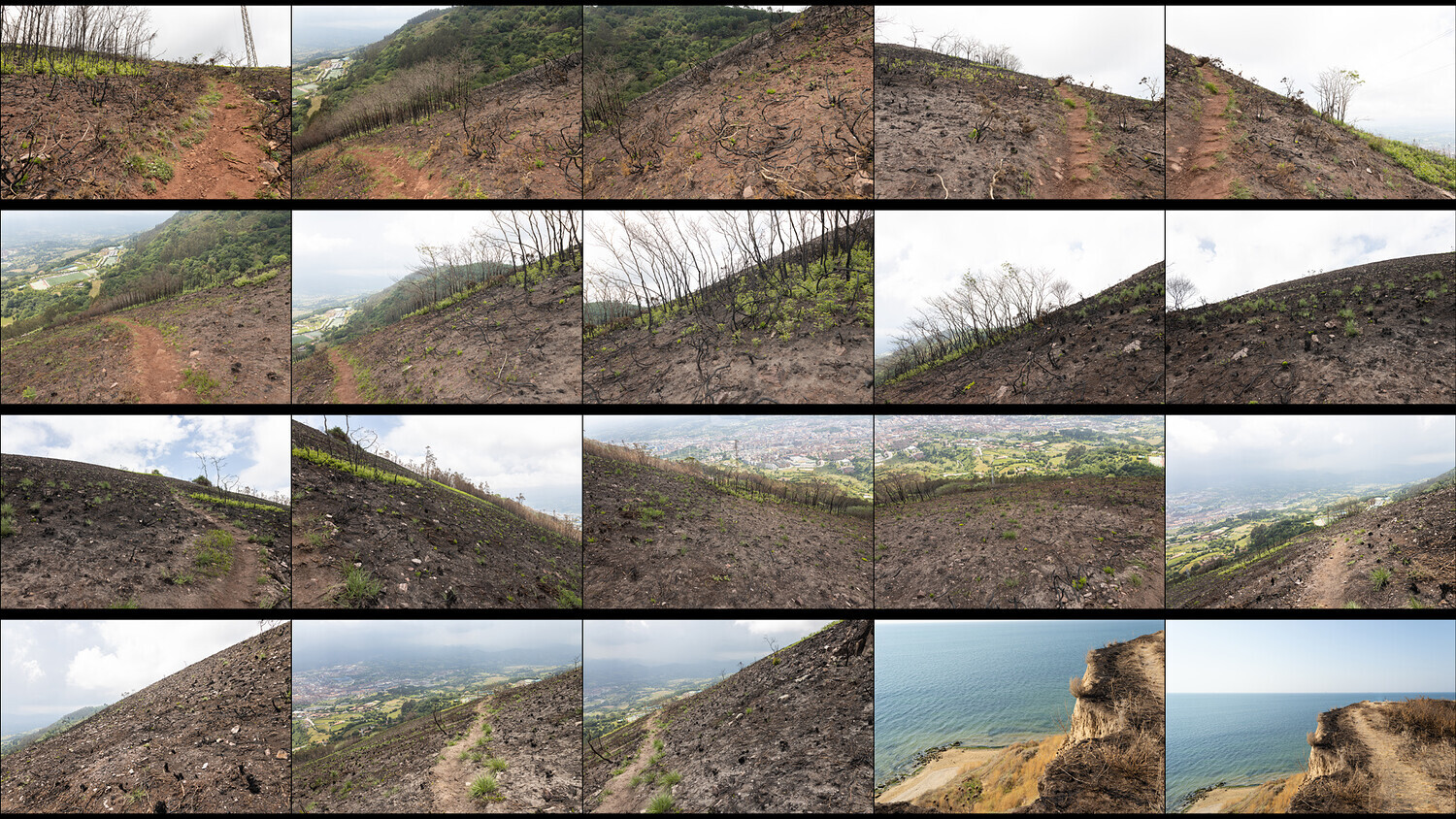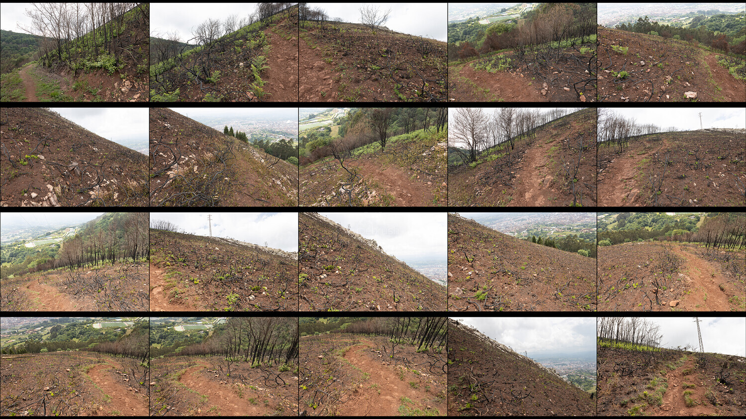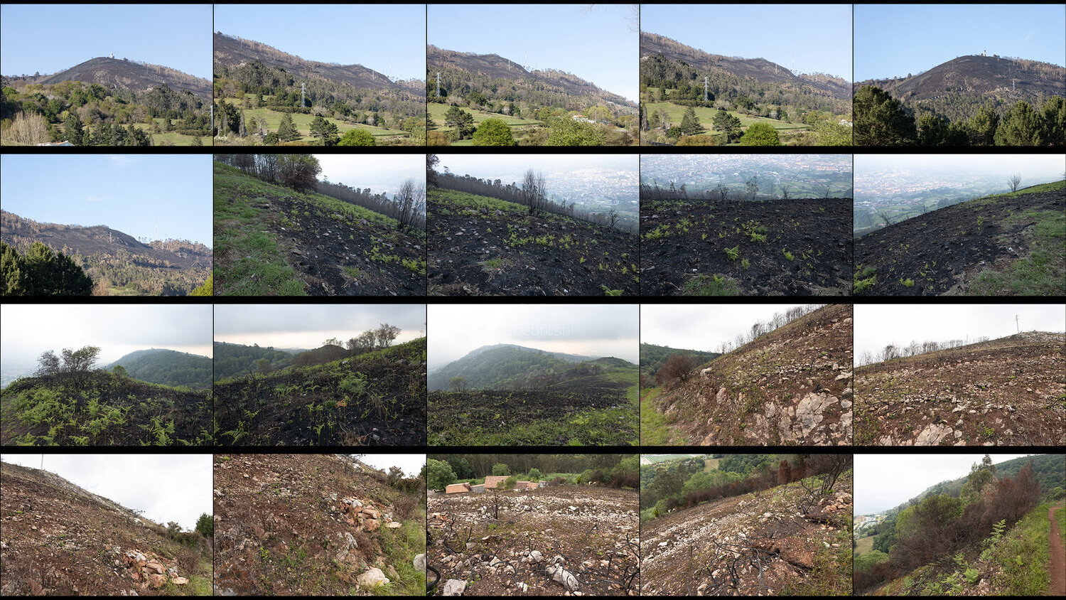 Tags: nature, scenery, view, environment, post-wildfire, hillside, regrowth, burnt forest, wildfire aftermath, scorched, fire-damaged landscape, charred trees, vegetation, erosion terrain, natural disaster, barren hillside, ash-covered ground, environmental destruction, burnt soil, recovery, mountain slope, desolate terrain, survival, dramatic landscape, dry soil, regrowing nature, grass, bushes