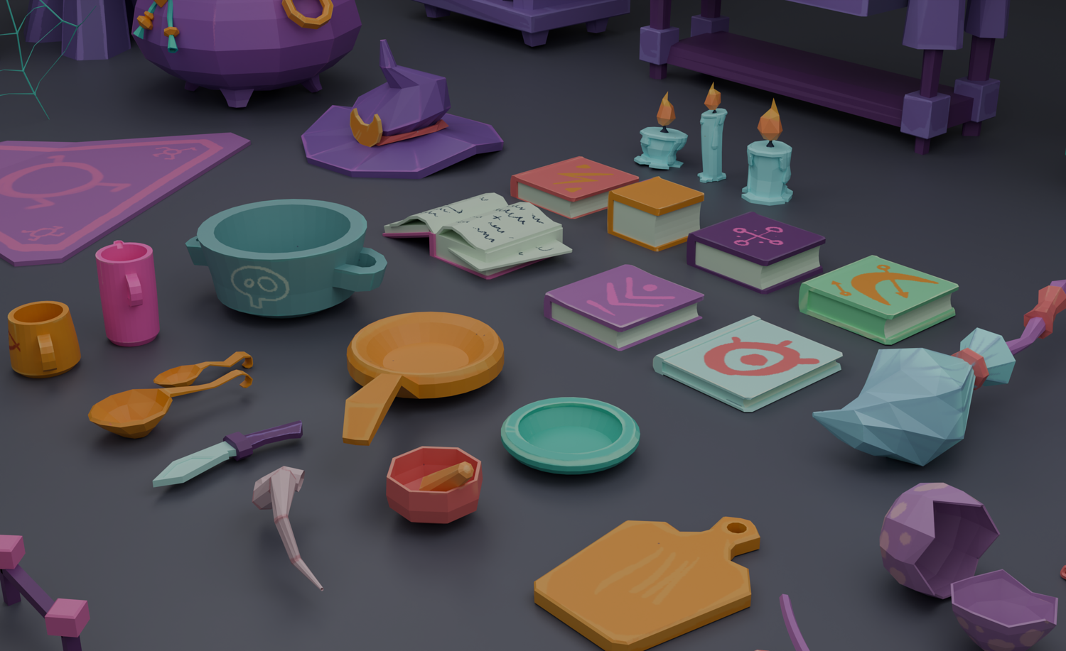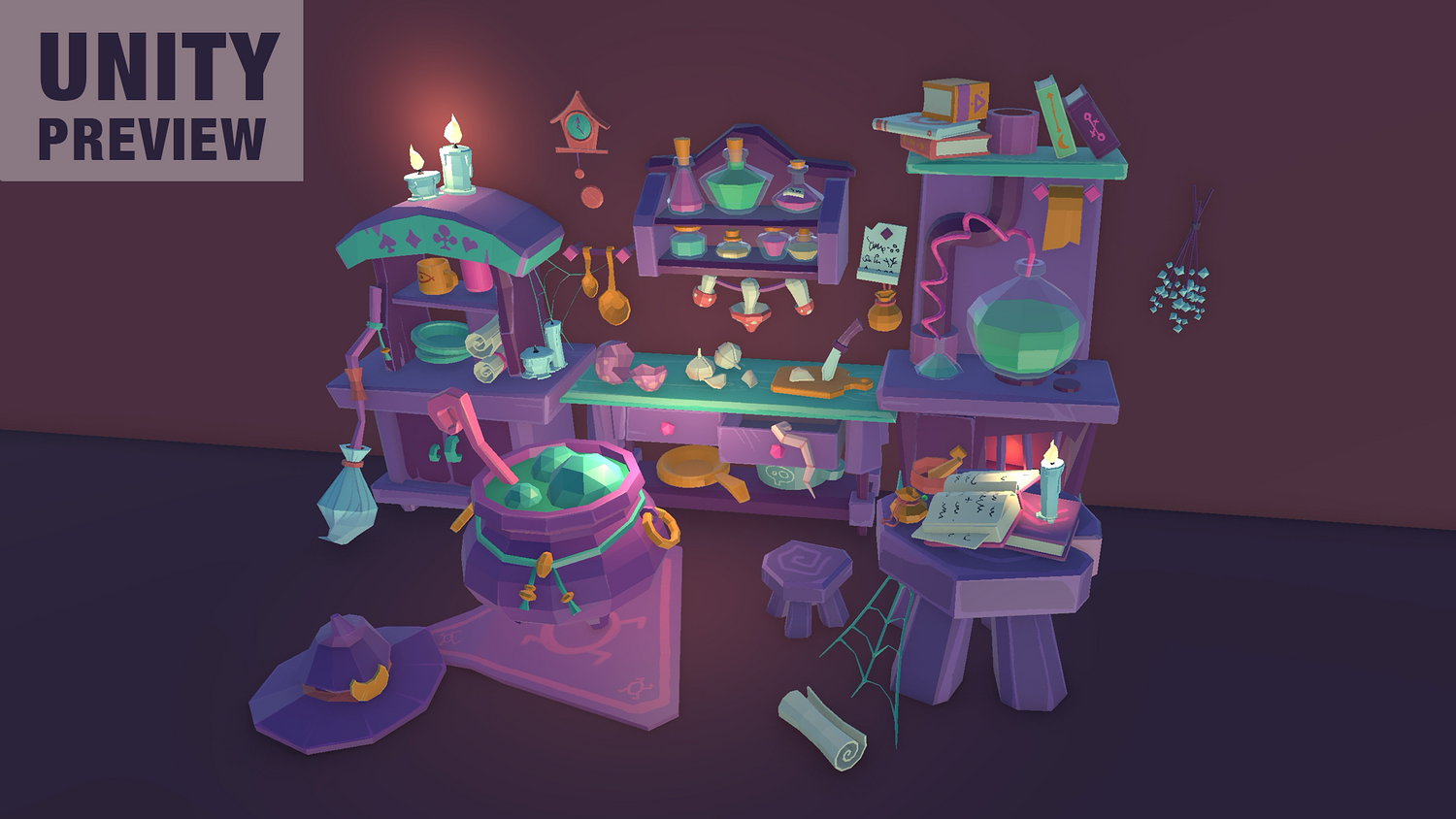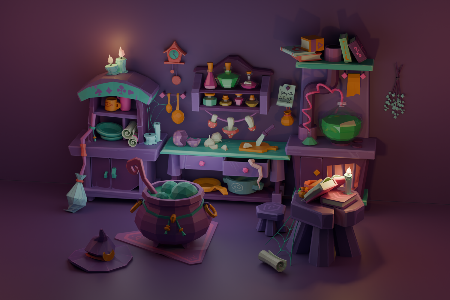 A stylized hand-painted low-poly asset pack featuring 53 witch-themed kitchen props. Perfect for cozy fantasy games, top-down adventures, or magical crafting scenes.