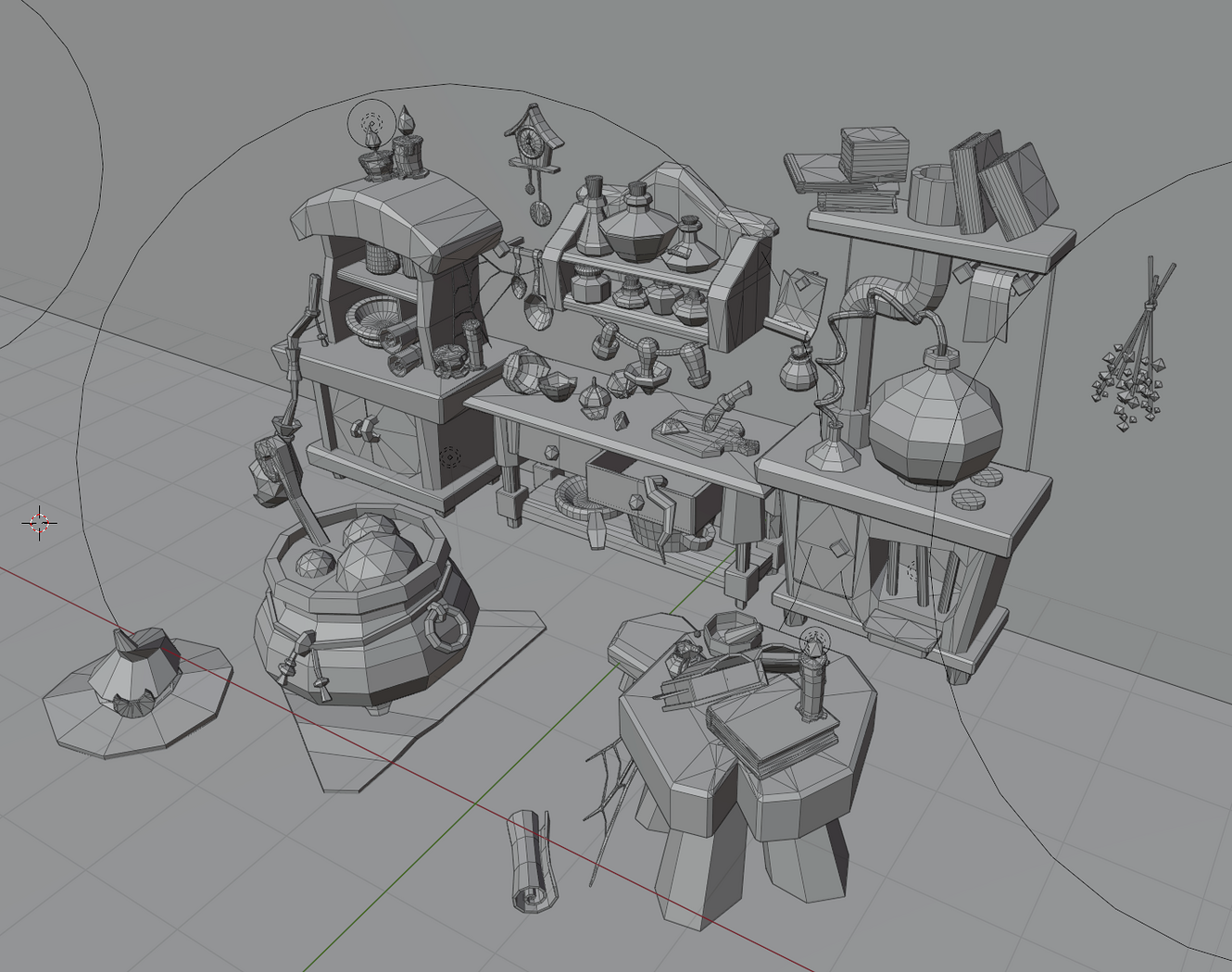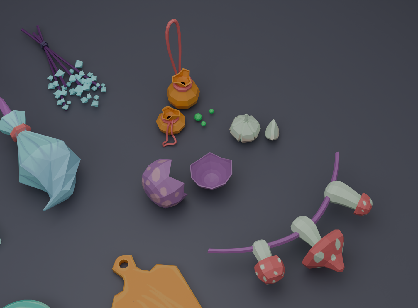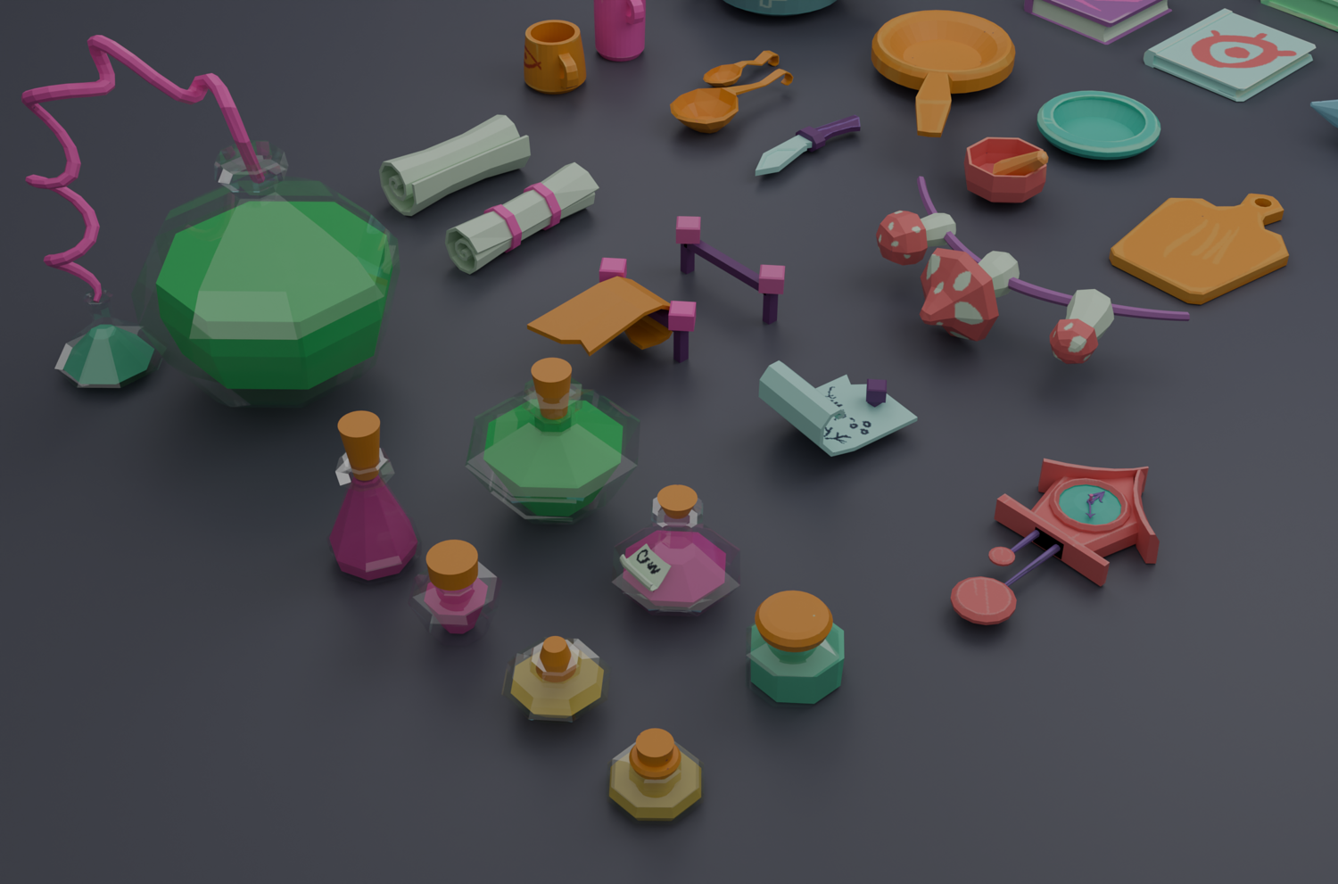 A stylized hand-painted low-poly asset pack featuring 53 witch-themed kitchen props. Perfect for cozy fantasy games, top-down adventures, or magical crafting scenes.