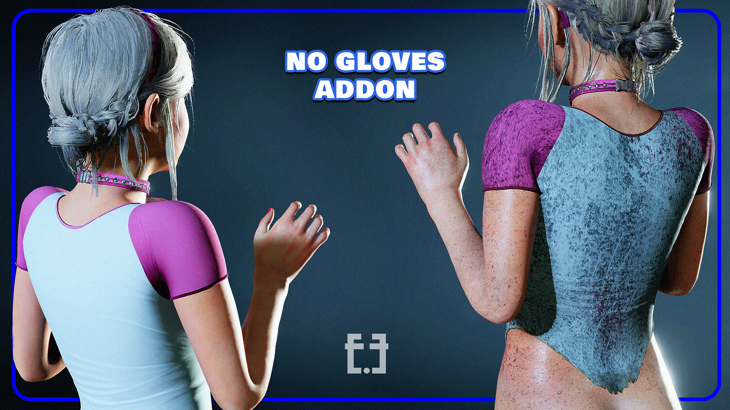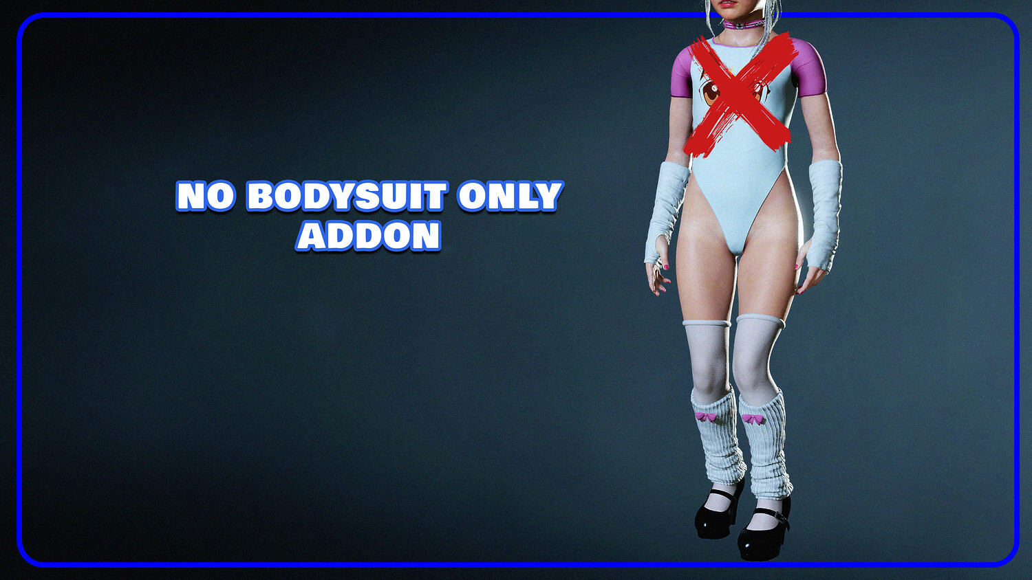 All addons are interchangeable. Bodysuit, shorts, gloves, and leg warmers can be turned on or off. They work with the "Barefoot" and "In Socks On The Floor" (I.S.O.T.F.) variations, allowing interesting combinations.