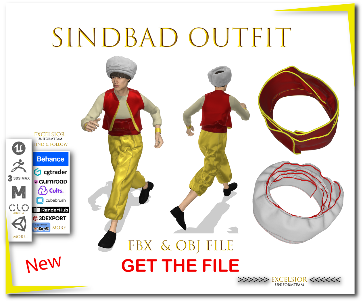 Step into the world of Arabian legends with this fully detailed 3D Sindbad Outfit, inspired by classic desert explorers and fantasy heroes. The outfit includes a short vest, loose pants, long-sleeve inner shirt, and a wrapped turban – all created with realistic fabric folds and stylized proportions for animation or concept rendering.