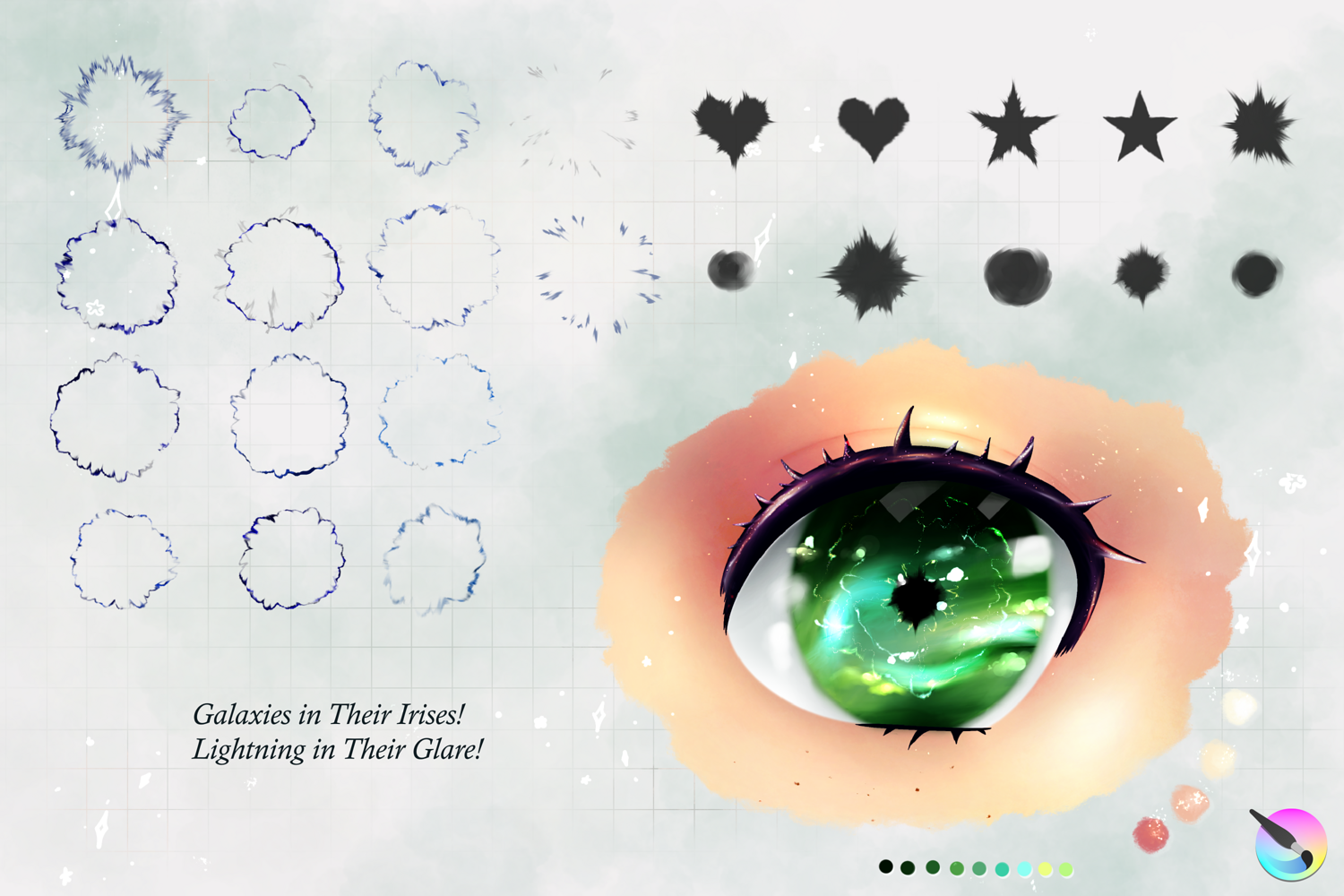 - 5 Dynamic Brushes: Add motion blur tears, sparkling highlights, and bloodshot intensity to make every glance unforgettable
