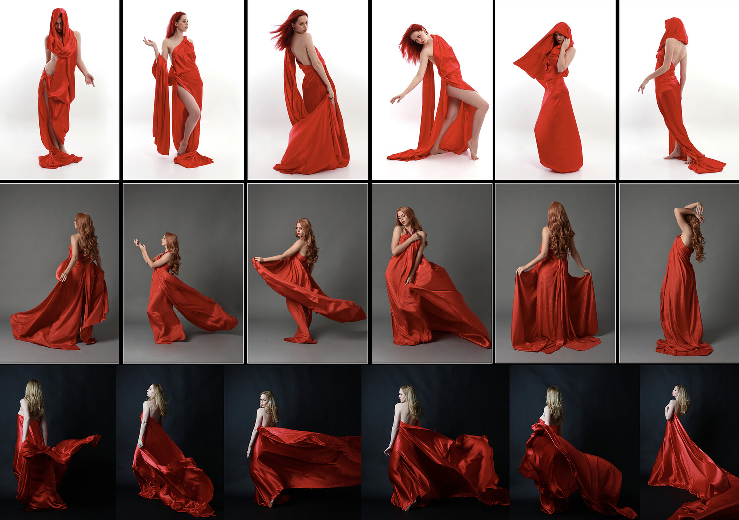 This is a collection of x191 images from five different self portrait photoshoots (from between 2011 and 2017) I utilised a red silk fabric to create interesting drapery, toga-inspired flowing garments that complement the graceful female form