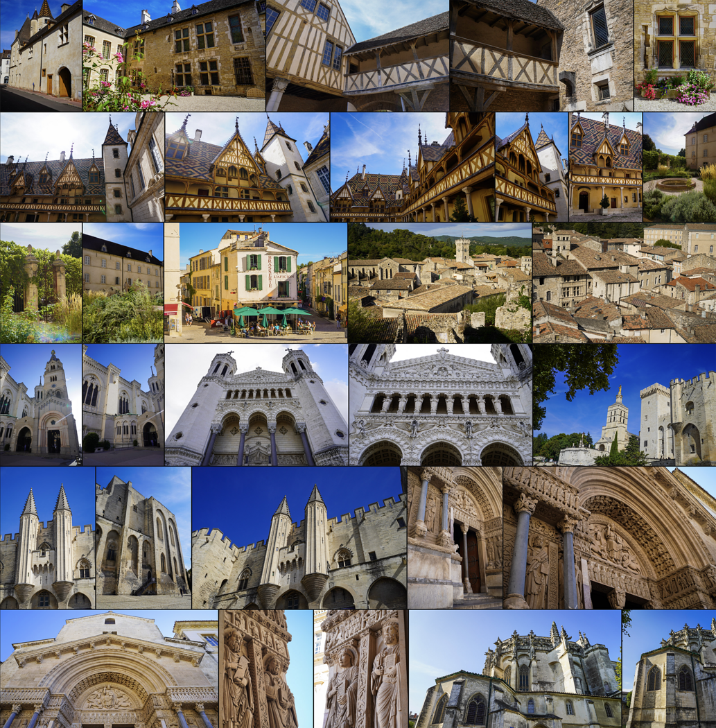 Locations included are: Palace of Versailles and the Queens Hamlet. Basilica of Lyon and ruins of ancient roman theatre. Hospices of Beaune. Vineyards of Tournon. Popes Palace of Avignon. Sénanque Abbey cloister. Arles Roman amphitheater. The towns of Viviers and Perouges. Ardeche National Park.