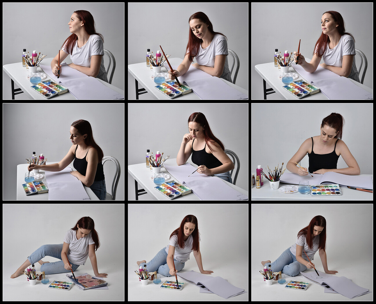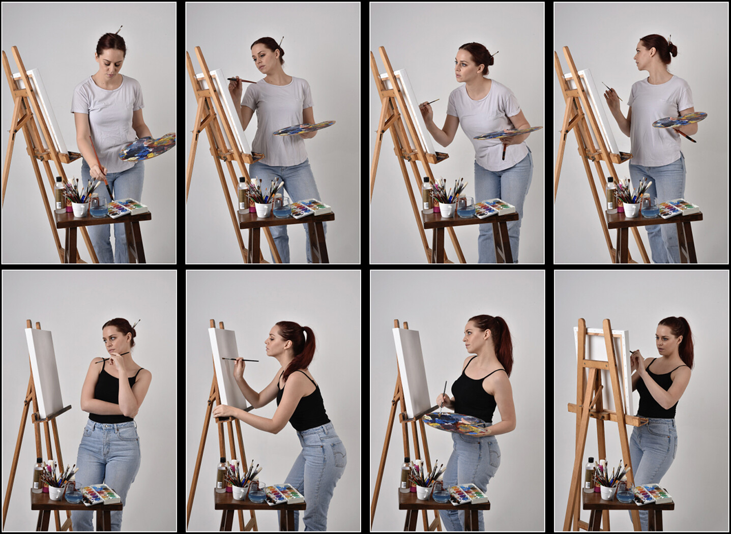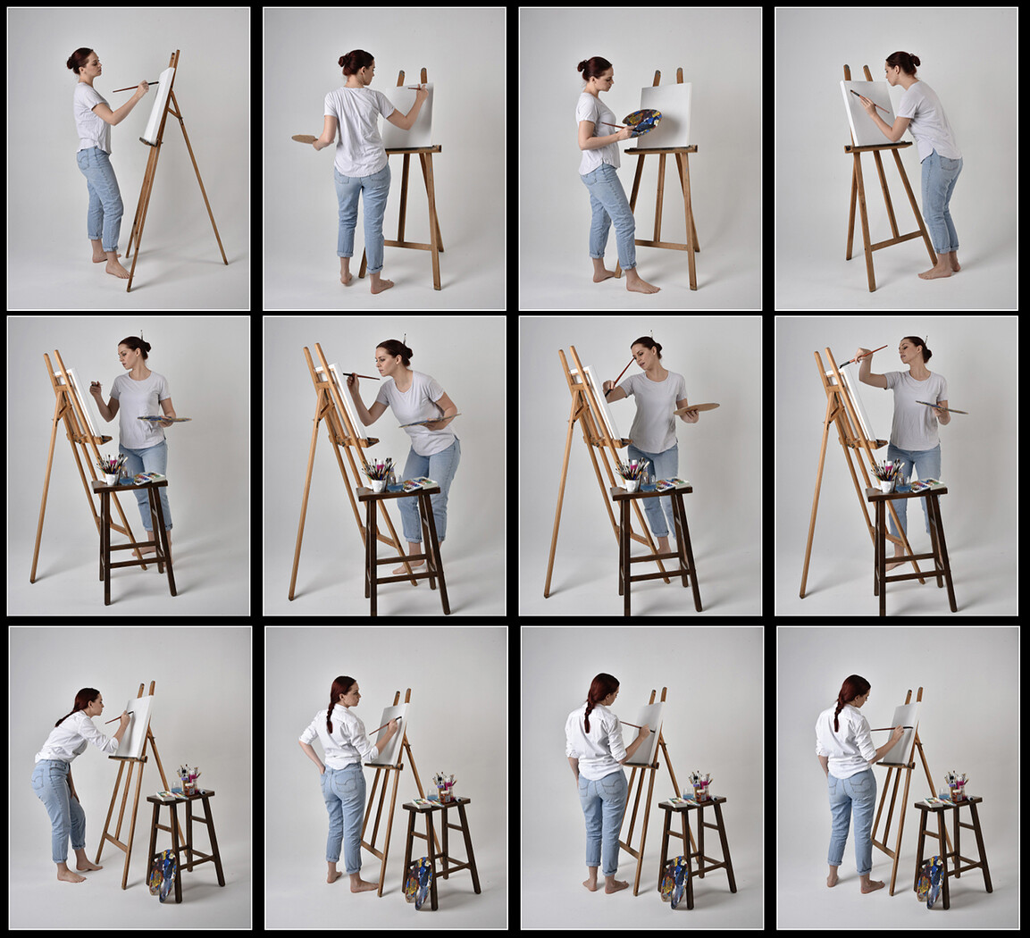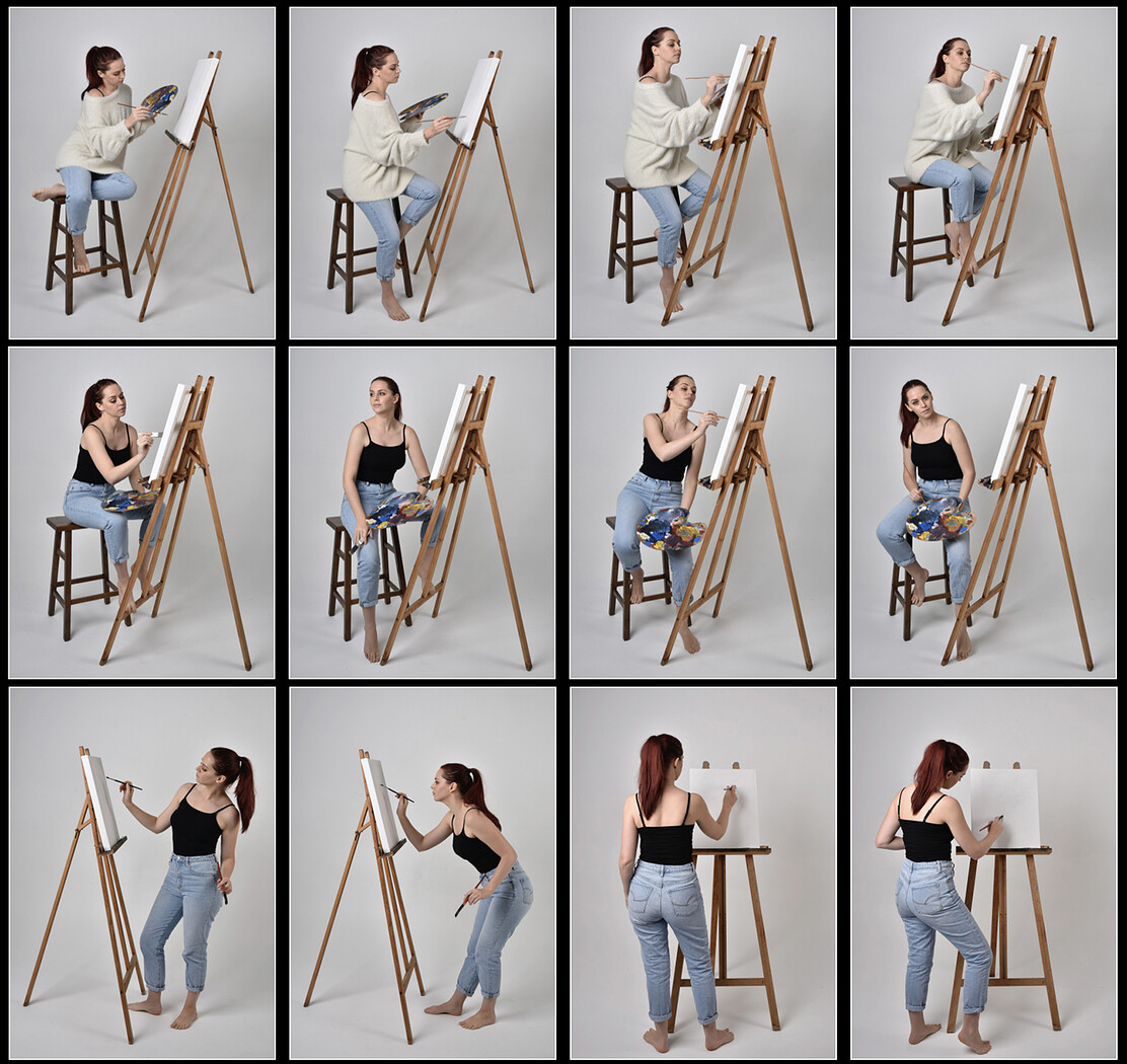 This stock pack features 170 high resolution studio portraits portraying a modern day artist. The character is styled as a contemporary painter, working with canvas, easel, brushes, and paints. A range of casual, everyday outfits including simple shirts and jeans gives the series a natural, relatable tone.