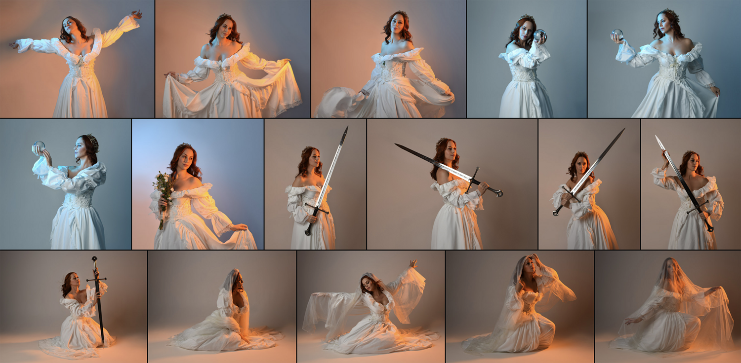 This stock pack features x155 stock portraits of a romantic fairytale character photographed in a white studio, wearing a flowing white princess gown. Soft, luminous lighting and a pale backdrop create an airy, dreamlike atmosphere, while subtle shifts in light position introduce a wide range of directional shadows throughout the series.