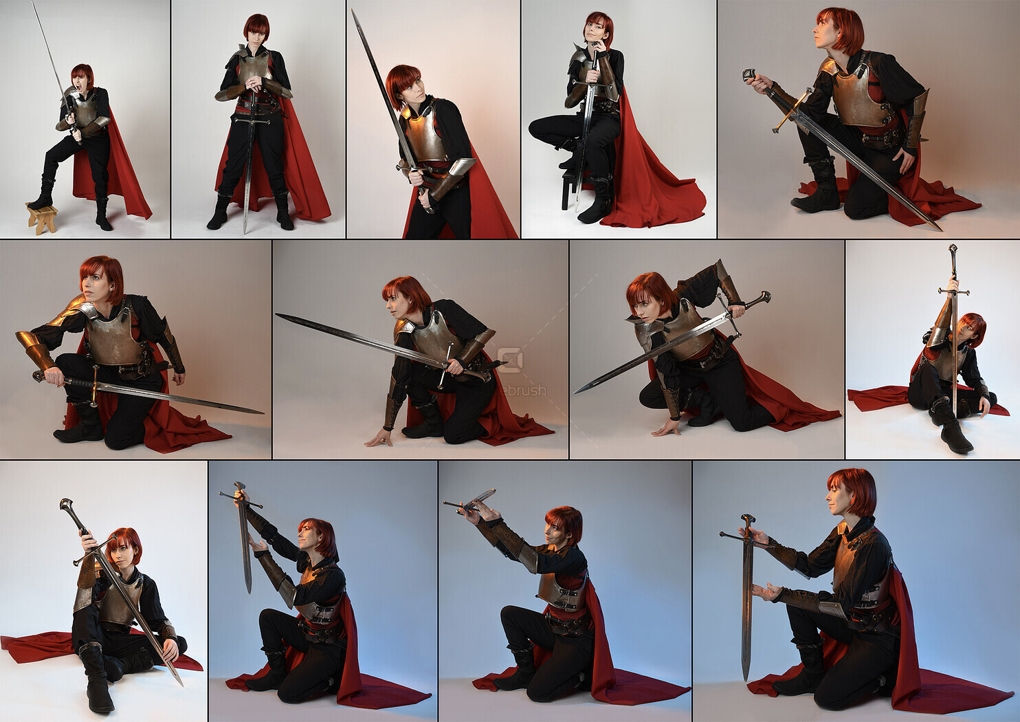 Each image features the model wielding a sword in a wide range of action and dramatic poses, set against diverse studio backgrounds— dark black silhouettes, classic white, and golden cinematic lighting reminiscent of a sunset or fire. Perfect for bringing medieval and fantasy warrior characters to life, this pack offers dynamic reference material for artists, illustrators, book cover designers, and creatives seeking bold, heroic imagery.