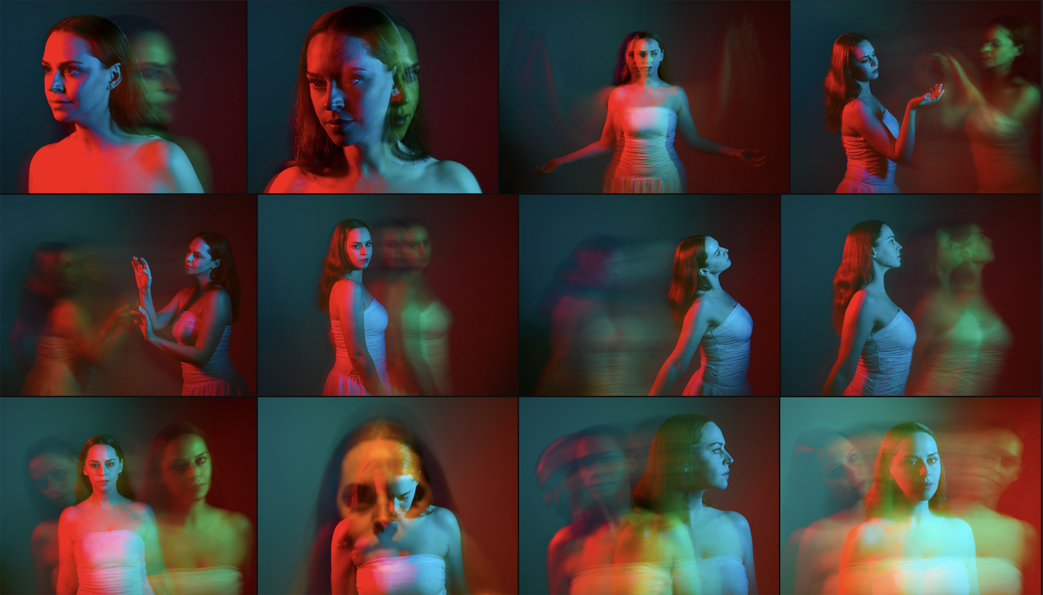 Some portraits are softly backlit with glowing edges, others are lit from above or illuminated from below, creating bold shadows and striking colour contrasts.The pack also includes 20 experimental portraits using slow shutter speeds and neon lighting, creating motion blur, layered figures and abstract movement effects. The lighting variations give artists a wide range of reference for studying form, gesture and dramatic colour interaction on the figure.