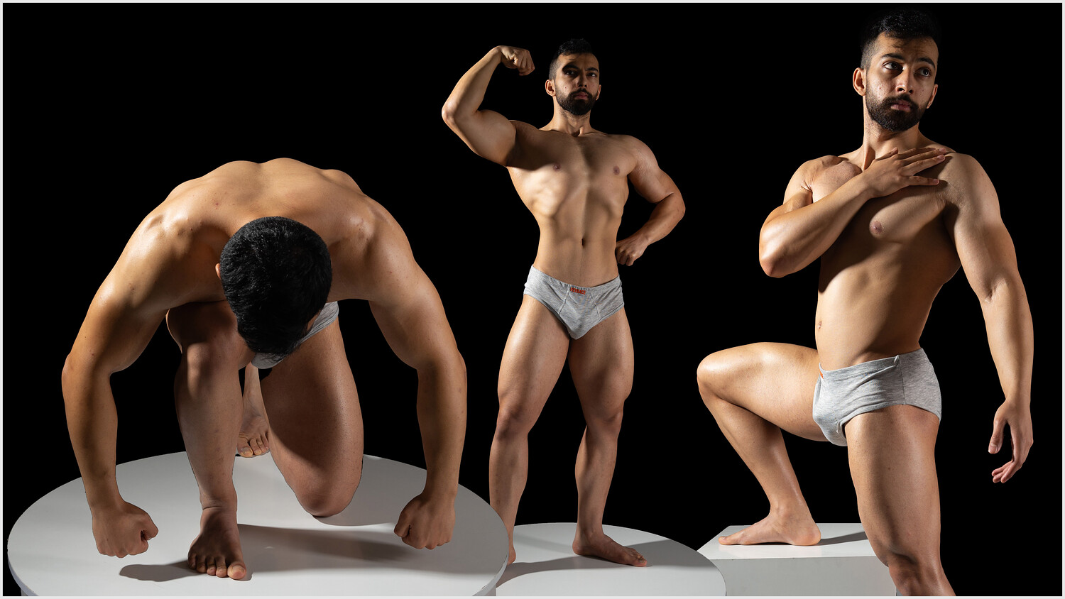 This male photo reference pack captures a muscular model in a collection of sculptural and dynamic poses, inspired by classical art and heroic statues. Each image is carefully lit to emphasize form, anatomy, and dramatic gesture, making it ideal for artists who study the human body in motion and stillness.