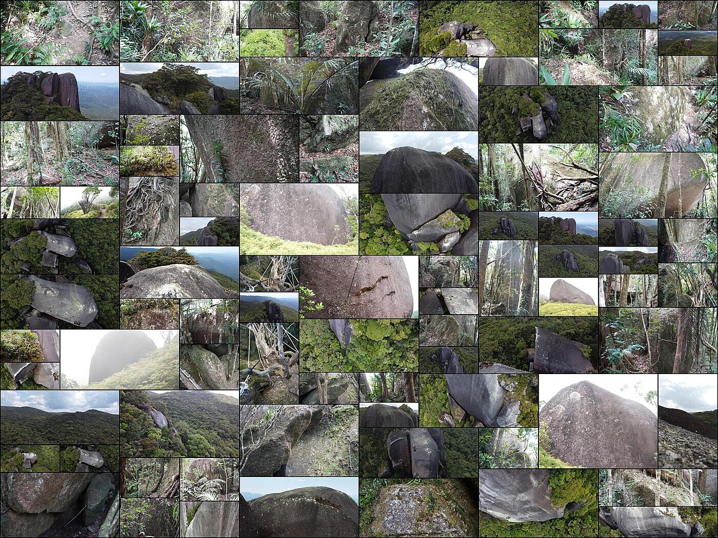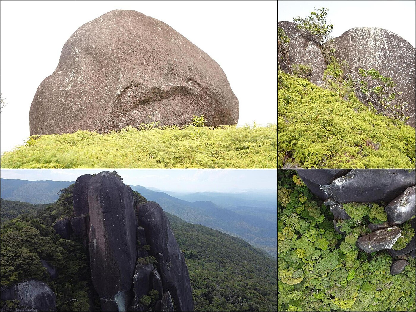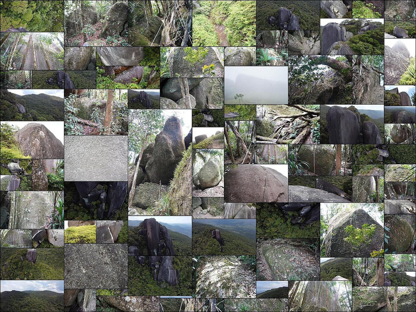 About 200-meter tall granite solid rock formation. It includes photos of the nearby tropical forest and some of the boulders that were scattered along the path.