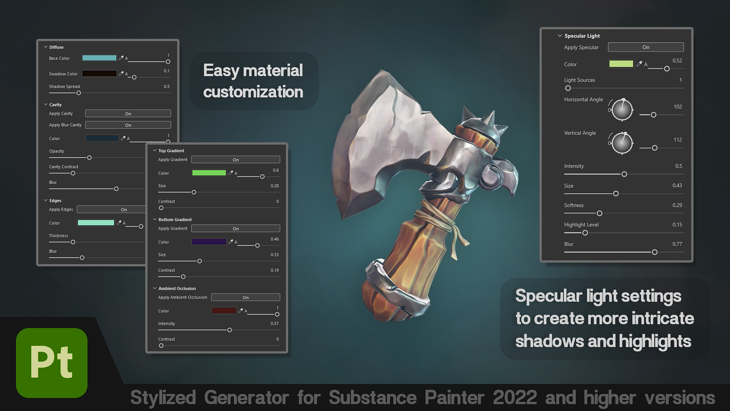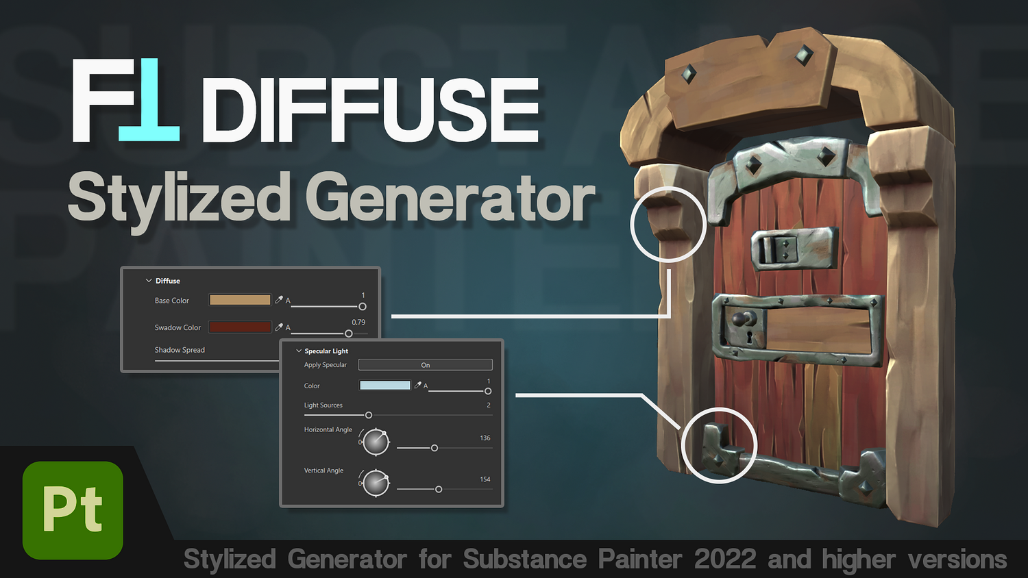 FT Diffuse is a stylized texture generator for Substance Painter 2022 and above! Now you can create stylized textures much faster and easier. This generator is perfect for creating a voluminous stylized base for PBR and Hand Painted texturing. Create volumetric stylized textures for environments, props, and characters much faster with FT Diffuse!