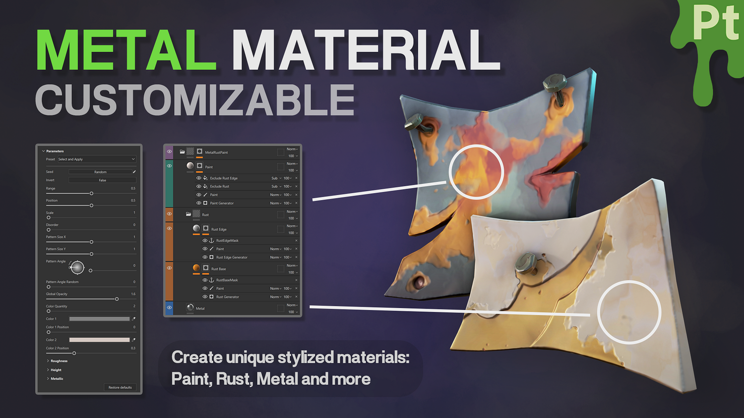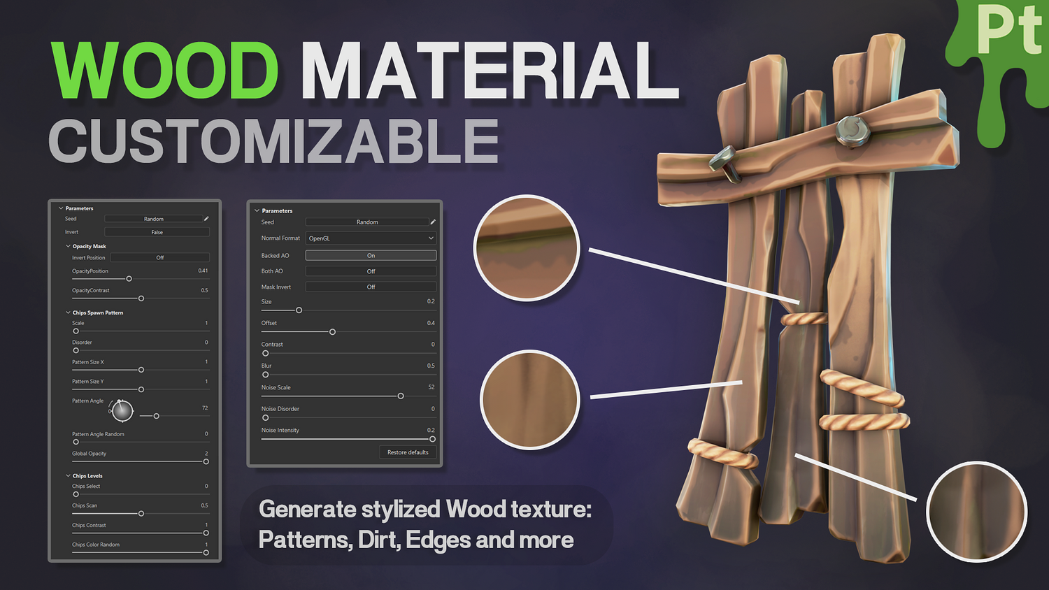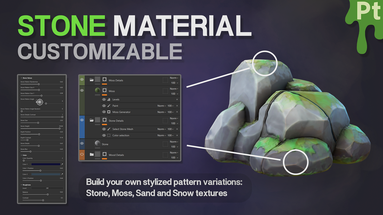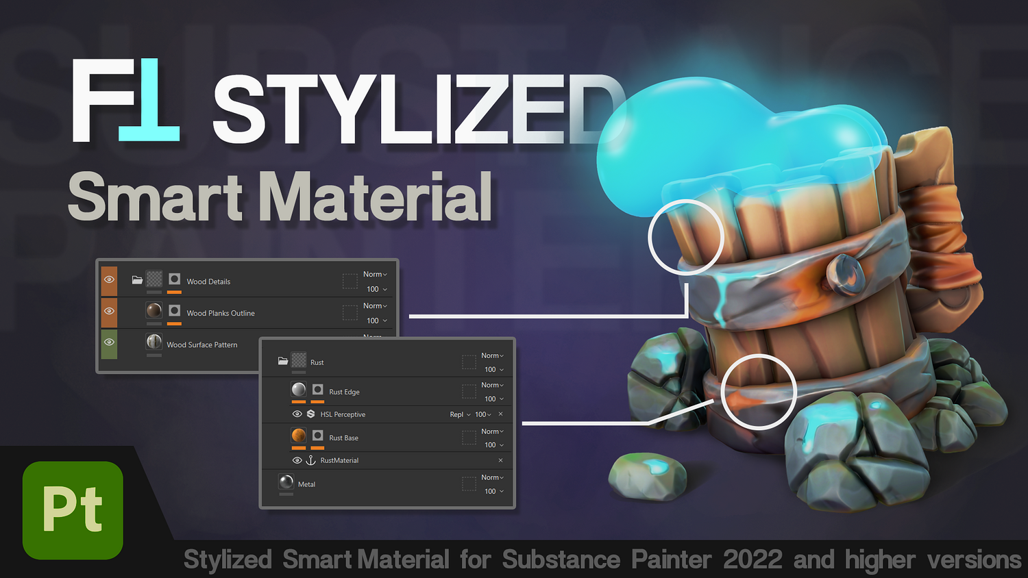 FT Smart Material is a stylized smart material designed for Substance Painter 2022 and later versions! This material allows you to create artistic, stylized textures. The material's logic is based on pattern generation and shade blending, offering numerous flexible settings to create textures for Wood, Metal, Stone, Moss, and more!
