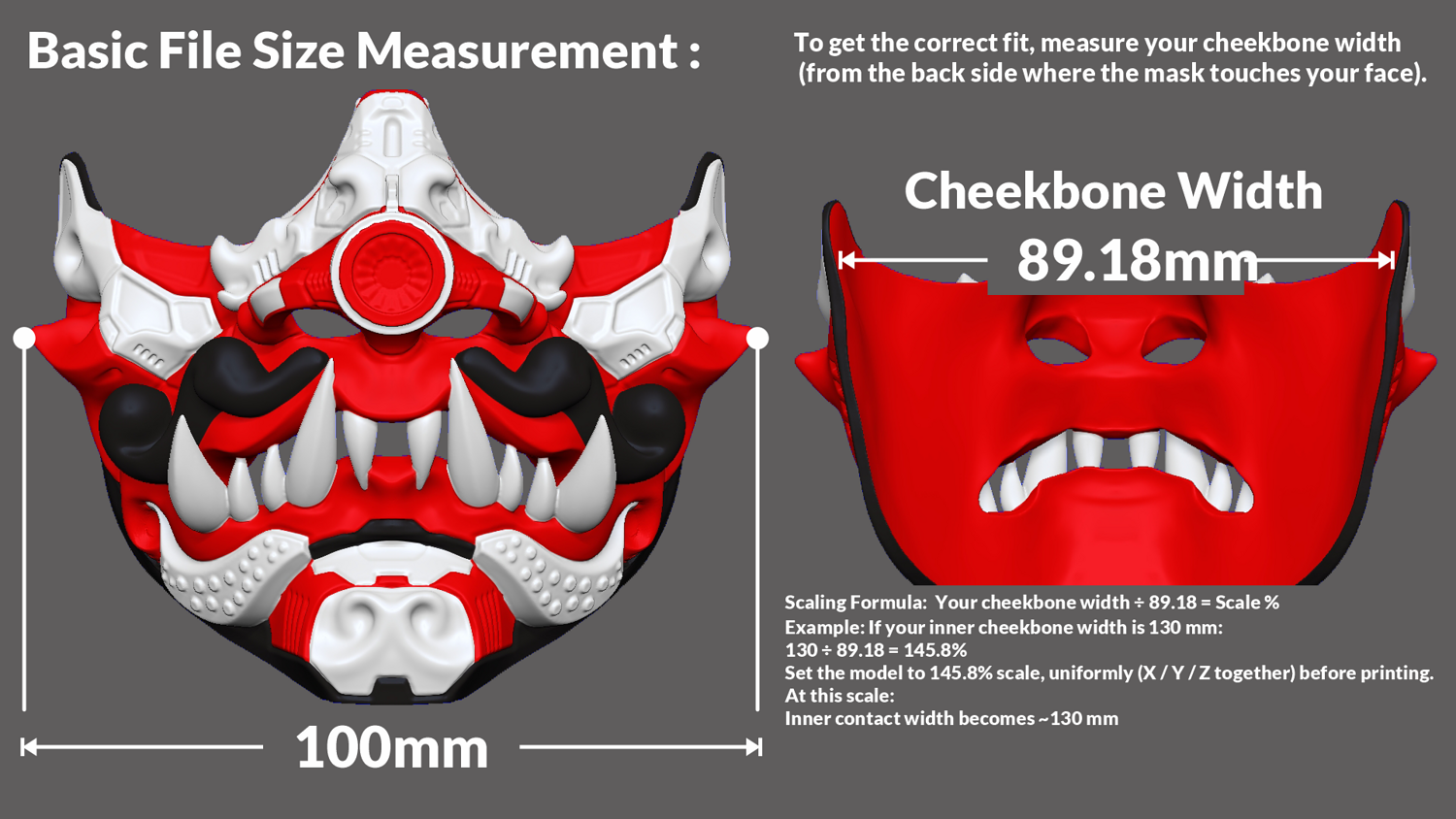 Measure your cheekbone width and scale uniformly using the included guide for proper fit.