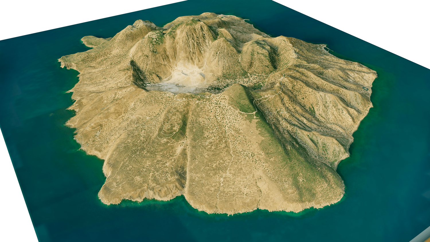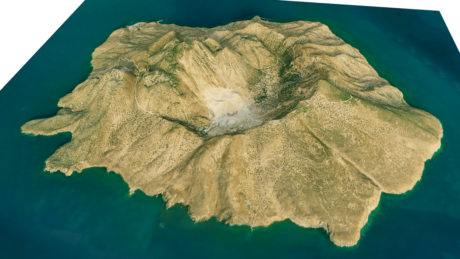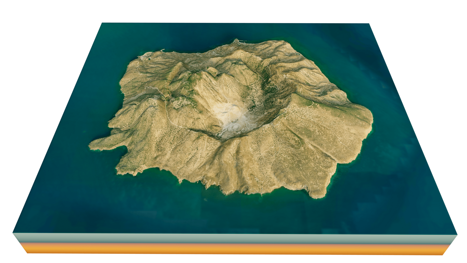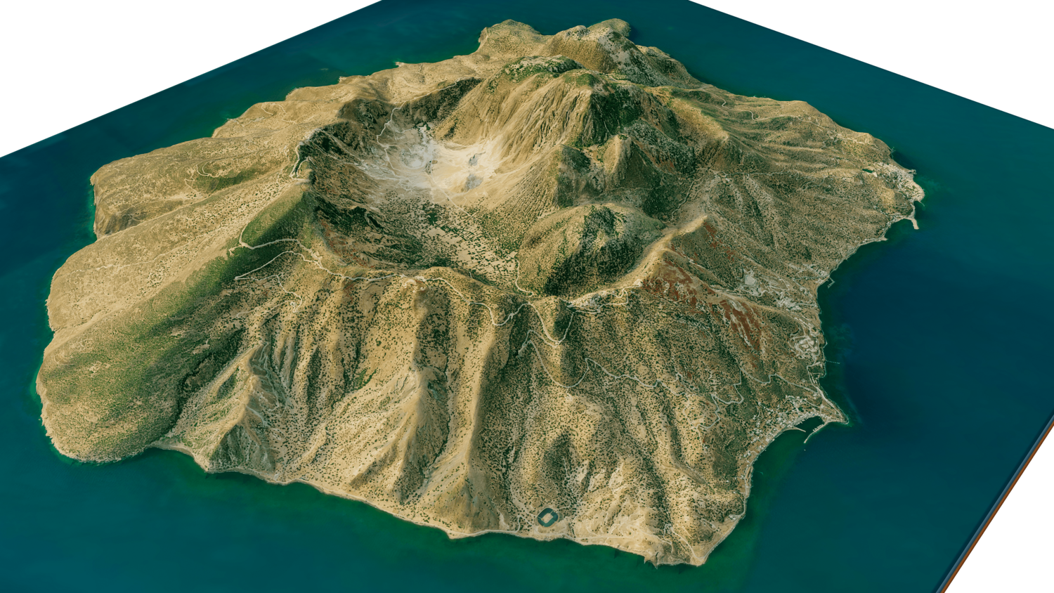 Nisyros Island 3D model terrain. 3d model island of Nisiros, Greece with its landscape of mountains, beaches and forests.
