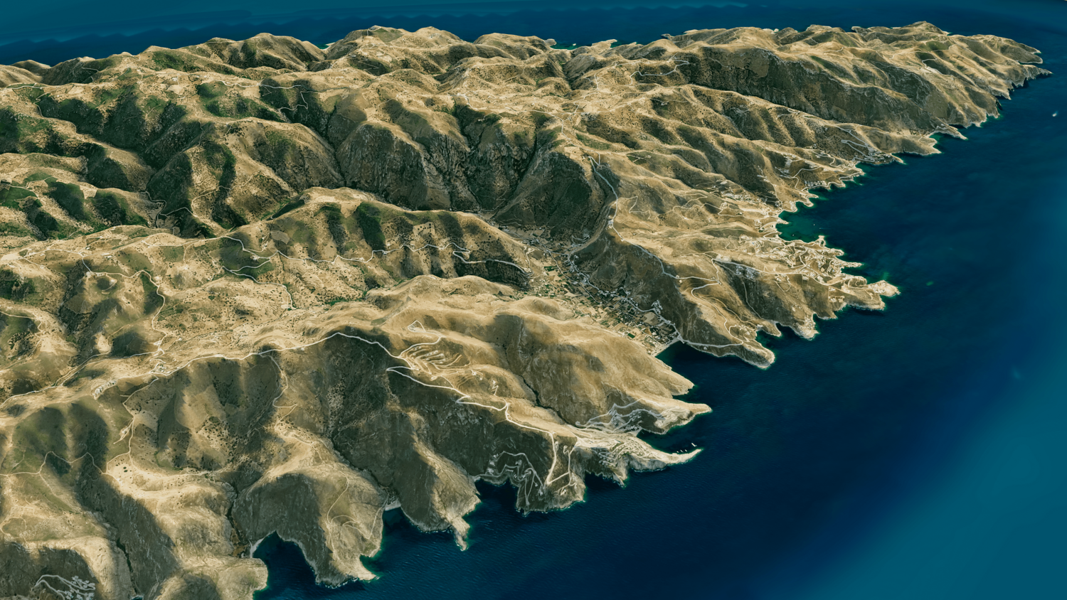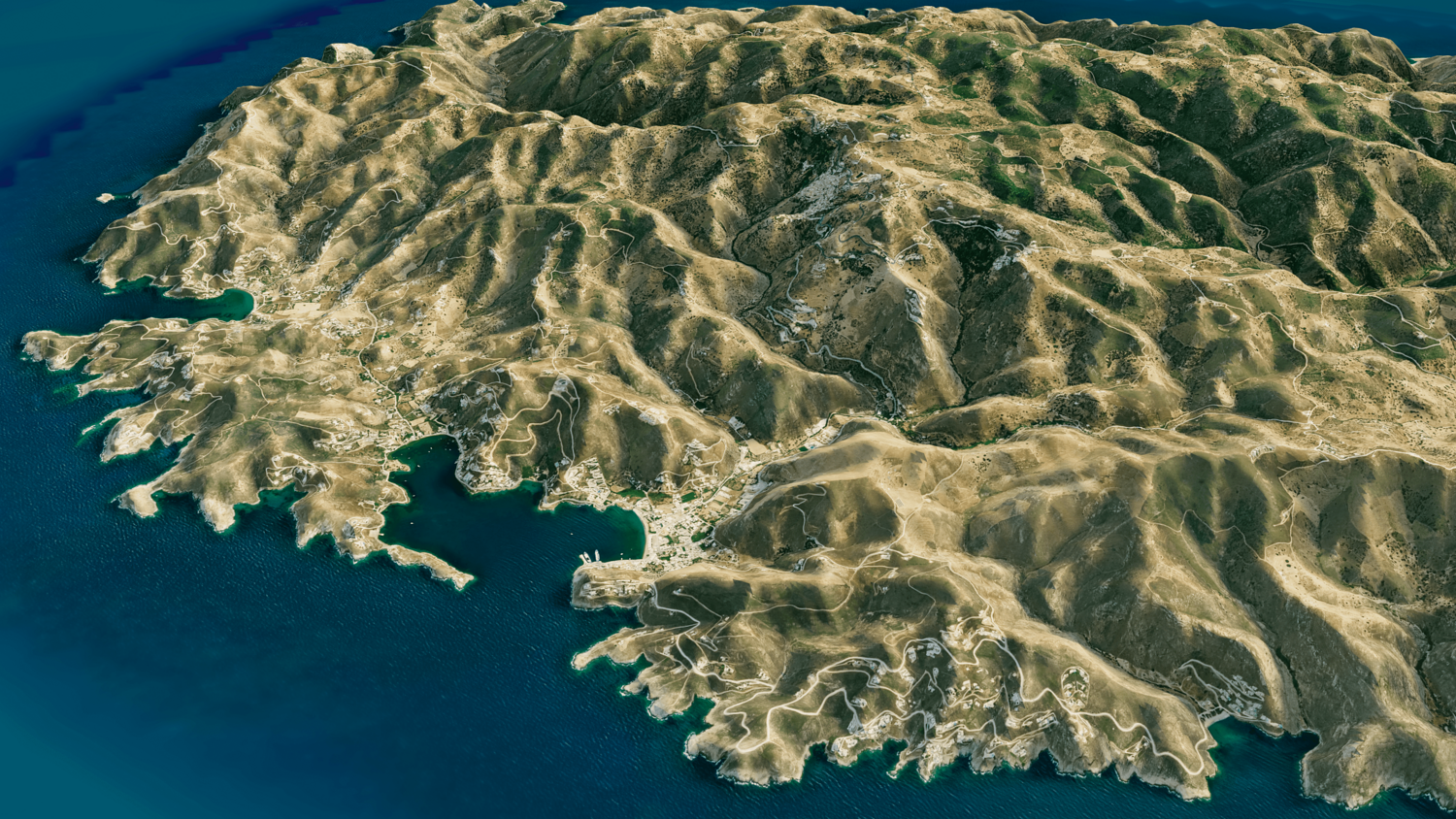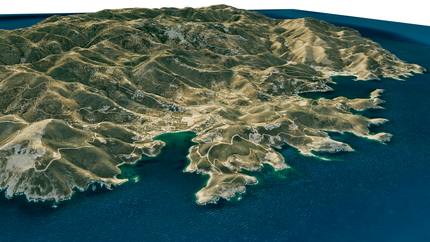 Kea Island 3D model terrain. 3d model island of Kea, Greece with its landscape of mountains, beaches and forests.