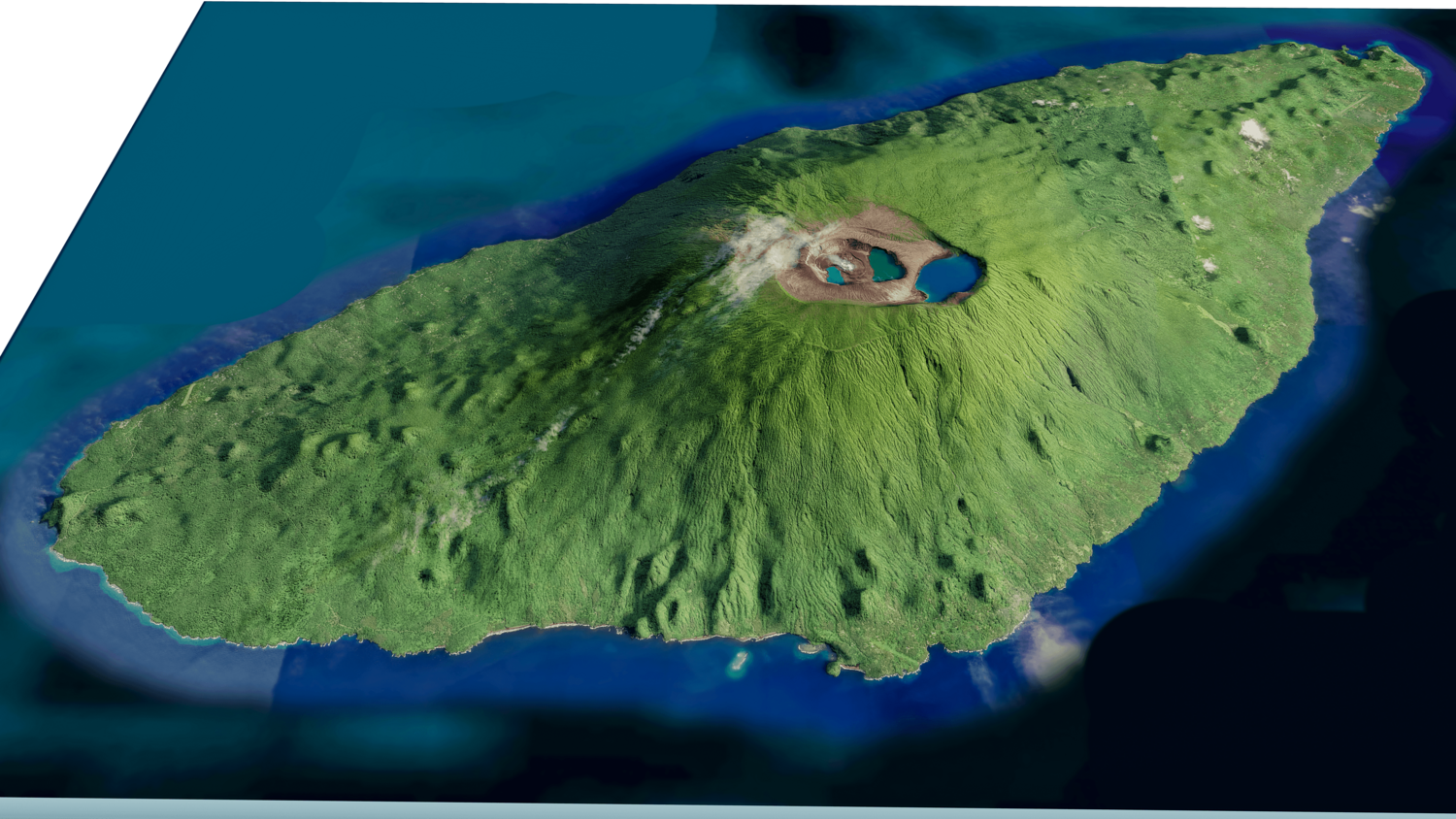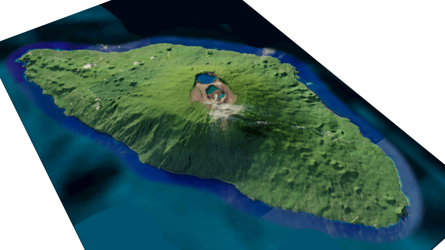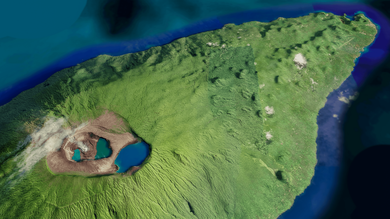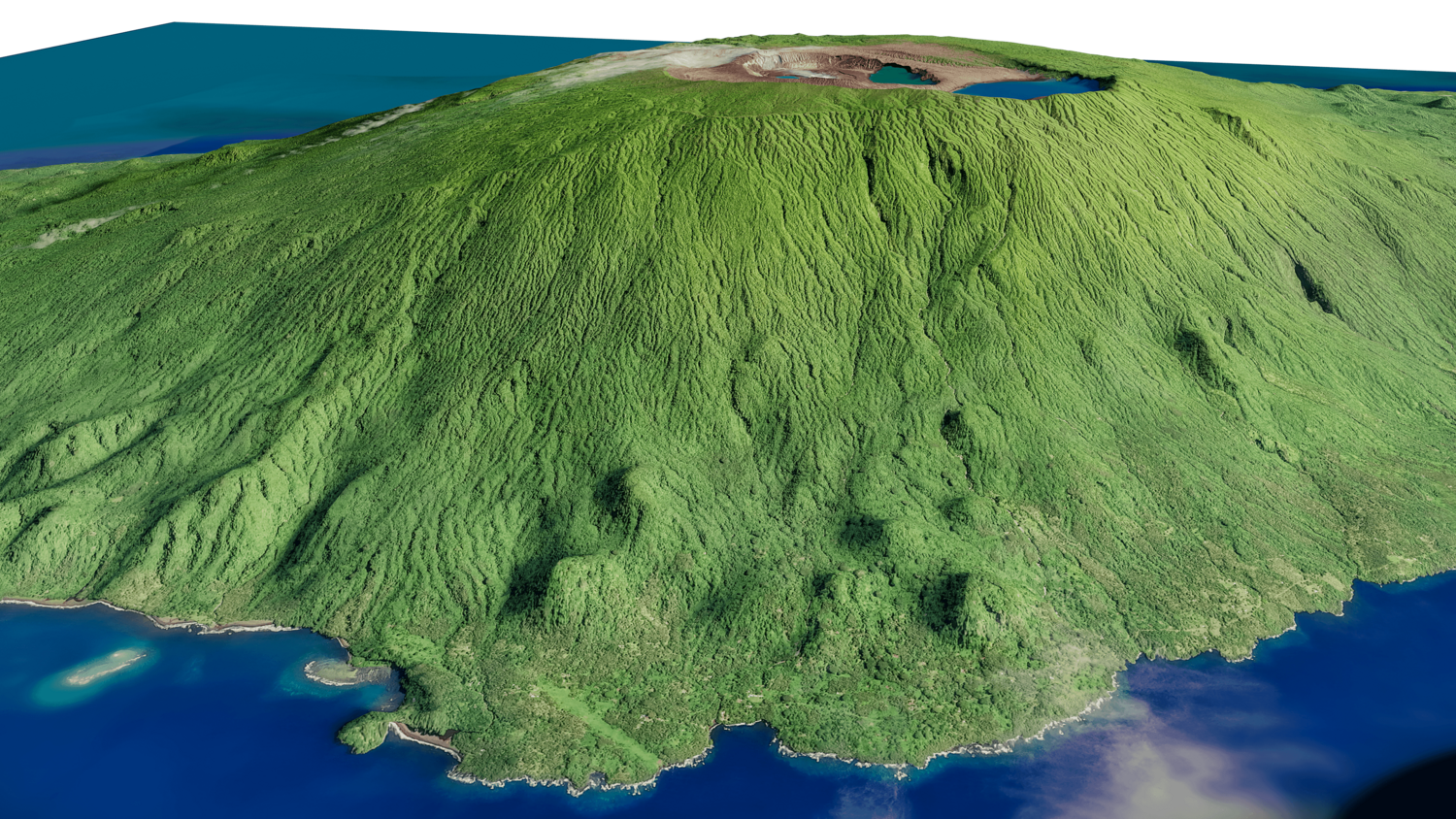 Ambae volcanic island 3D model terrain. 3d model island of Ambae, Vanuatu with its landscape of creater, beaches and forests.
