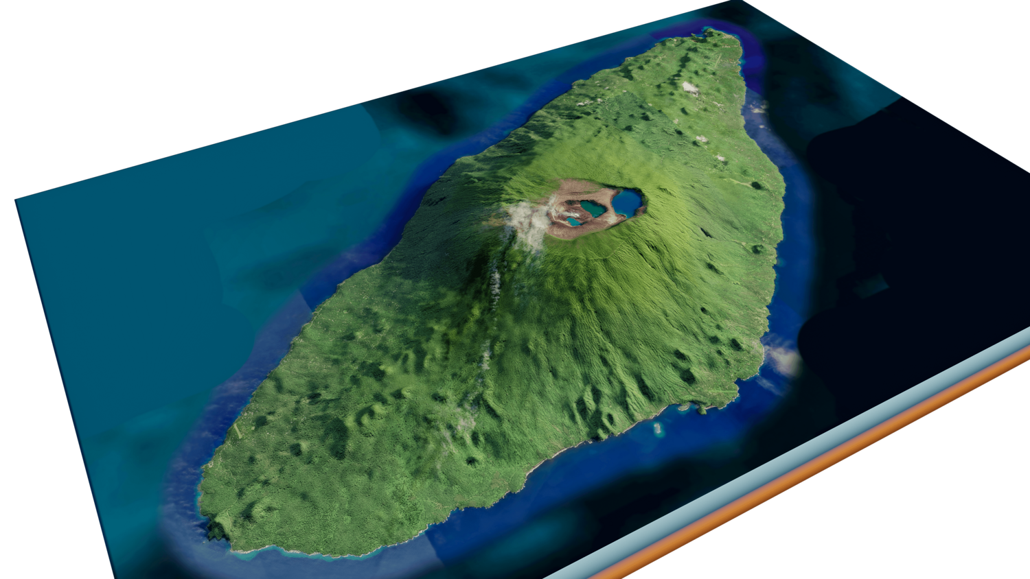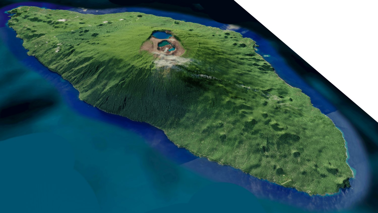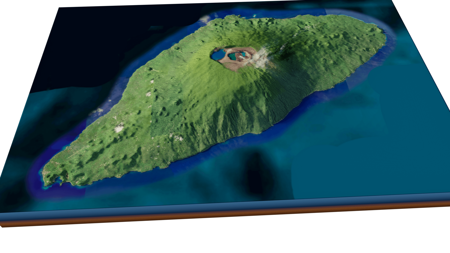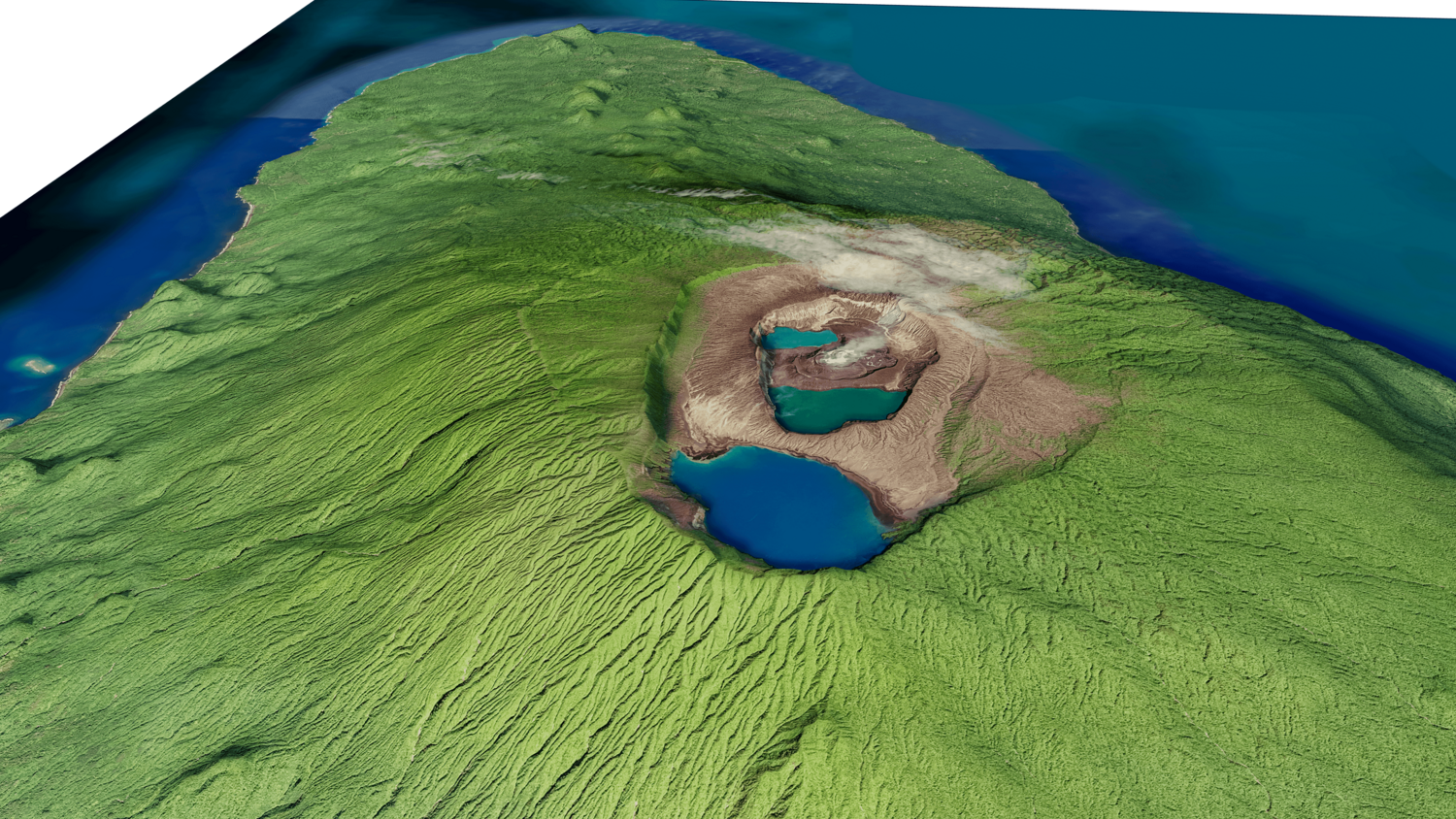 Ambae volcanic island 3D model terrain. 3d model island of Ambae, Vanuatu with its landscape of creater, beaches and forests.