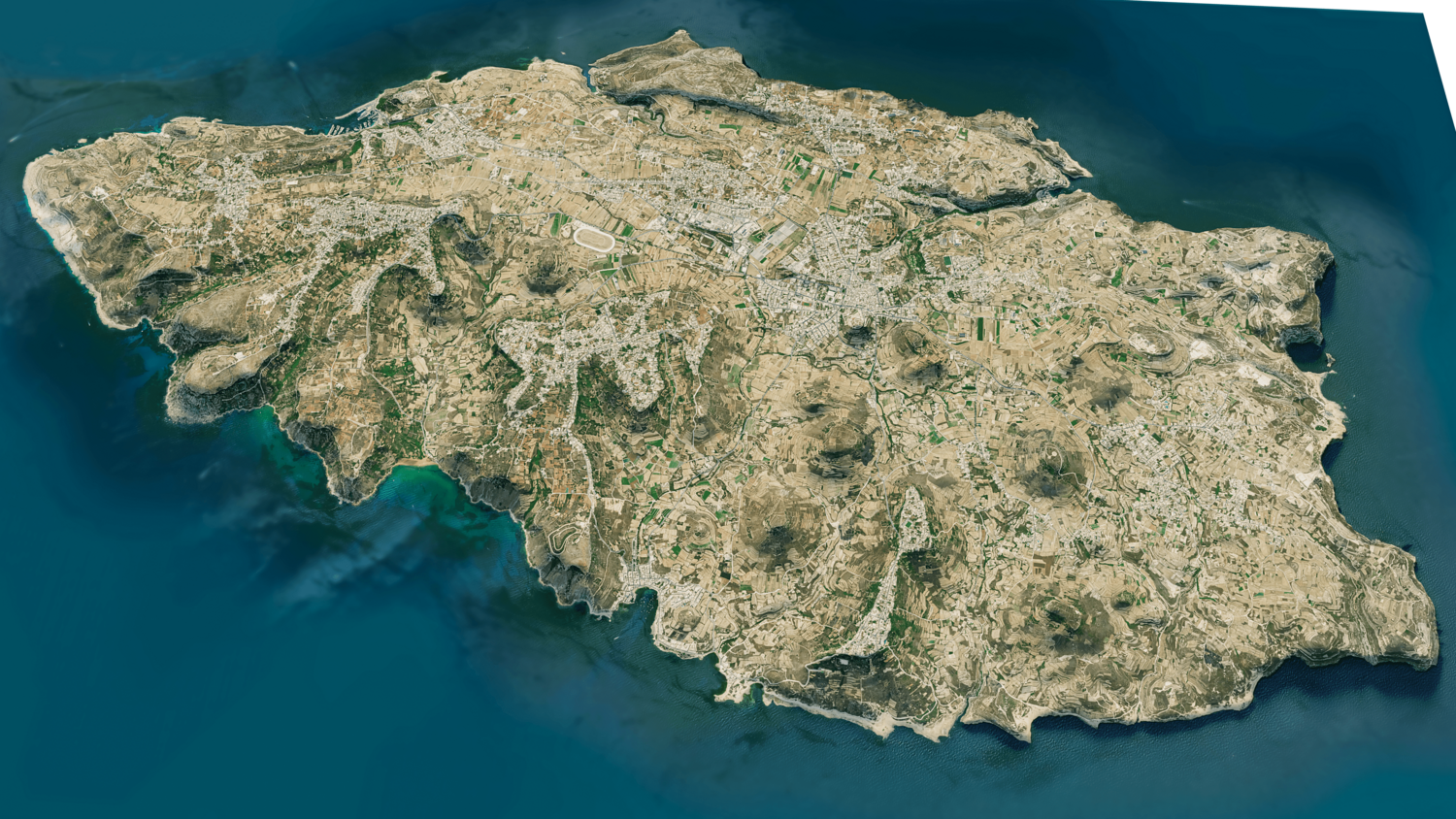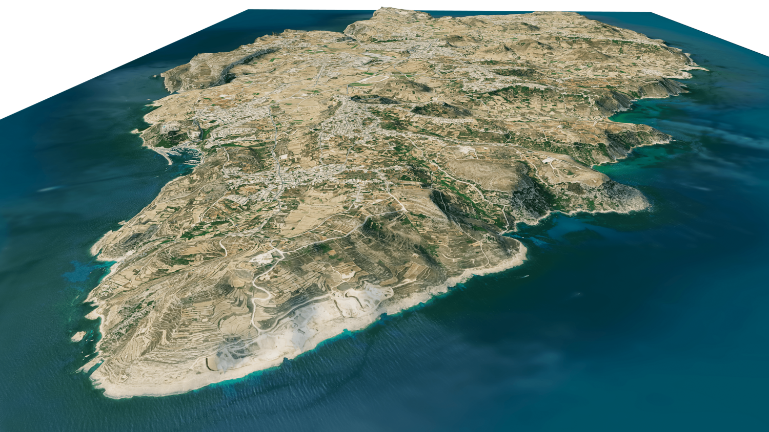 Gozo Island 3D model terrain. 3d model island of Gozo, Malta with its landscape of mountains, beaches and forests.
