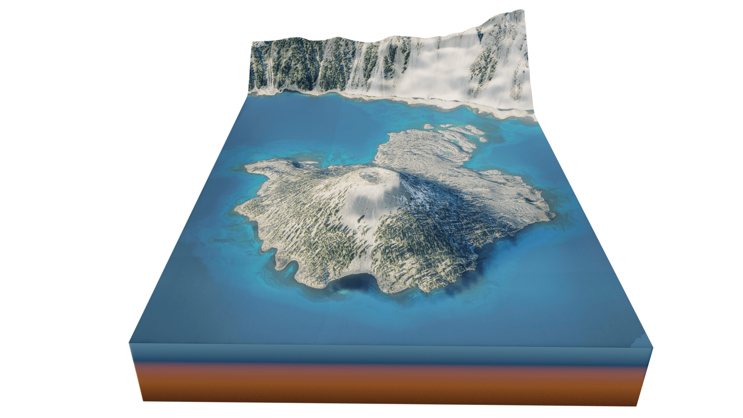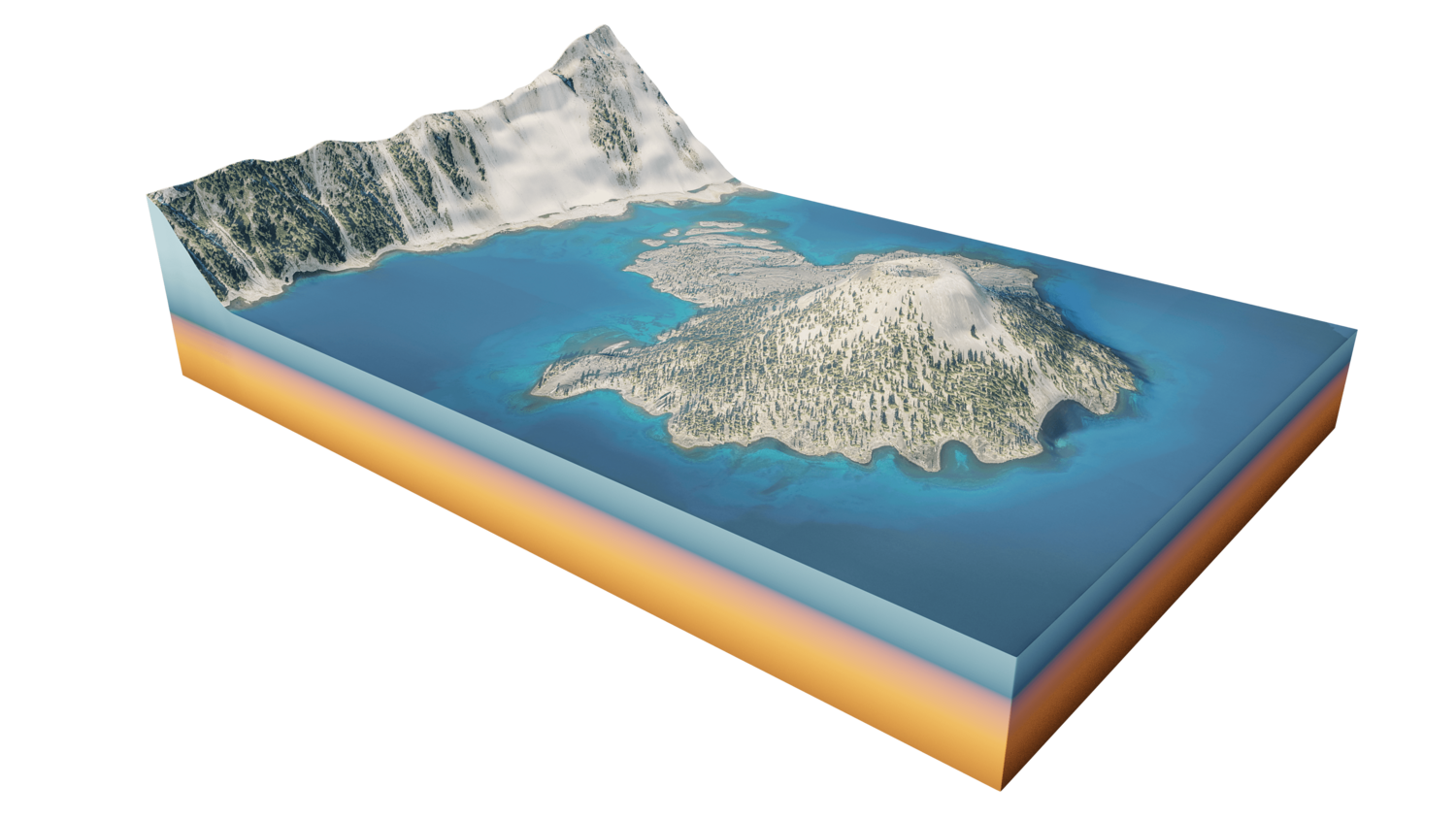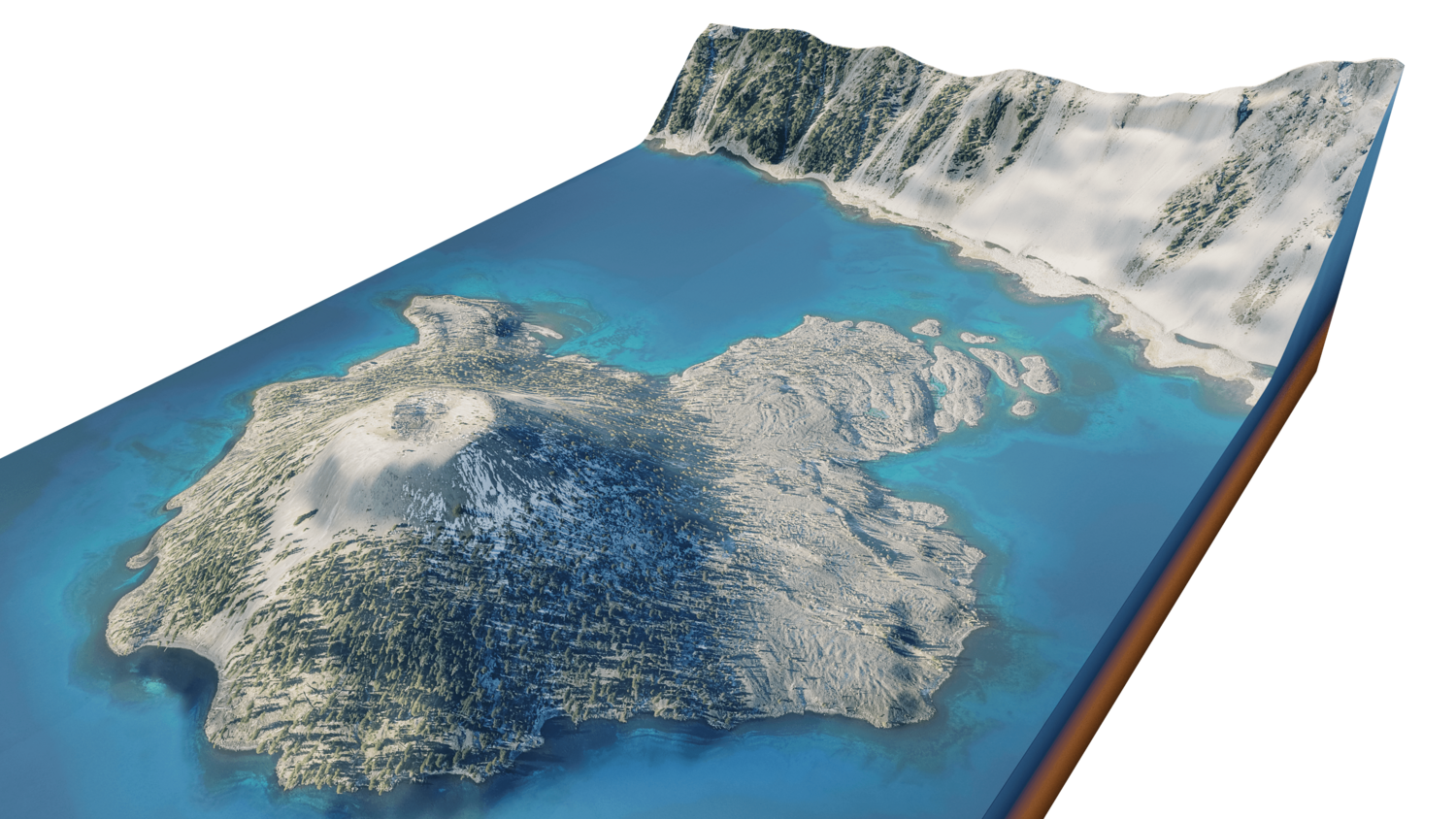 Wizard Island 3D model terrain. 3d model island of Wizard, Crater Lake and with its landscape of mountains, beaches and forests.