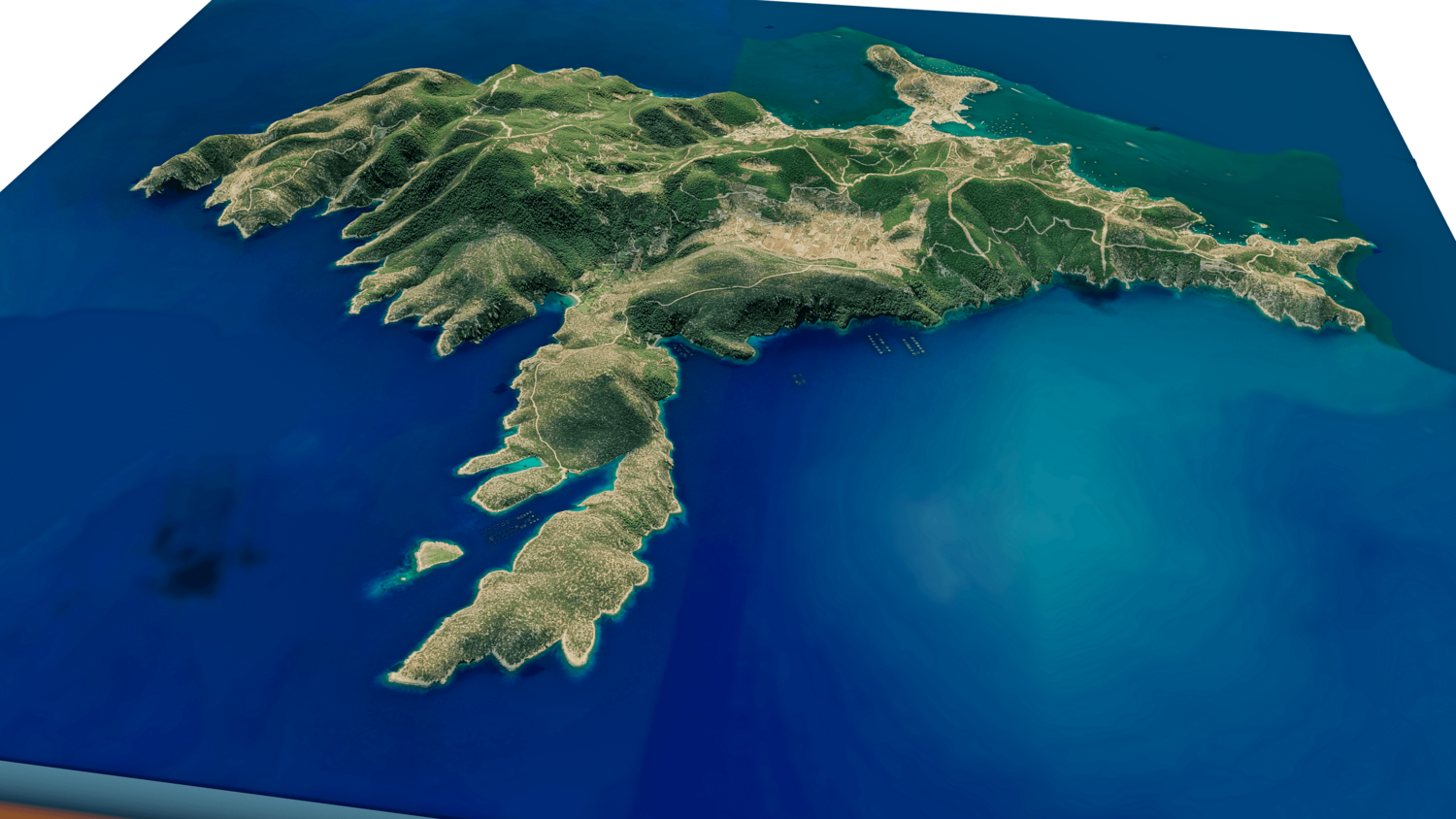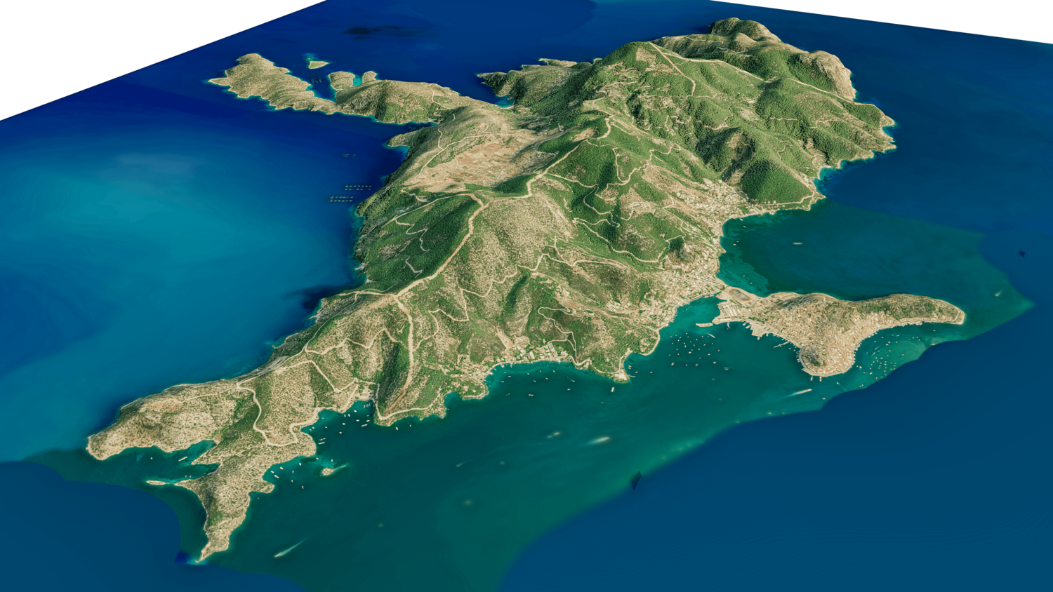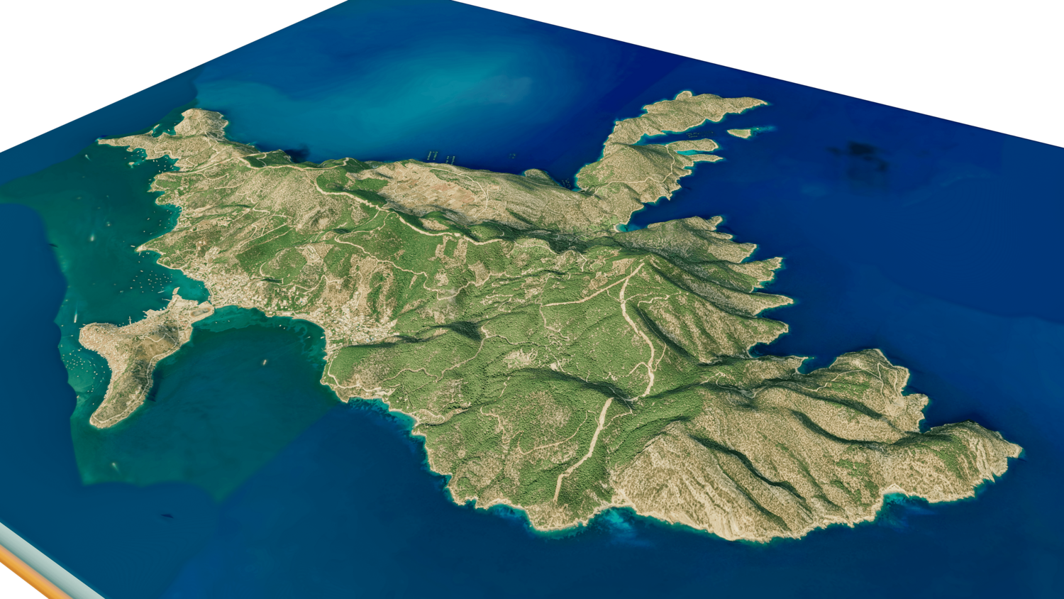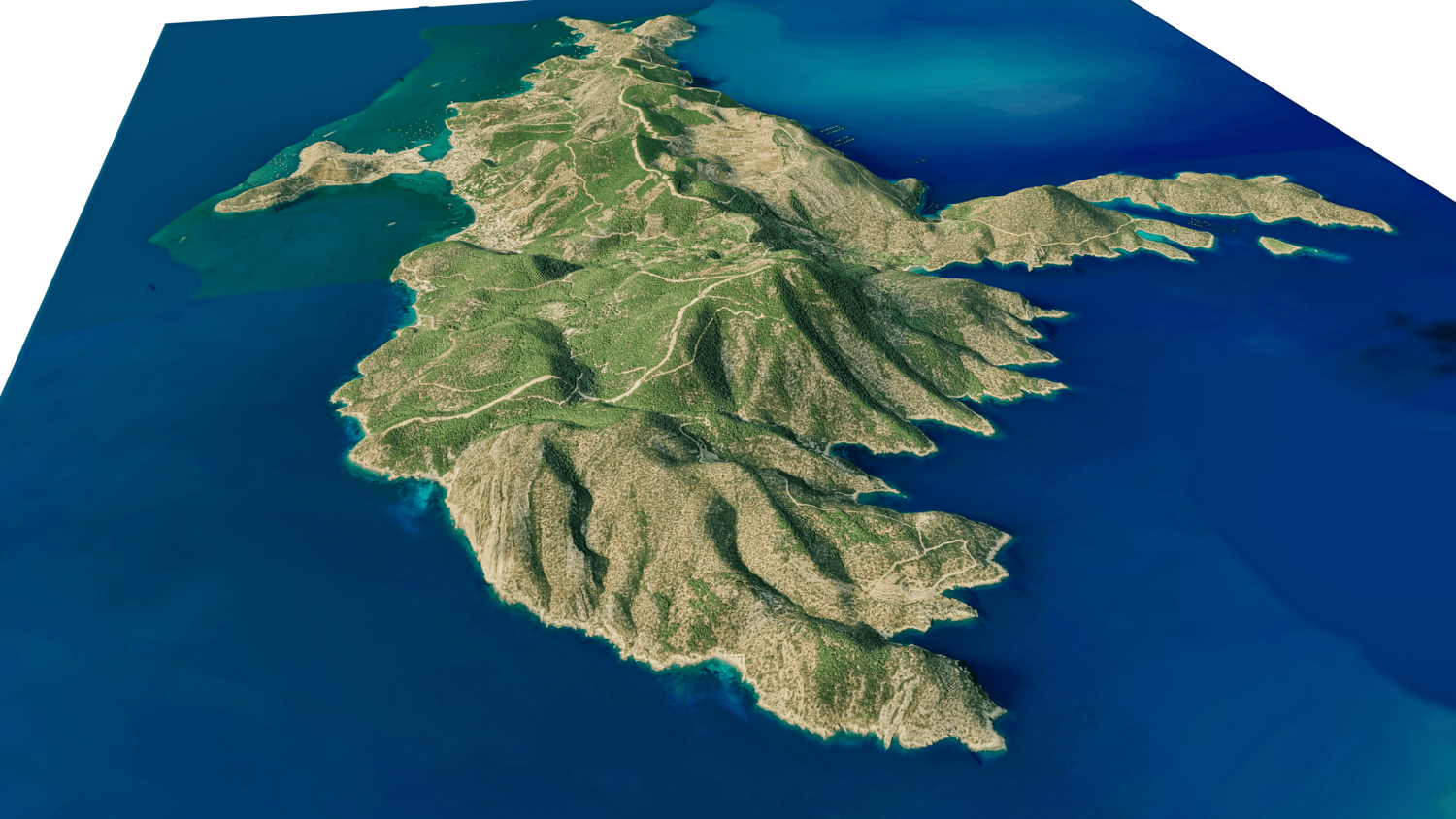Poros Island 3D model terrain. 3d model island of Poros, Greece with its landscape of mountains, beaches and forests.