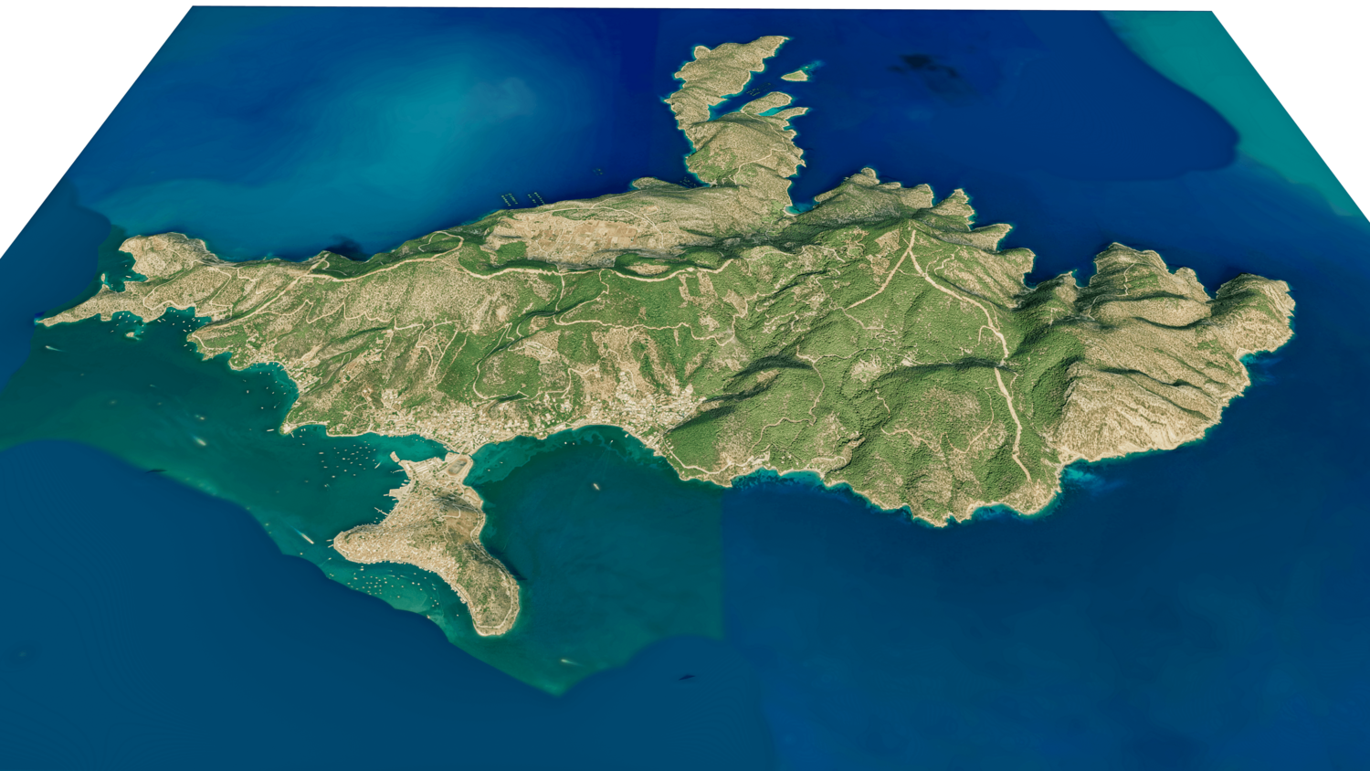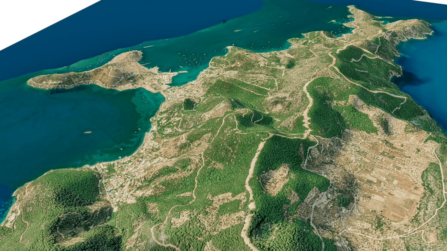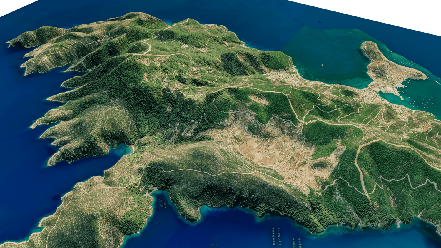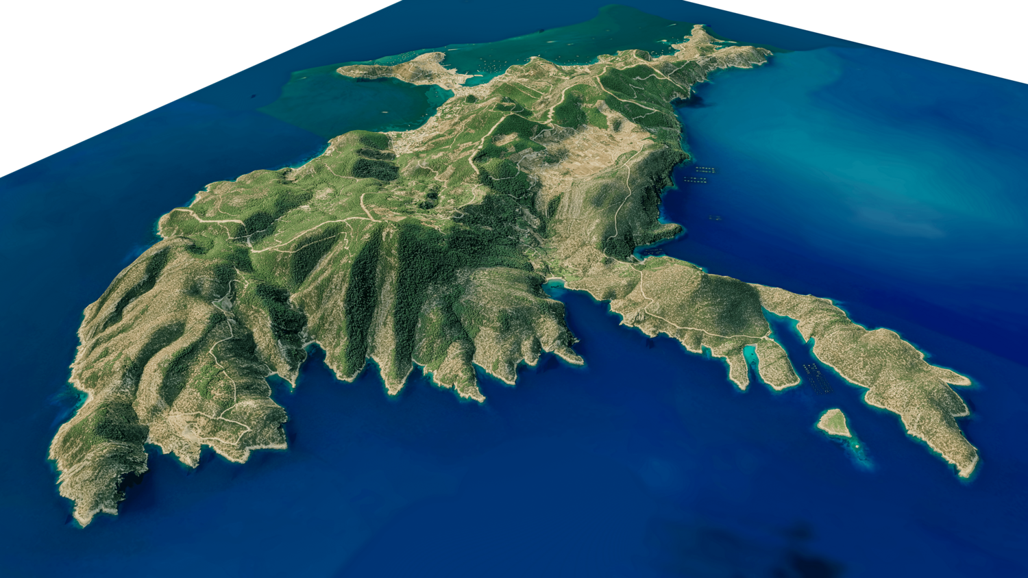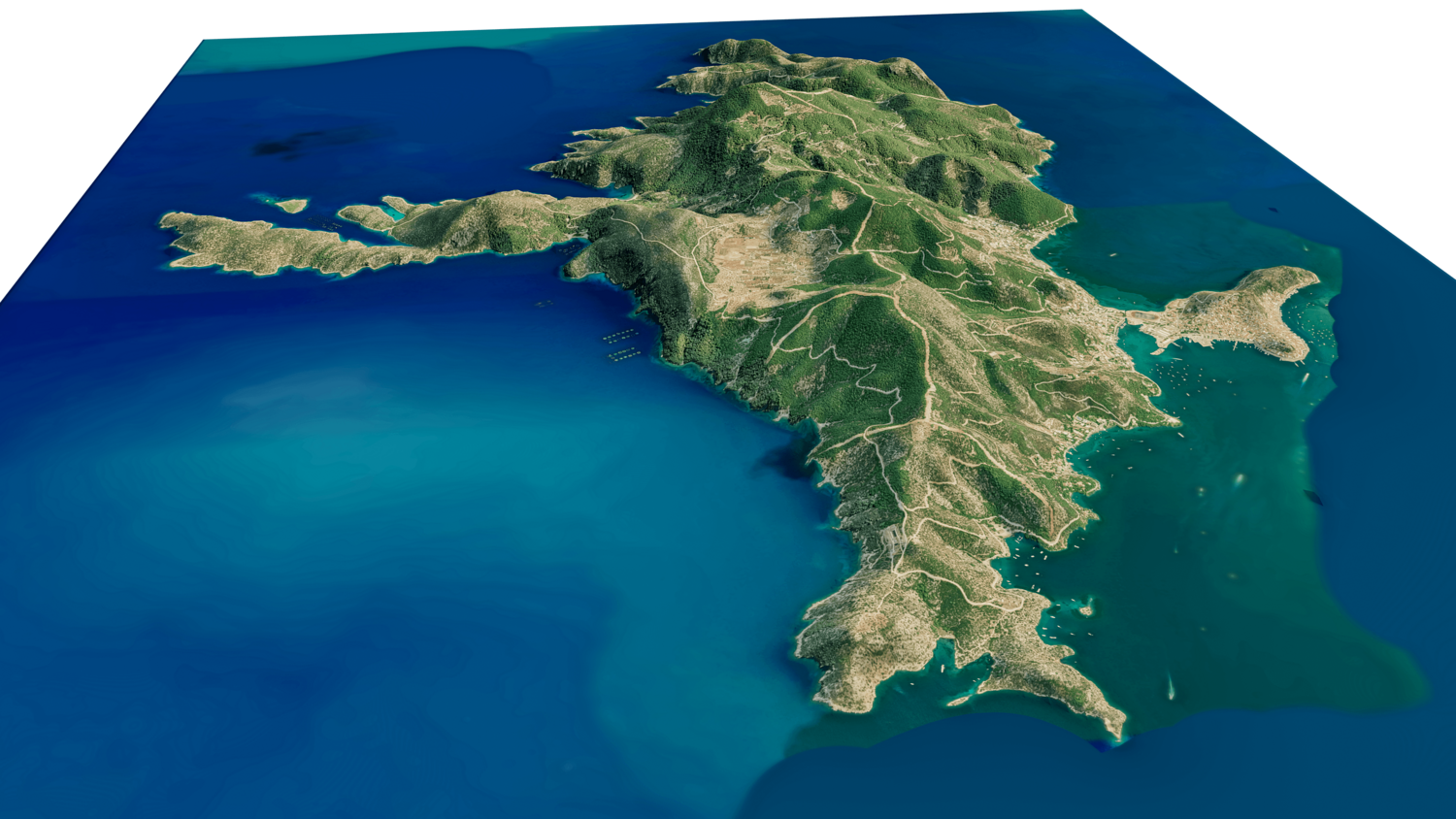 Poros Island 3D model terrain. 3d model island of Poros, Greece with its landscape of mountains, beaches and forests.