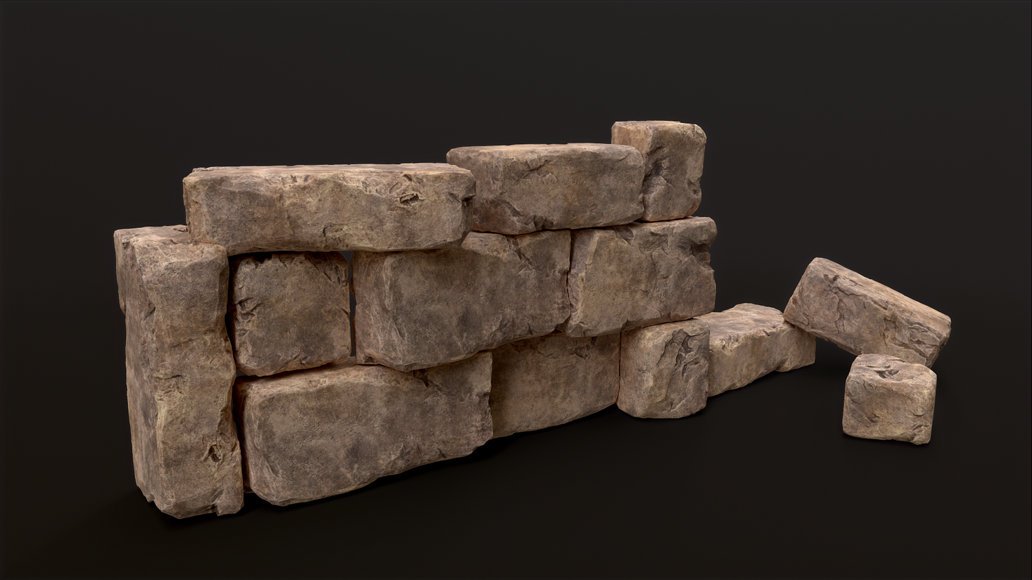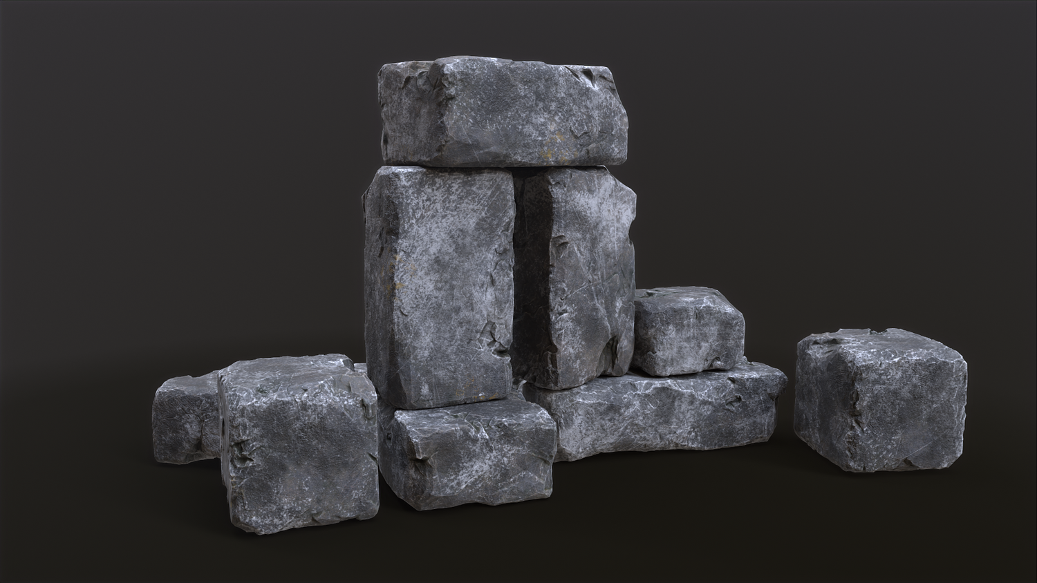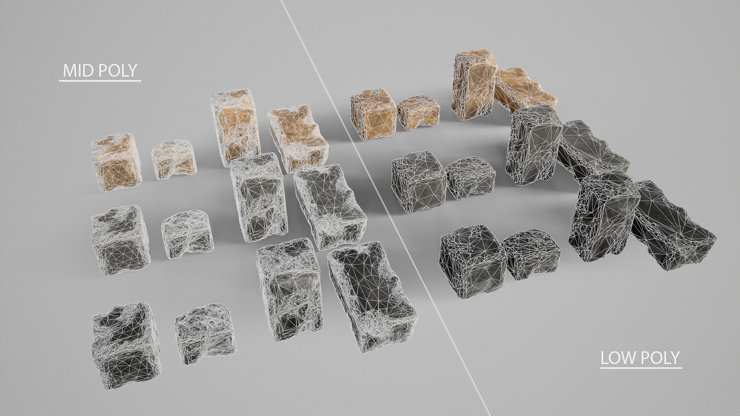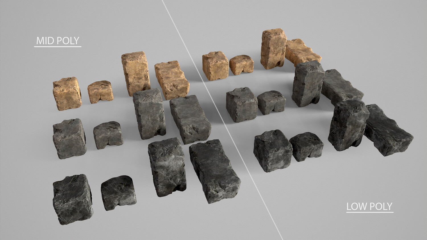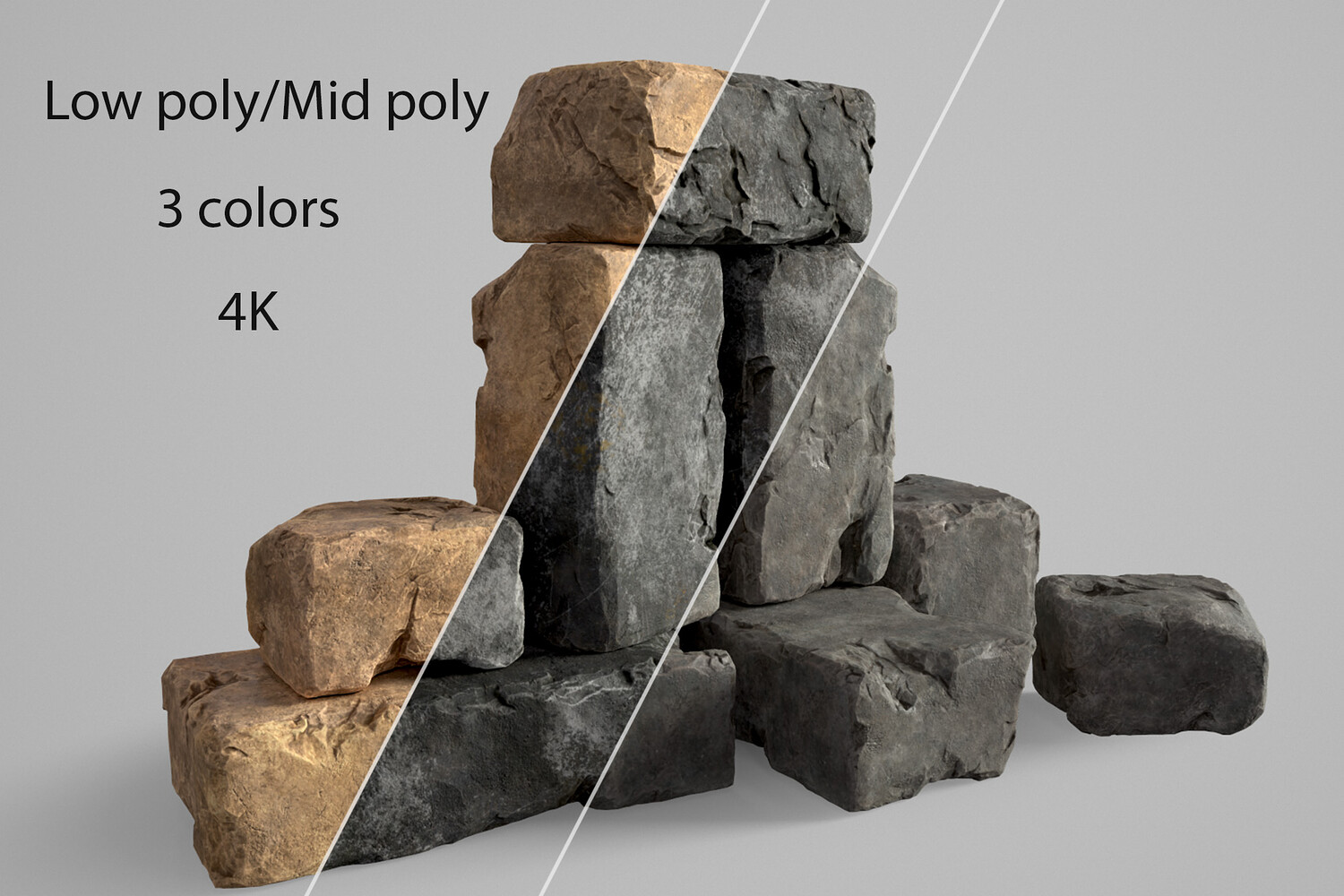 Suitable for exterior and interior of buildings and scenes in the genre of realism or fantasy. Baked and sculpted materials, unique on each side. 3 color versions of stone materials. Low poly and medium poly versions.