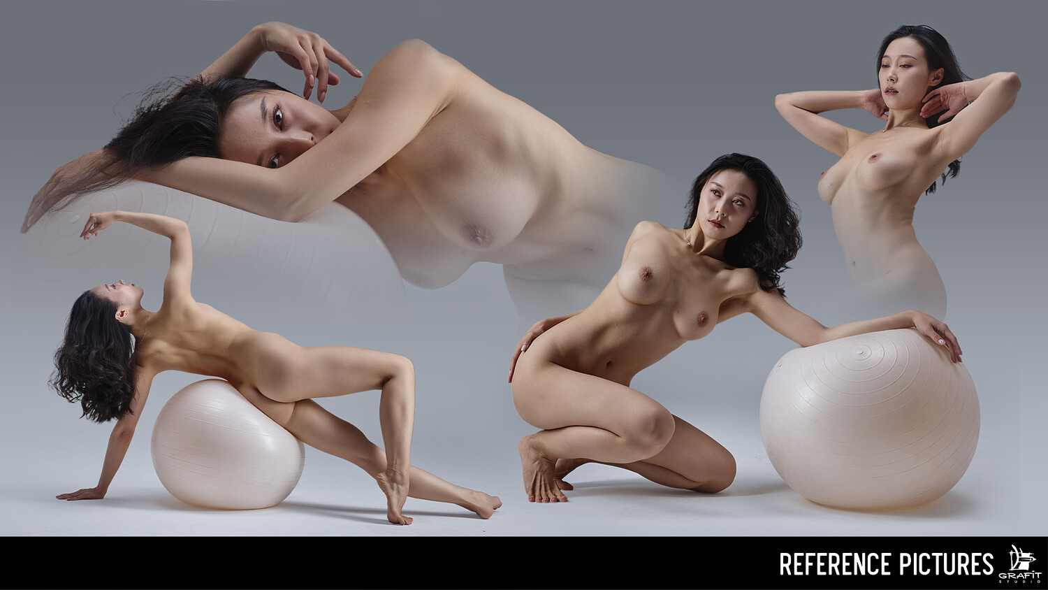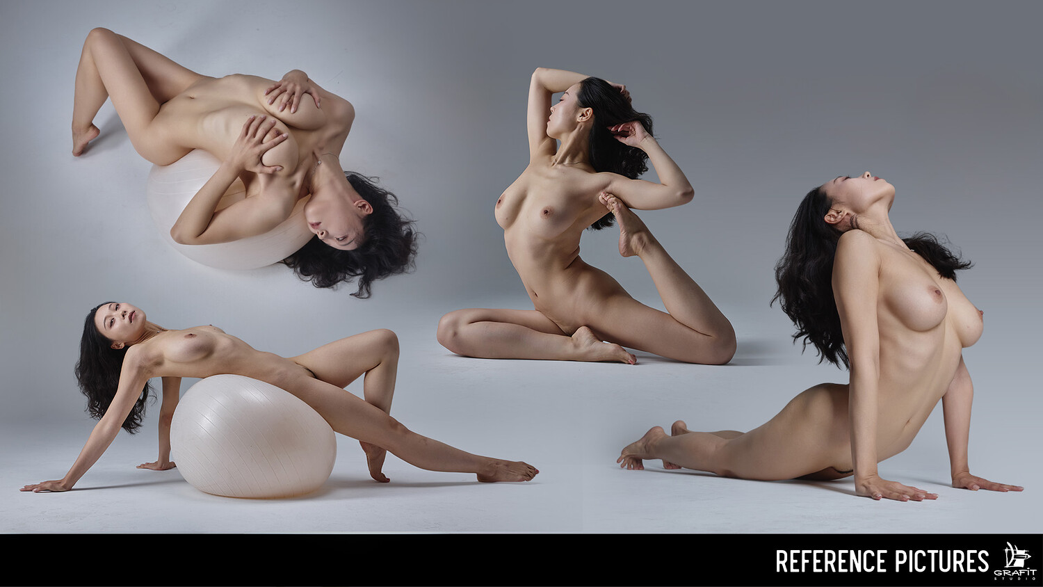 You’ll find a wide variety of setups: standing, seated, and reclining poses, as well as sequences on a large fitness ball (stability ball), adding unique curves and challenging angles. The set also includes striking staff poses and a selection of clean, emotive portraits, making it versatile for both anatomy practice and character design.