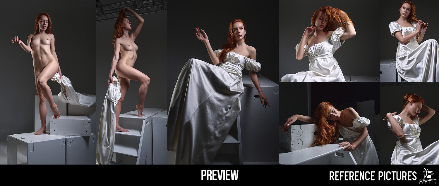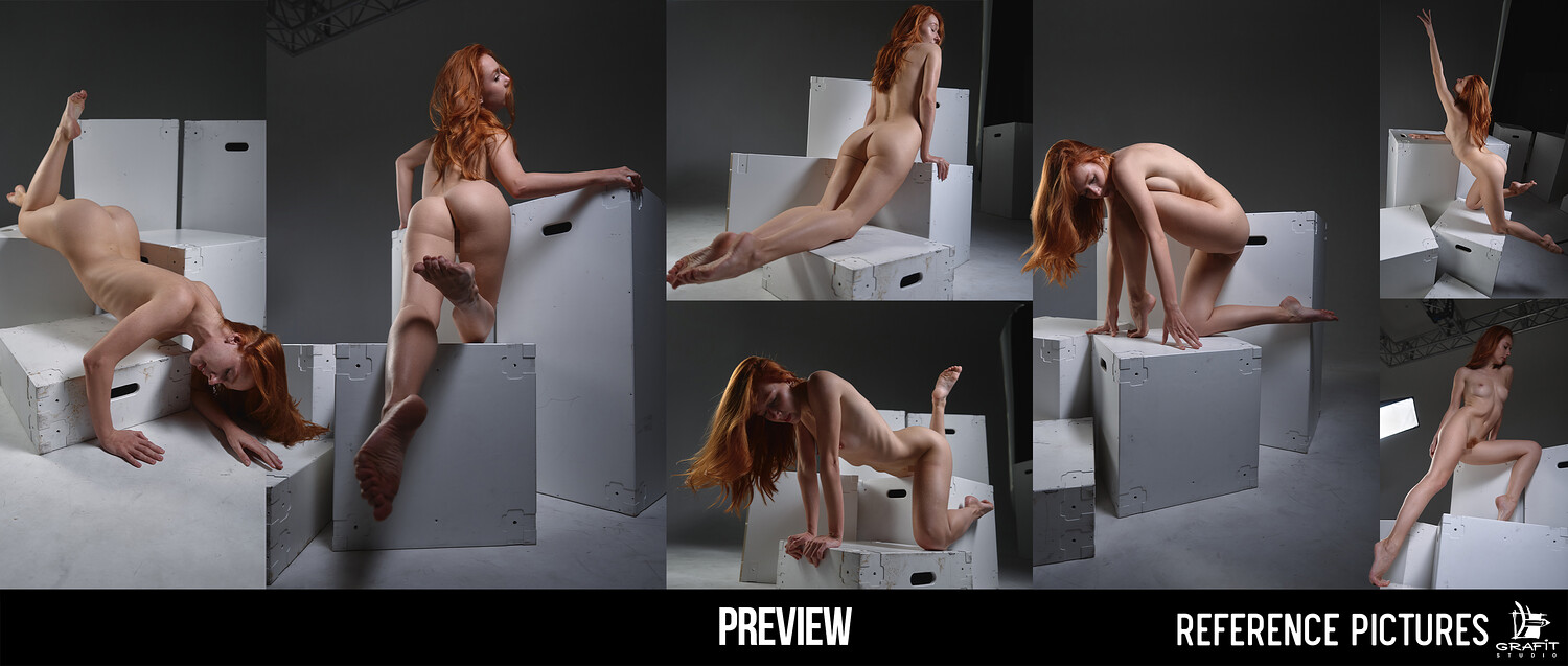 A graceful photo reference pack featuring a natural redhead model in a wide variety of poses. This set includes over 1000 high-resolution images capturing elegant, dynamic, and relaxed movements — sitting, lying down, climbing a small structure, and interacting with fabric.