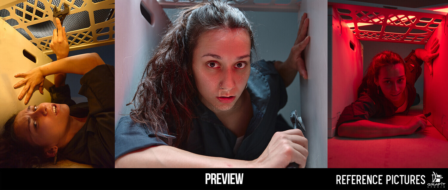 This set also includes crawling poses inside a constructed environment resembling a tunnel or ventilation shaft, enhanced by strong directional lighting and technical props such as a wrench.