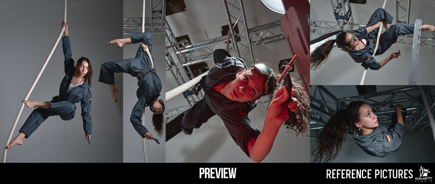 1. Aerial & crawling poses β one model is photographed in mid-air using a rope system, creating floating, climbing, and hanging poses ideal for character design, action scenes, and dynamic compositions.