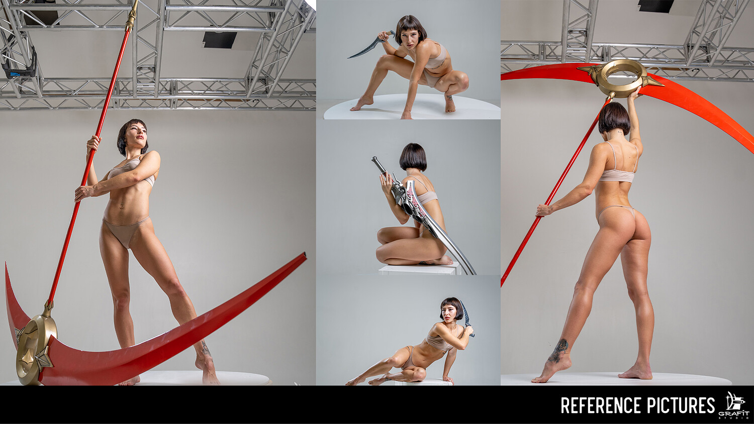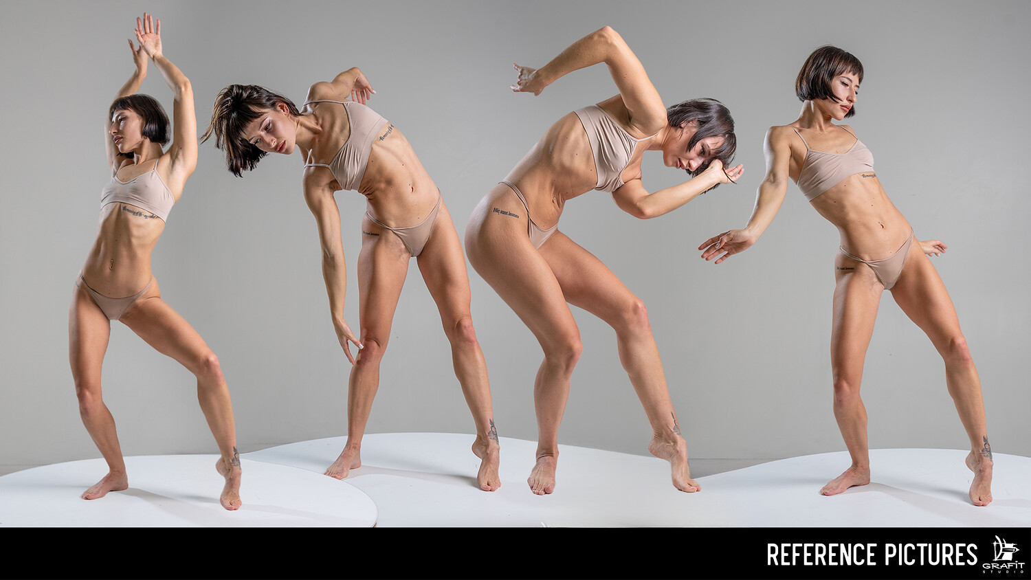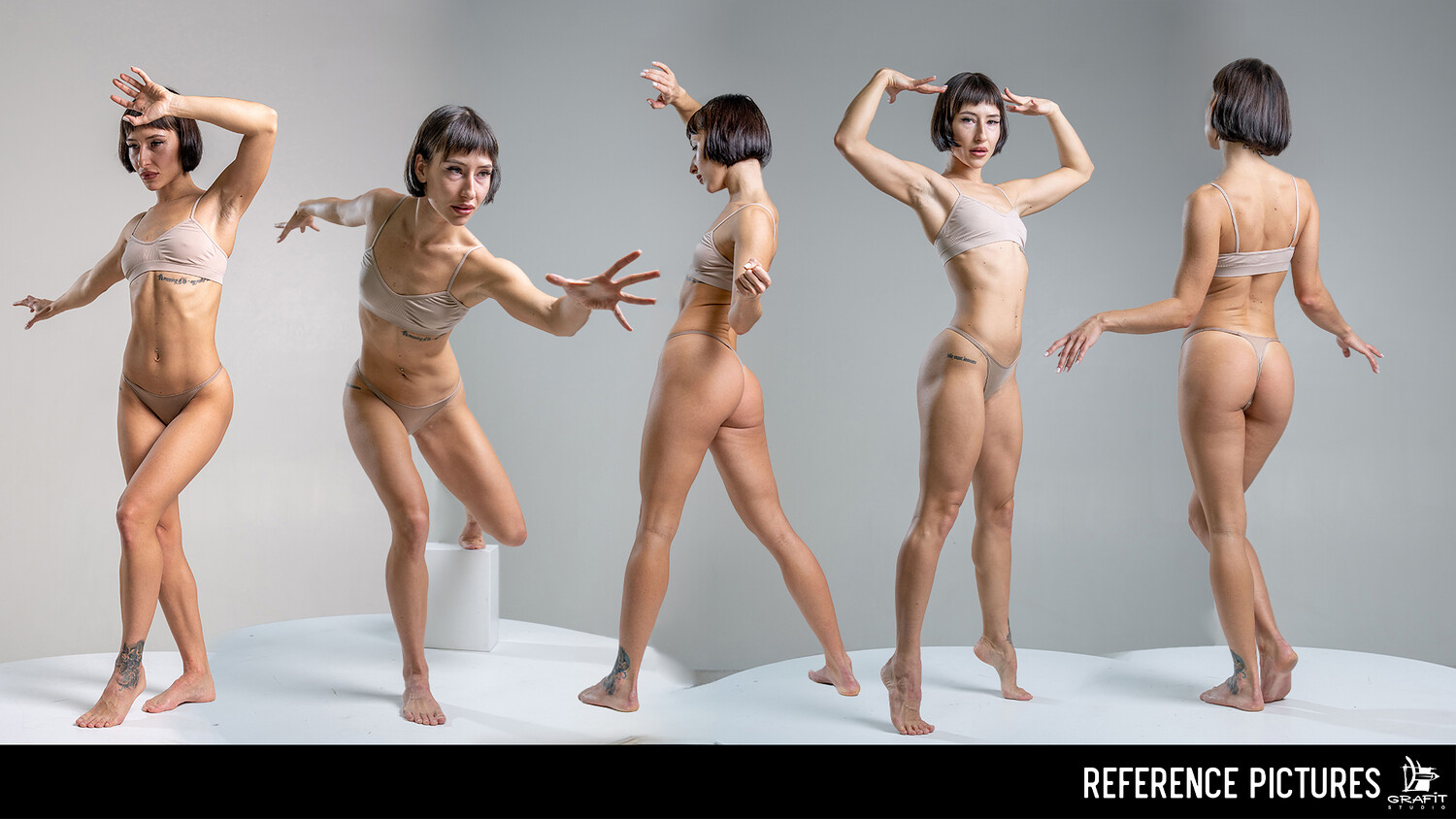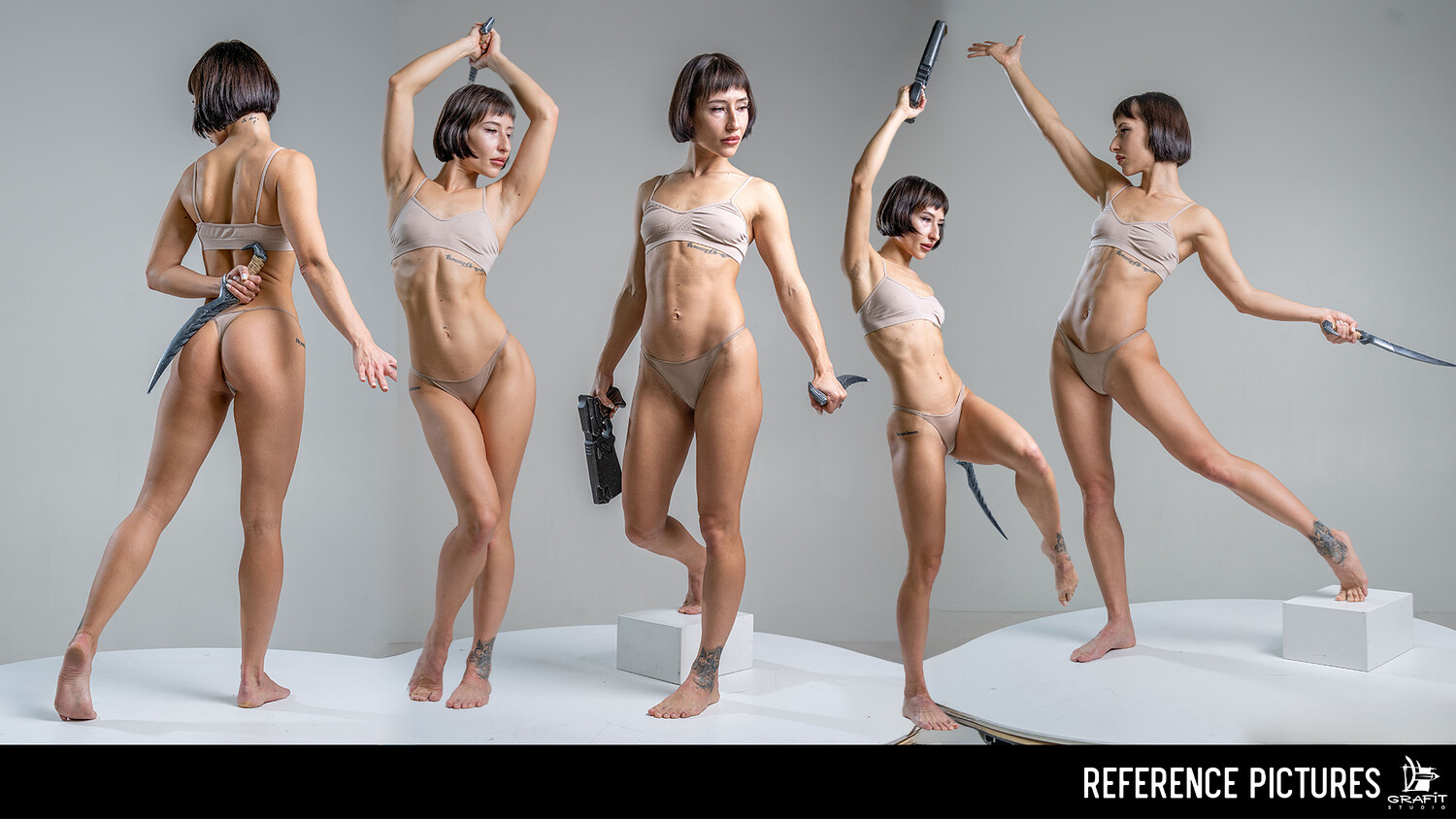 Grafit Studio presents: A dynamic 360° reference pack featuring a fierce female huntress in action-driven poses. Shot on a rotating platform with clean studio lighting, the set captures weapon handling, balance, and full-body motion from every angle.