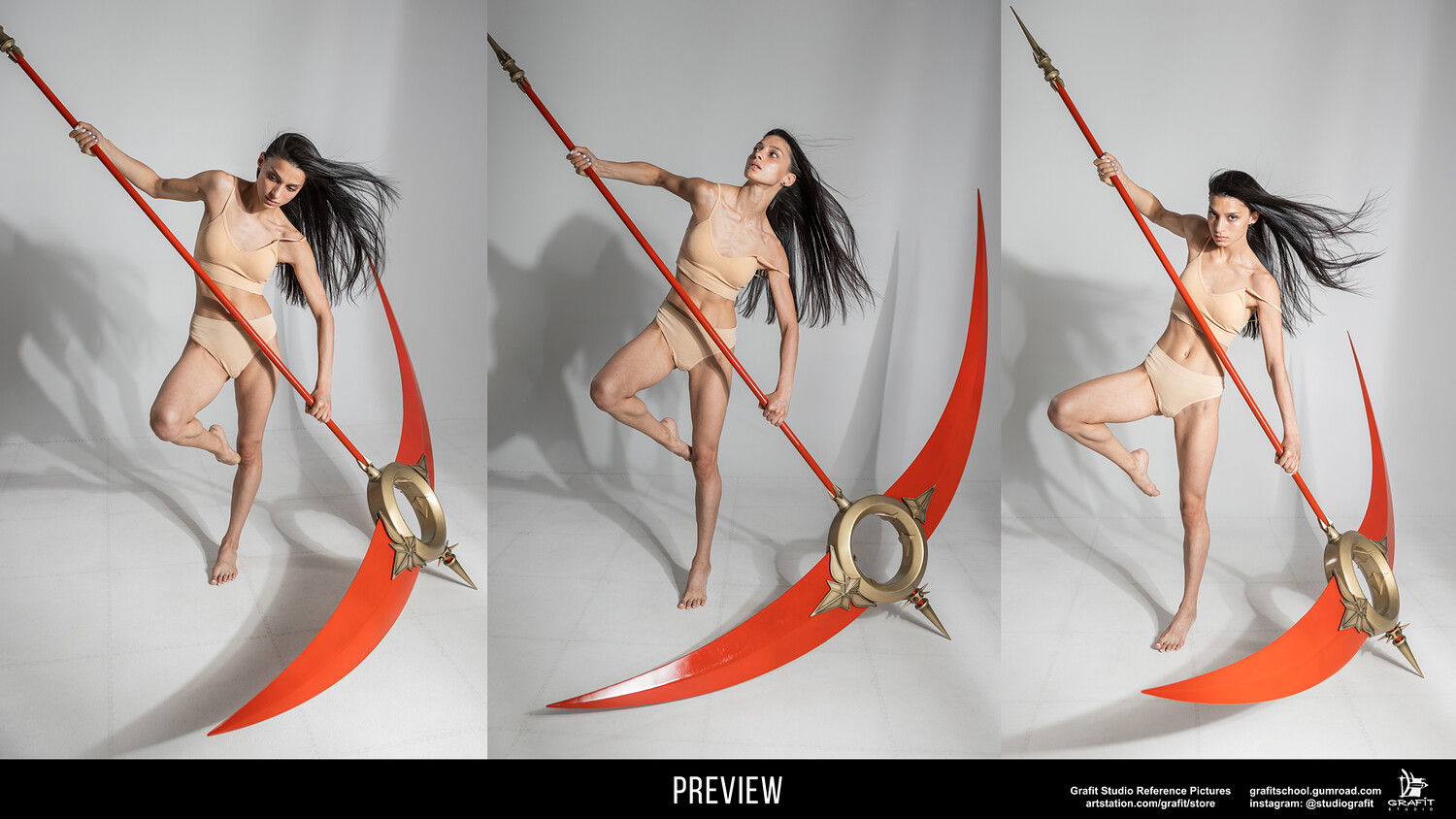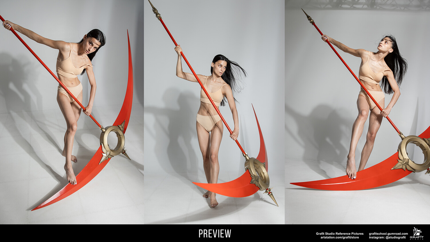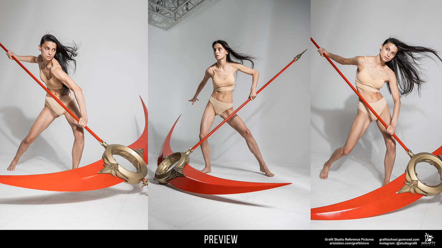 "450+ Graceful Female Scythe Poses" features a stunning collection of dynamic and elegant reference images showcasing a female model wielding a scythe. The poses range from striking battle stances to fluid, dance-like movements, emphasizing both strength and grace. This pack is perfect for artists seeking inspiration for character design, fantasy illustrations, or storytelling, capturing the delicate balance between power and beauty.