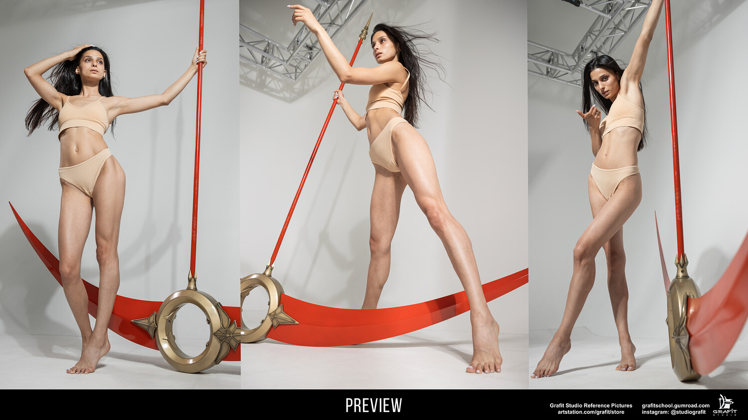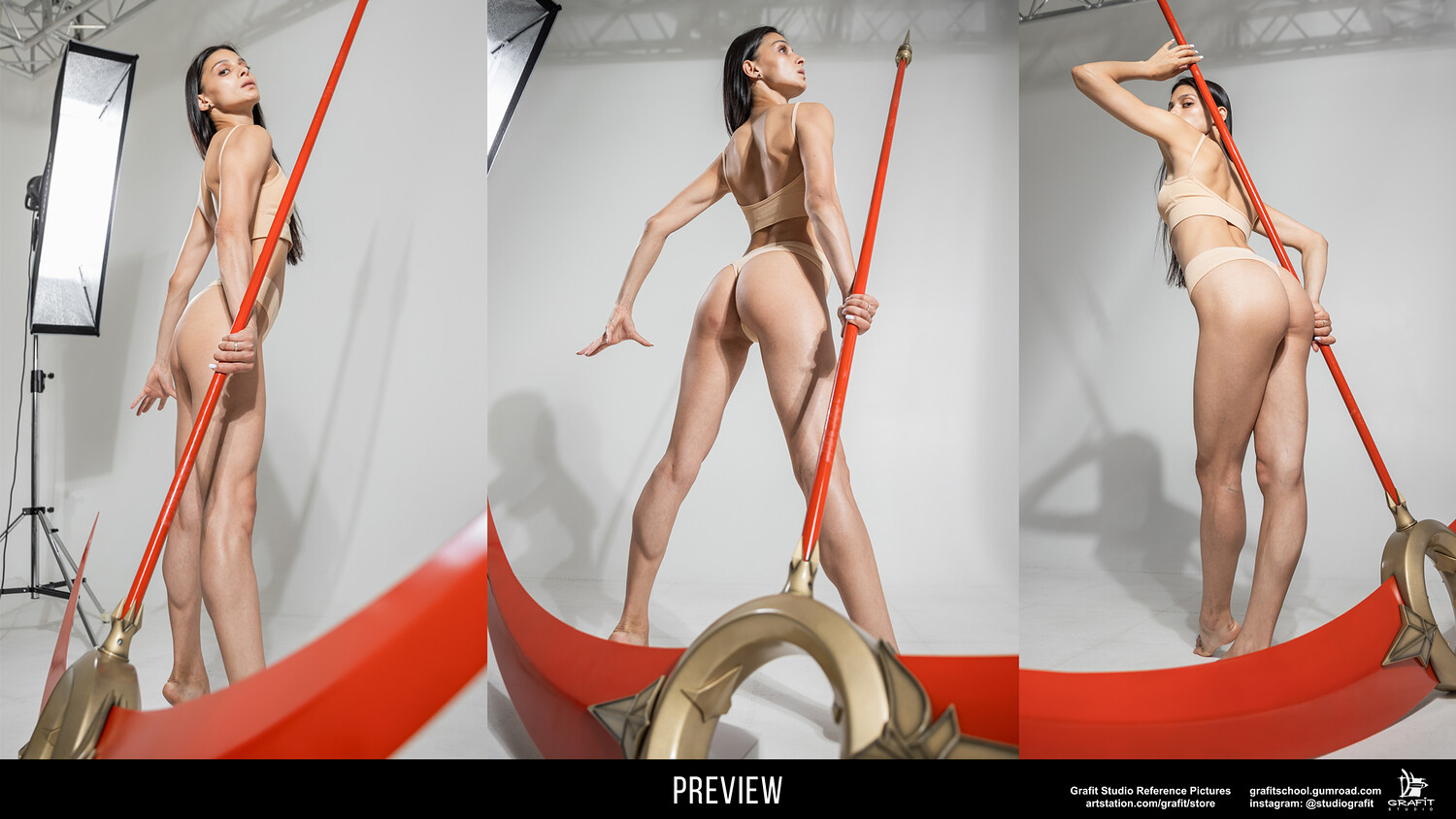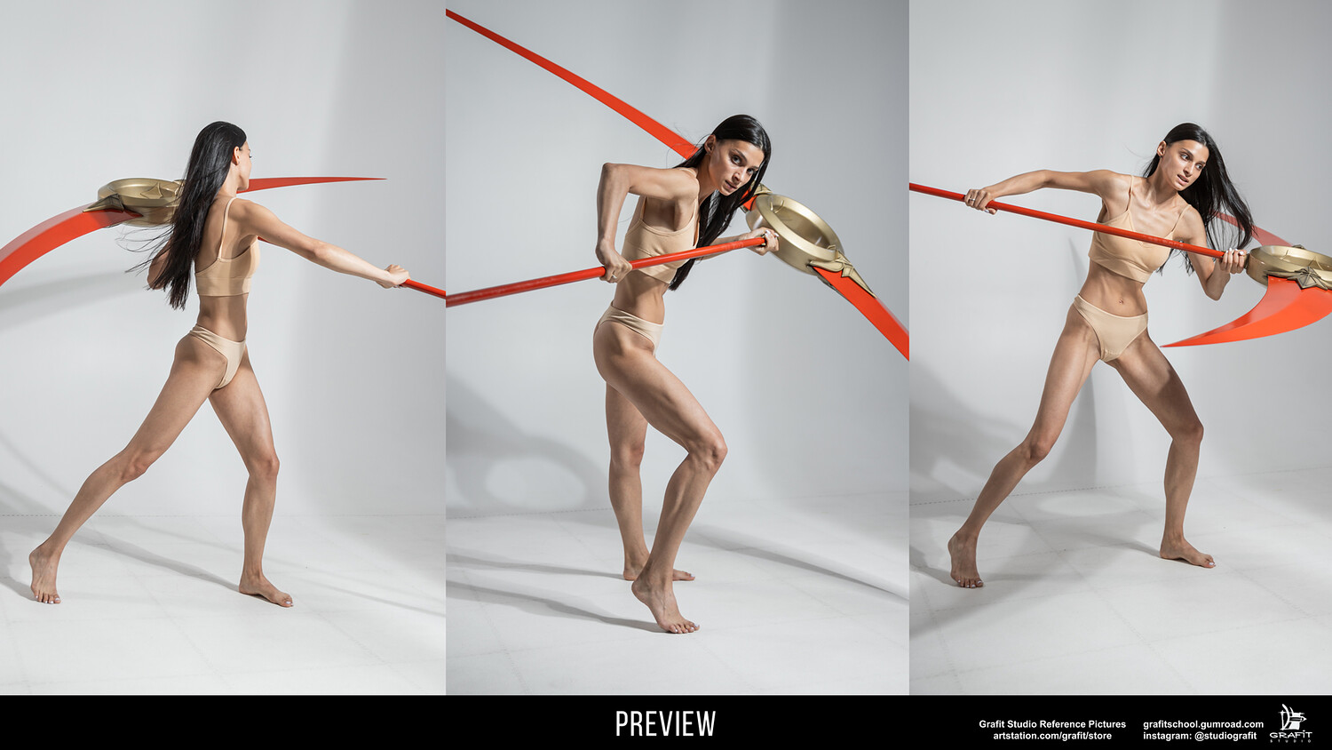 "450+ Graceful Female Scythe Poses" features a stunning collection of dynamic and elegant reference images showcasing a female model wielding a scythe. The poses range from striking battle stances to fluid, dance-like movements, emphasizing both strength and grace. This pack is perfect for artists seeking inspiration for character design, fantasy illustrations, or storytelling, capturing the delicate balance between power and beauty.