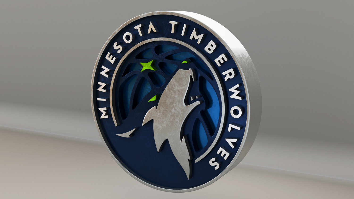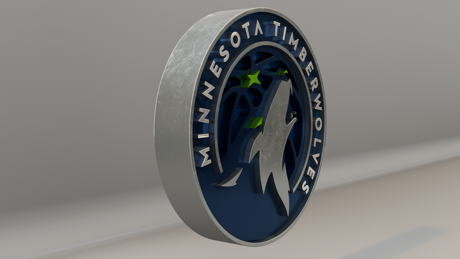 NBA Minnesota Timberwolves Team Logo, modeled and rendered in Maya using Redshift and textured in Substance Painter. It contains a base color and a packed metallic, roughness and AO. The renders are using the metallic texture, but if you don't use it you have the logo with it's original color, like the last picture.