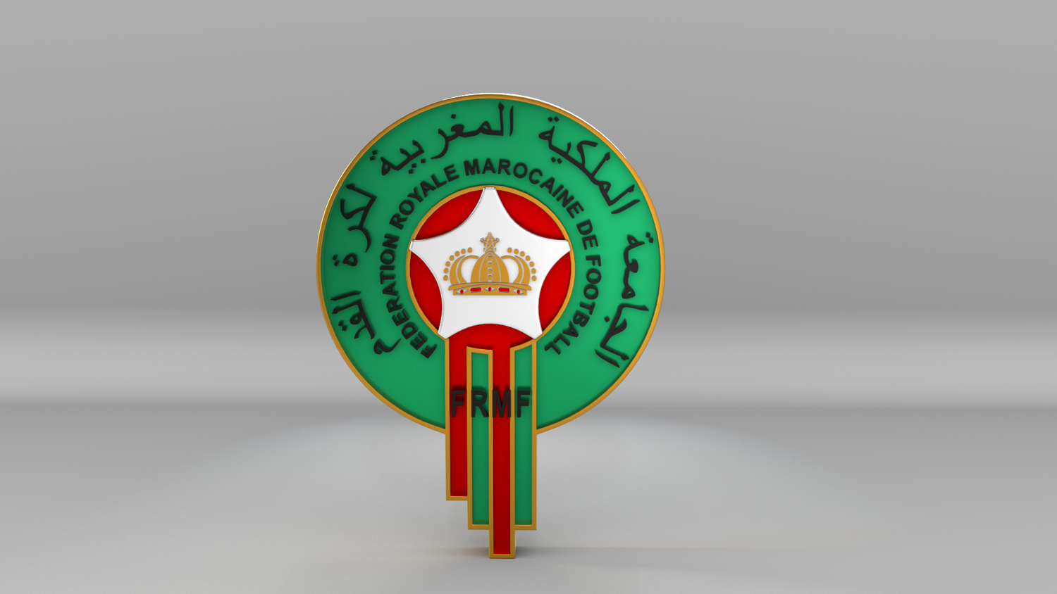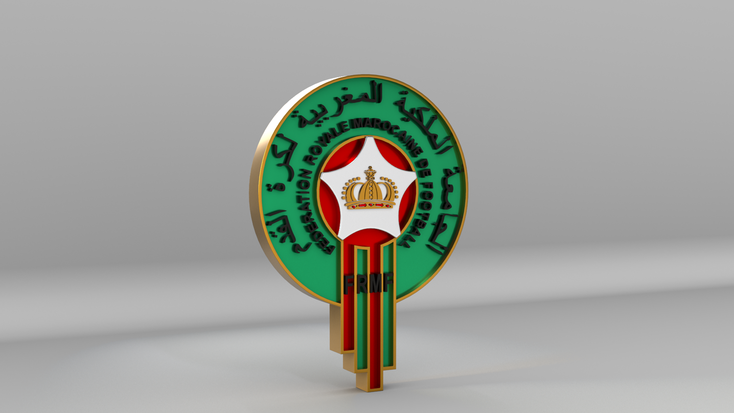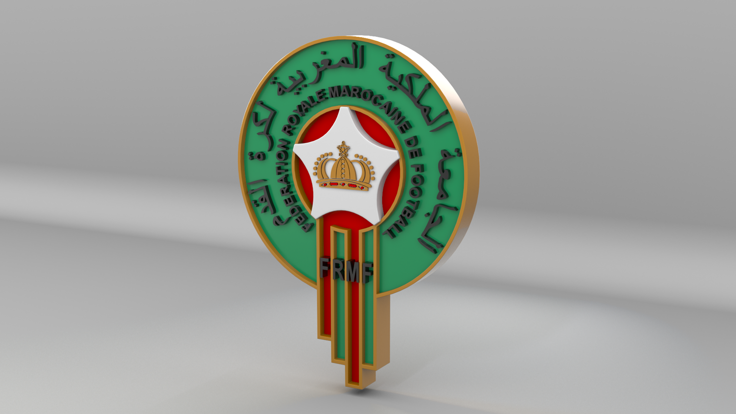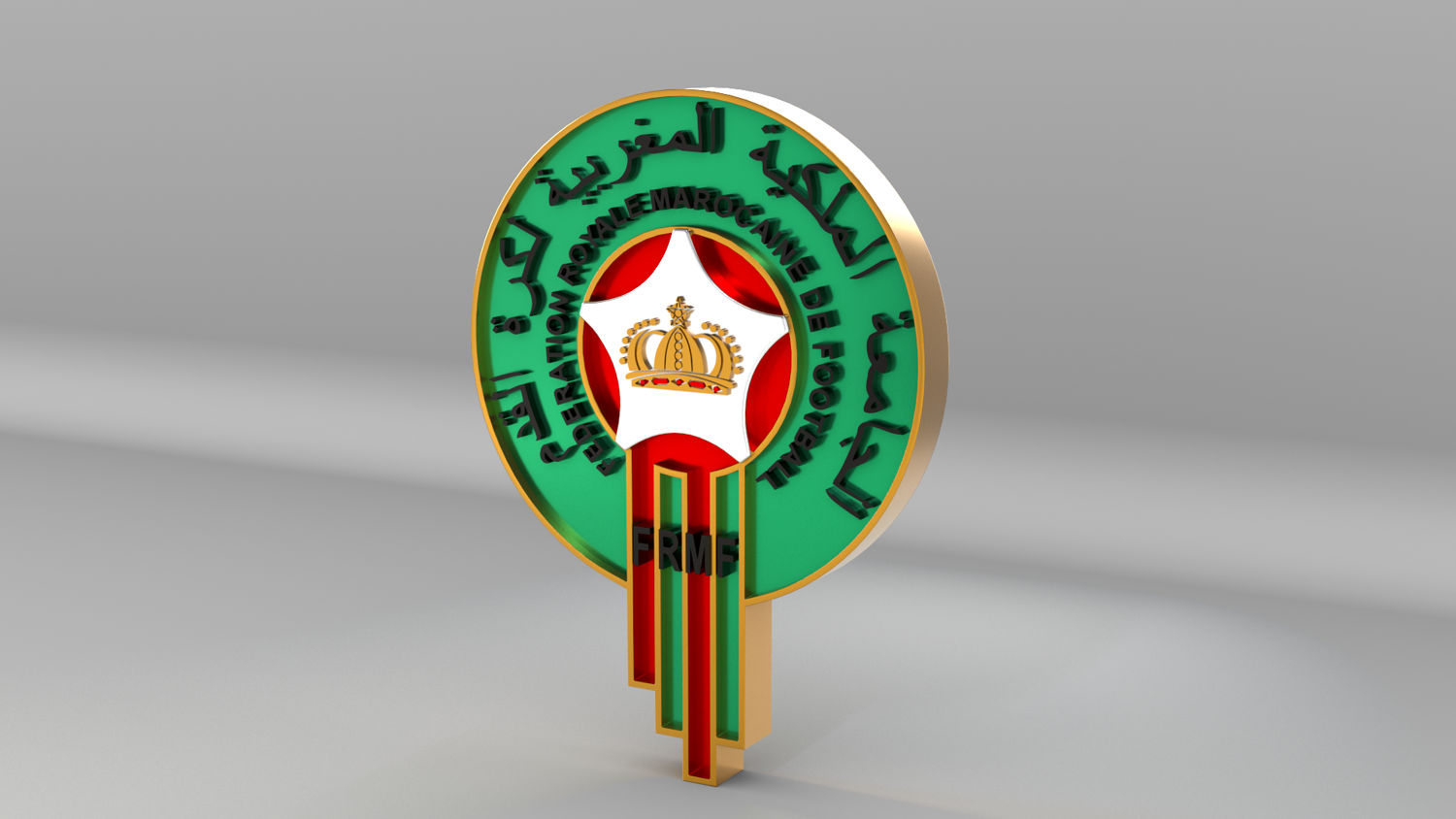 "Morocco National Soccer Team Logo, modeled and rendered in Maya using Redshift, PBR Textures included (BaseColor, Metallic, Roughness and Normal Maps).