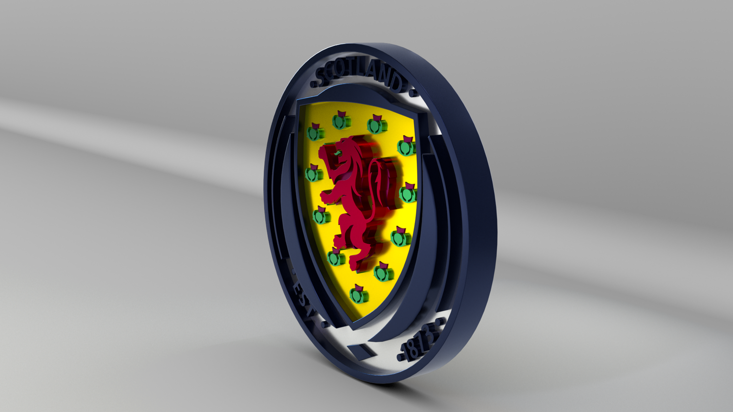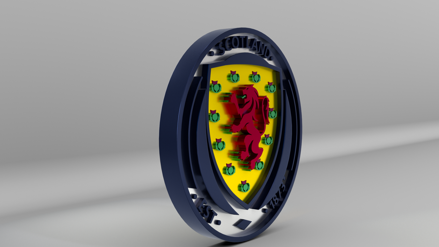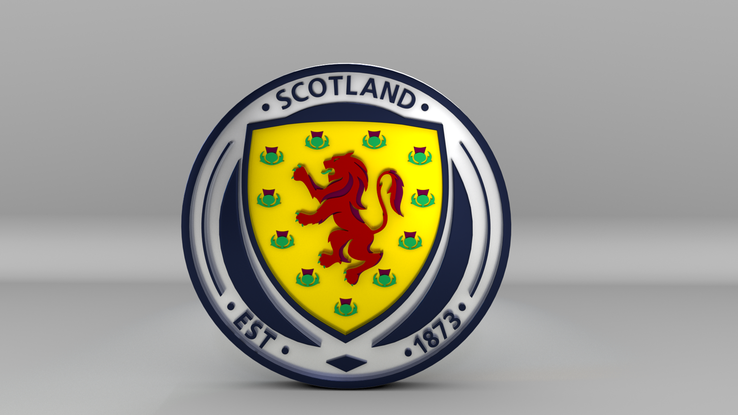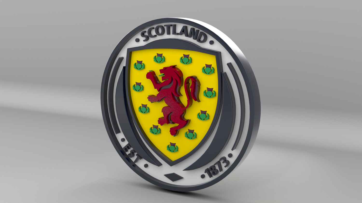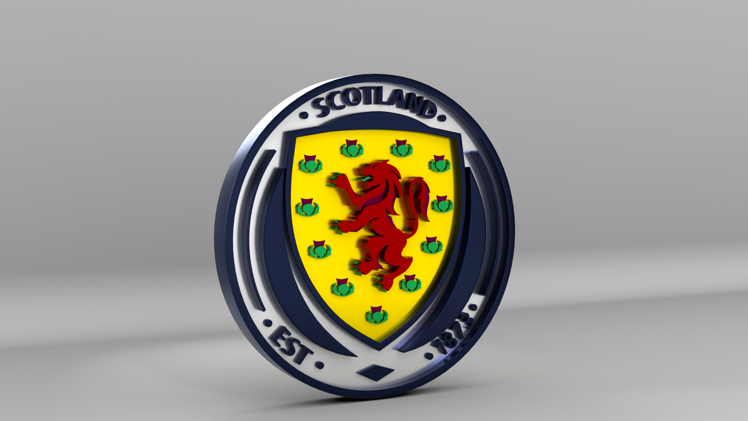 "Scotland National Soccer Team Logo, modeled and rendered in Maya using Redshift, PBR Textures included (BaseColor, Metallic, Roughness and Normal Maps).