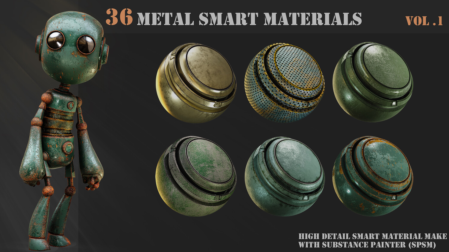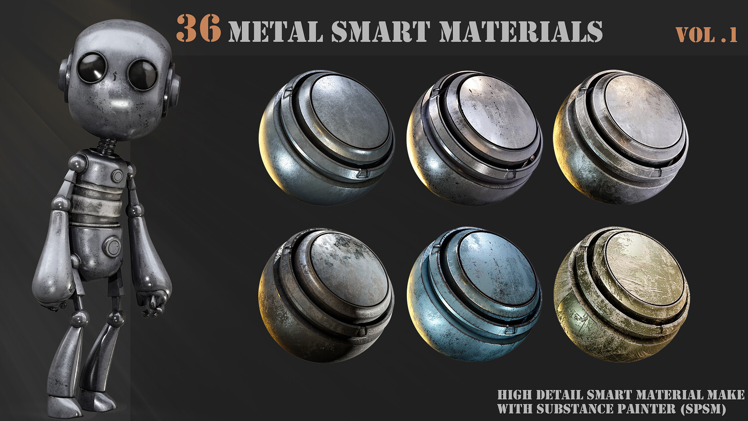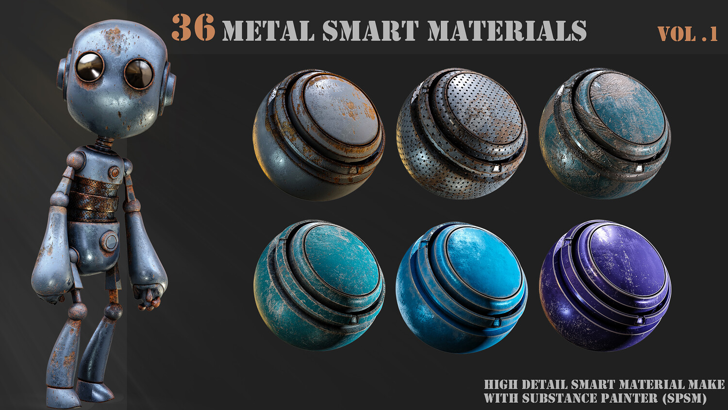 A pack of 36 High-Detail and completely customizable metal smart materials (spsm) Customizable High-quality preview Each layer has the correct name 100% made with substance painter 36 smart materials (spsm) Not heavy All materials checked with PBR validator All patterns created with shape manipulation using default texture and maps in substance painter