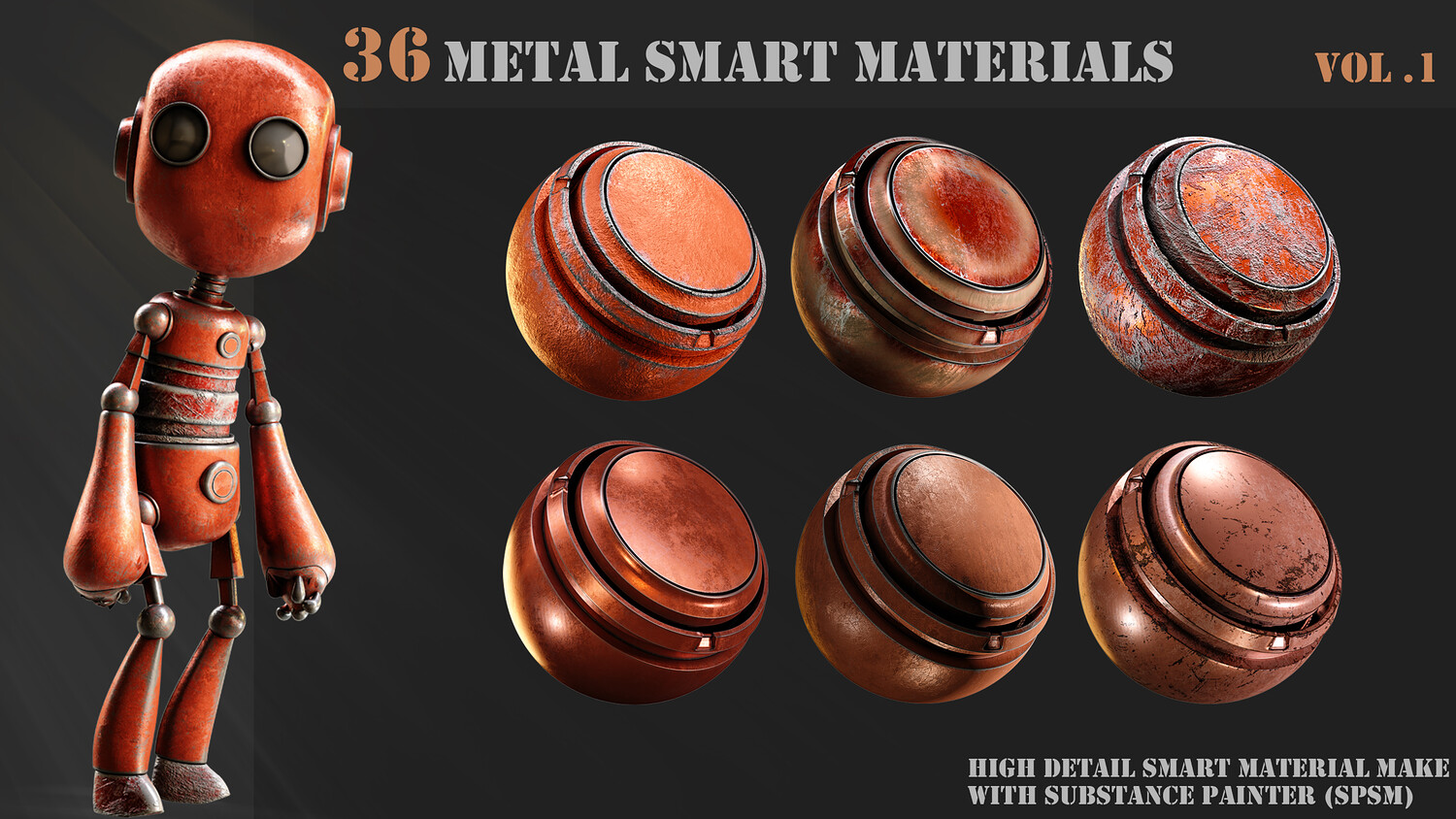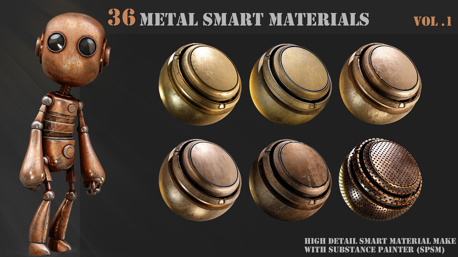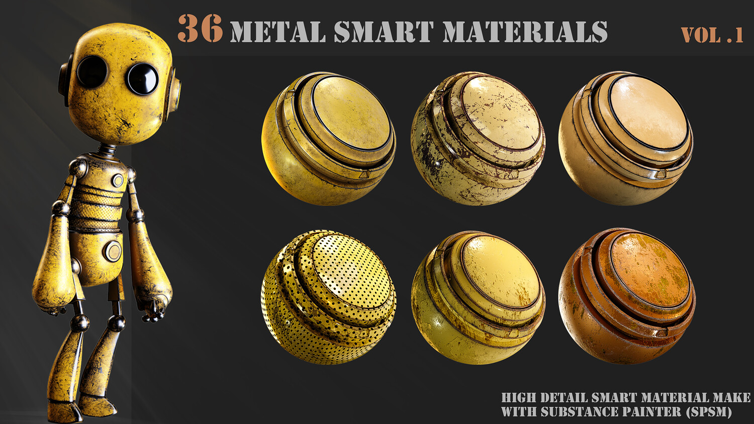 A pack of 36 High-Detail and completely customizable metal smart materials (spsm) Customizable High-quality preview Each layer has the correct name 100% made with substance painter 36 smart materials (spsm) Not heavy All materials checked with PBR validator All patterns created with shape manipulation using default texture and maps in substance painter
