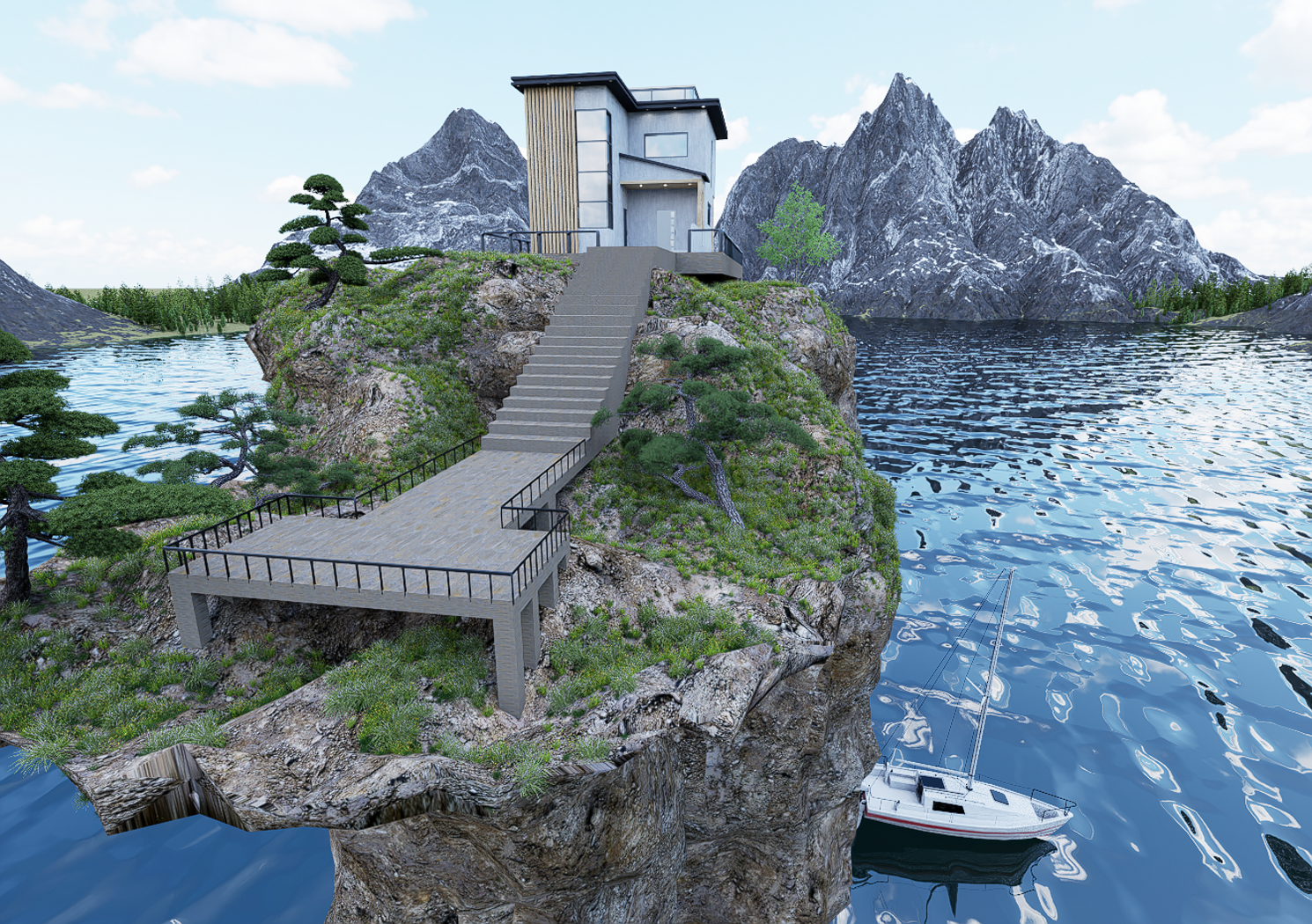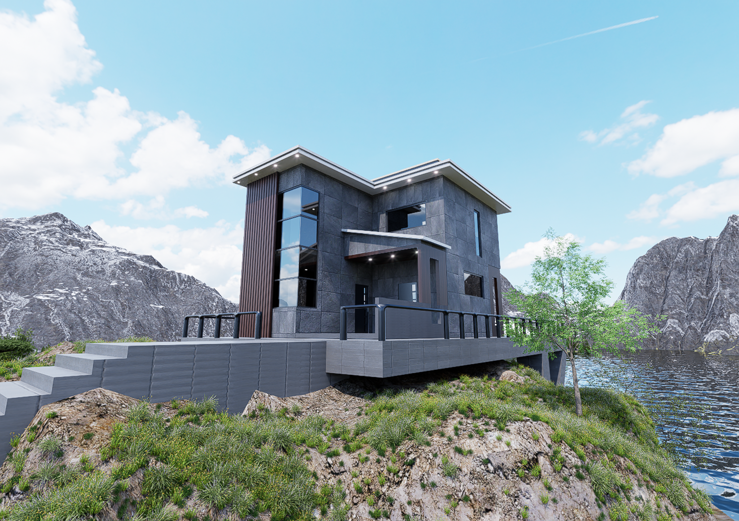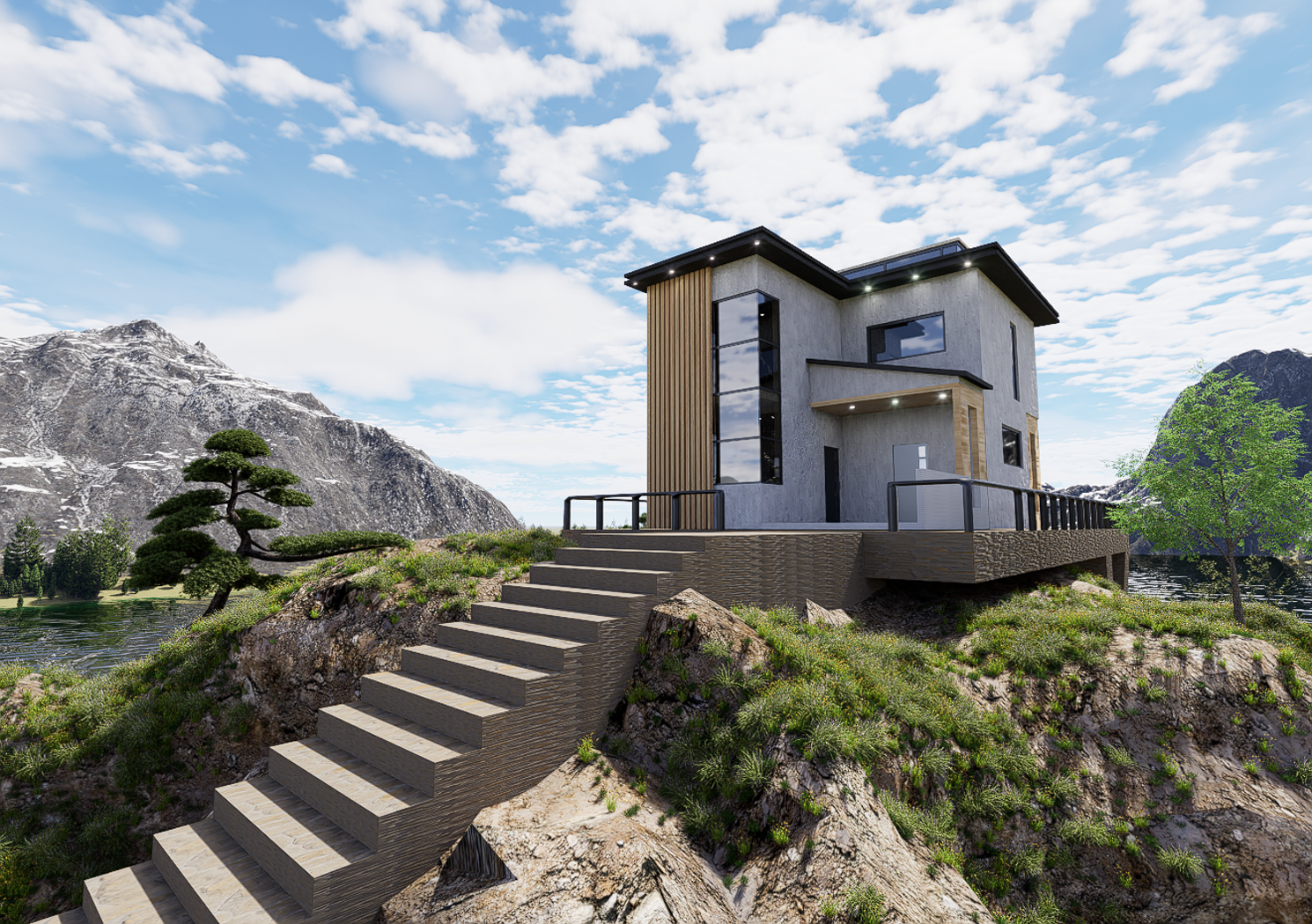 Modern House cottage and landscape big rock.This model made by blender,render by D5 .I'm a 3D artist, modeling different furniture, building, etc., this is my favorite hobby.All models are designed to fit perfectly into any interior and exterior.If you want to see all my works, you can go to the Instagram site and register there to be aware of when and what will appear on 3d drains next time.
