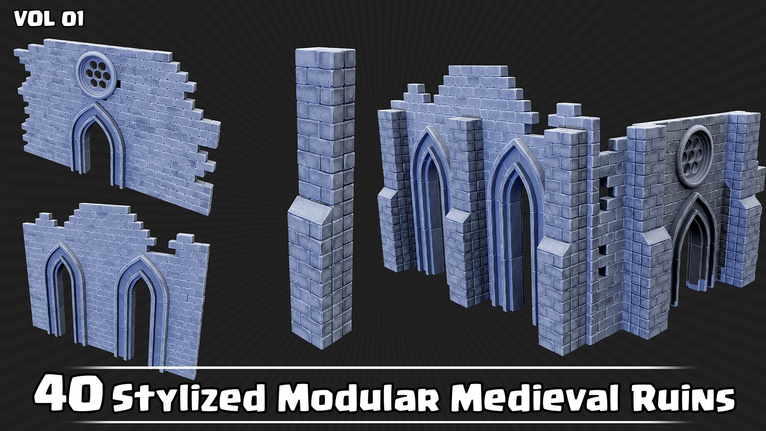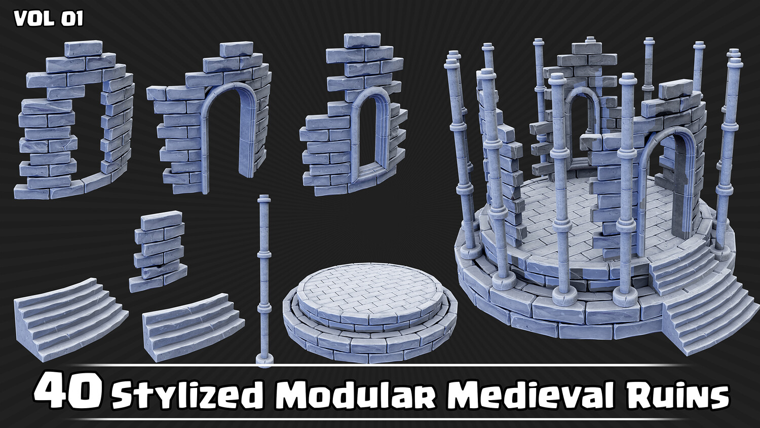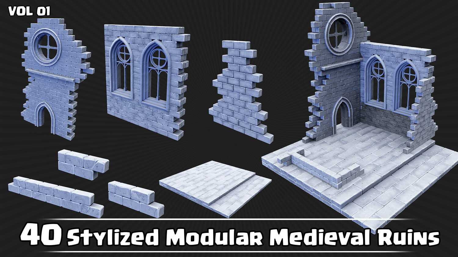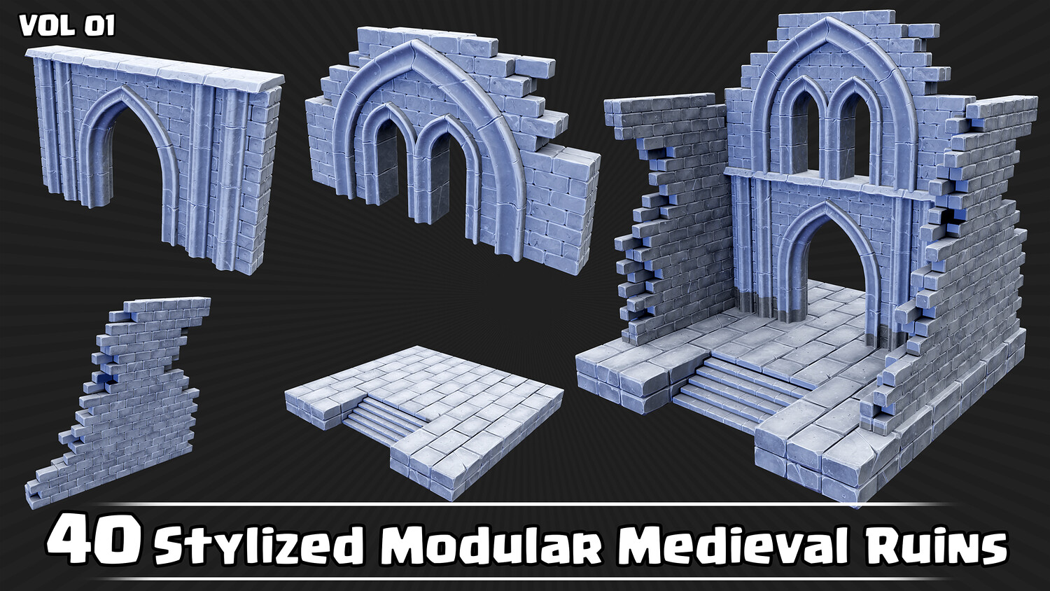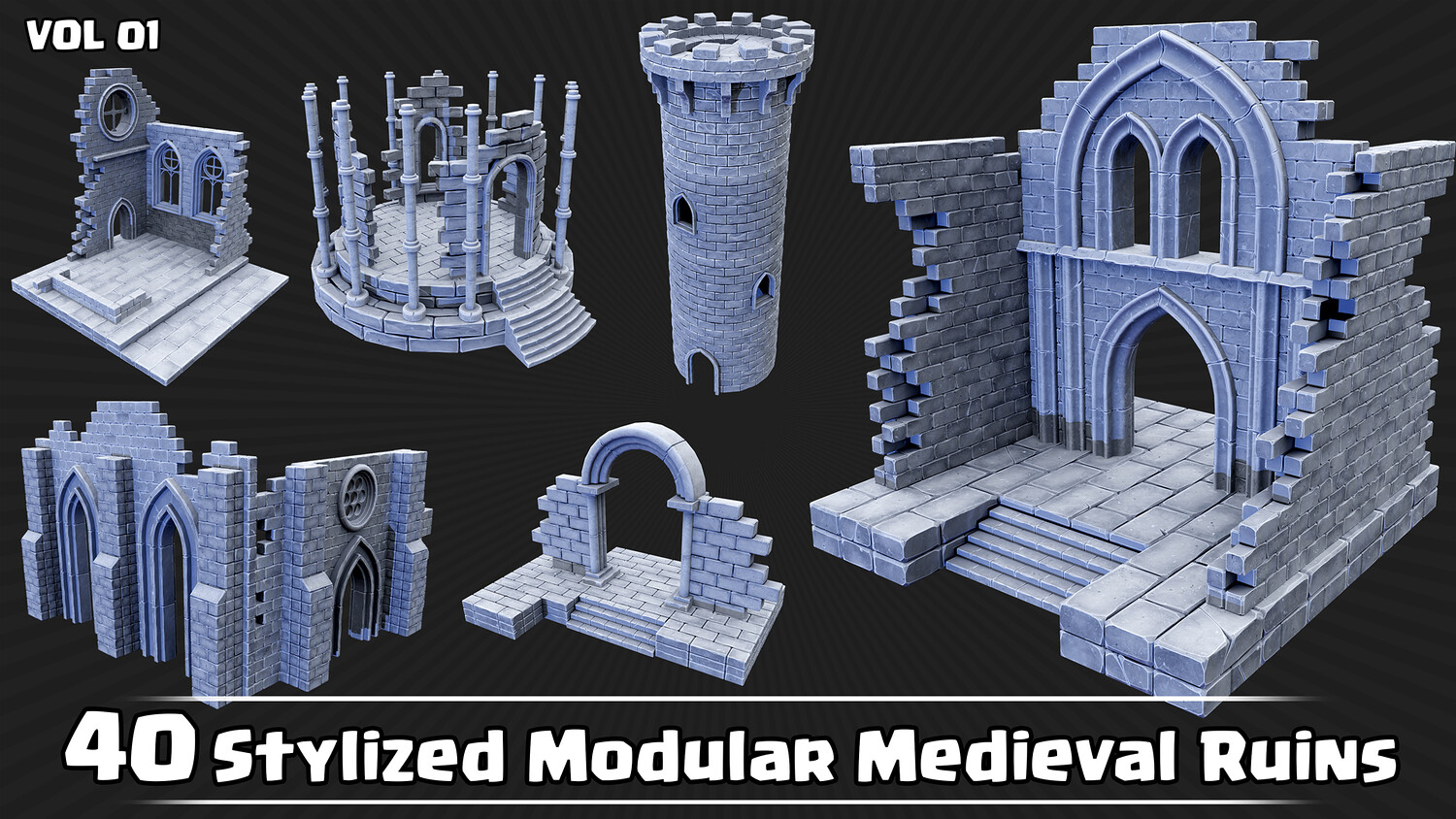 40 Stylized Modular Medieval Ruins Highpoly (.FBX & .OBJ).