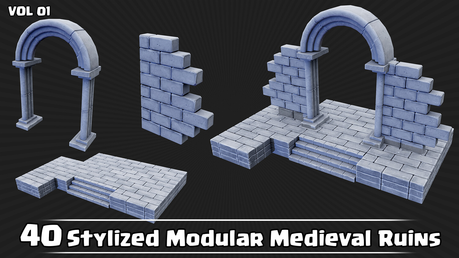 40 Stylized Modular Medieval Ruins Game Ready VOL01
