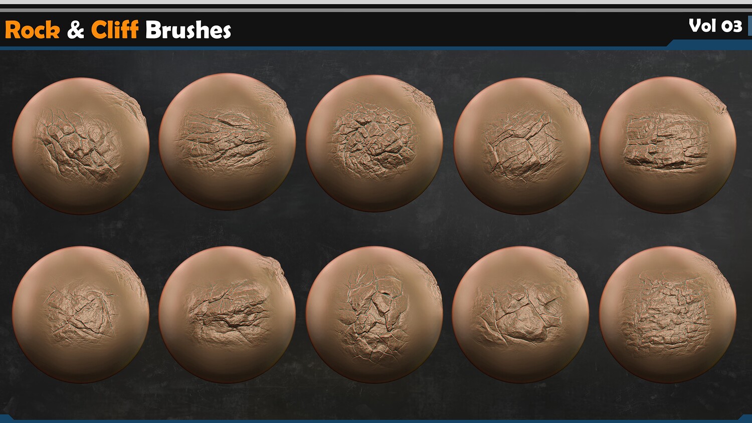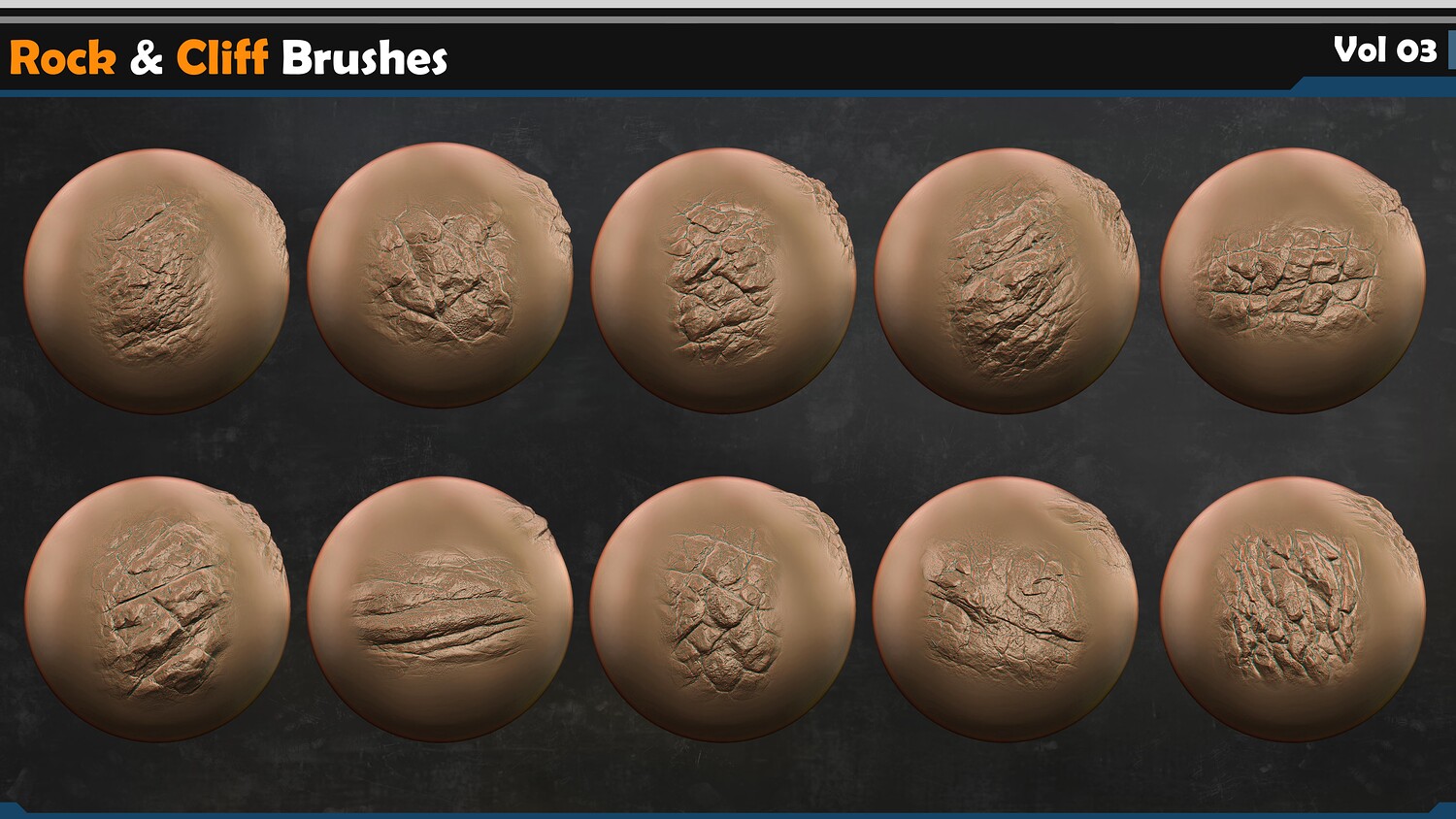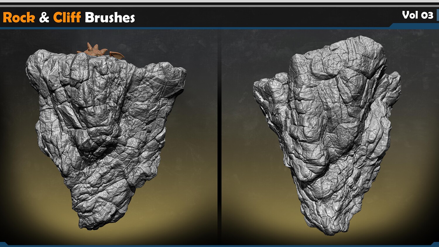 This Product include 30 Rock & Cliff Brushes | Vol.03 A premium collection of 30 high-quality ZBrush brushes for sculpting realistic rocks, cliffs, and natural formations. Each brush delivers authentic surface details, cracks, and erosion patterns — ideal for environment artists, game creators, and digital sculptors. With these brushes, you can effortlessly create anything from small rock fragments to massive cliffs — all in minimal time and with maximum realism. Fully optimized and ready to use in ZBrush and Blender.