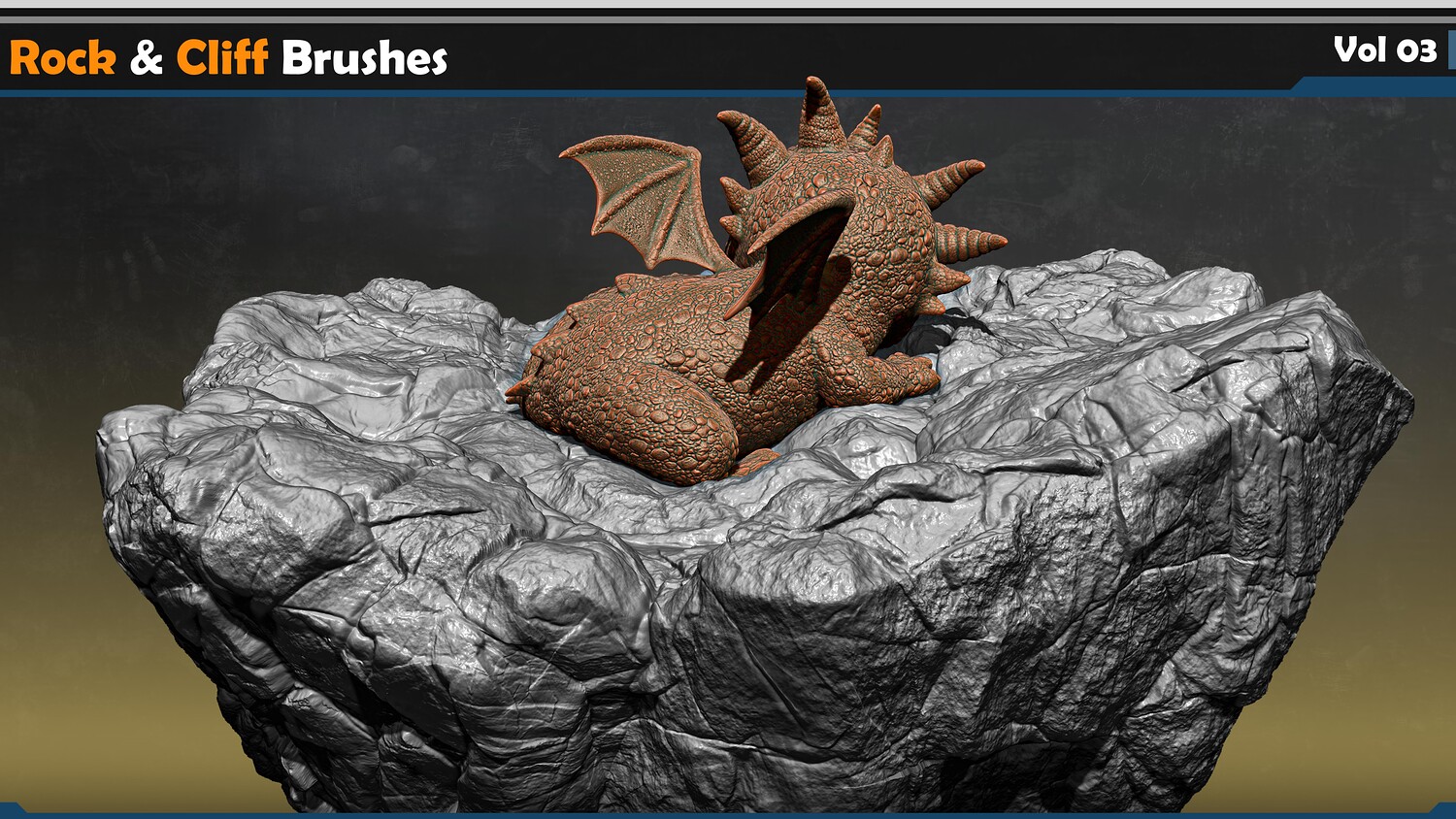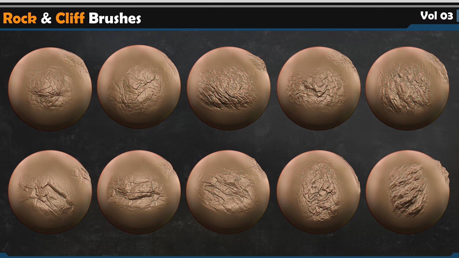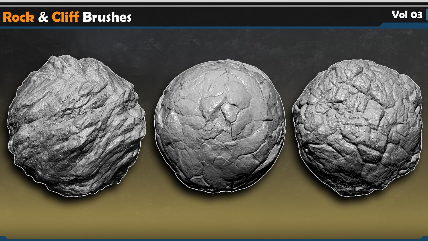 This Product include 30 Rock & Cliff Brushes | Vol.03 A premium collection of 30 high-quality ZBrush brushes for sculpting realistic rocks, cliffs, and natural formations. Each brush delivers authentic surface details, cracks, and erosion patterns — ideal for environment artists, game creators, and digital sculptors. With these brushes, you can effortlessly create anything from small rock fragments to massive cliffs — all in minimal time and with maximum realism. Fully optimized and ready to use in ZBrush and Blender.