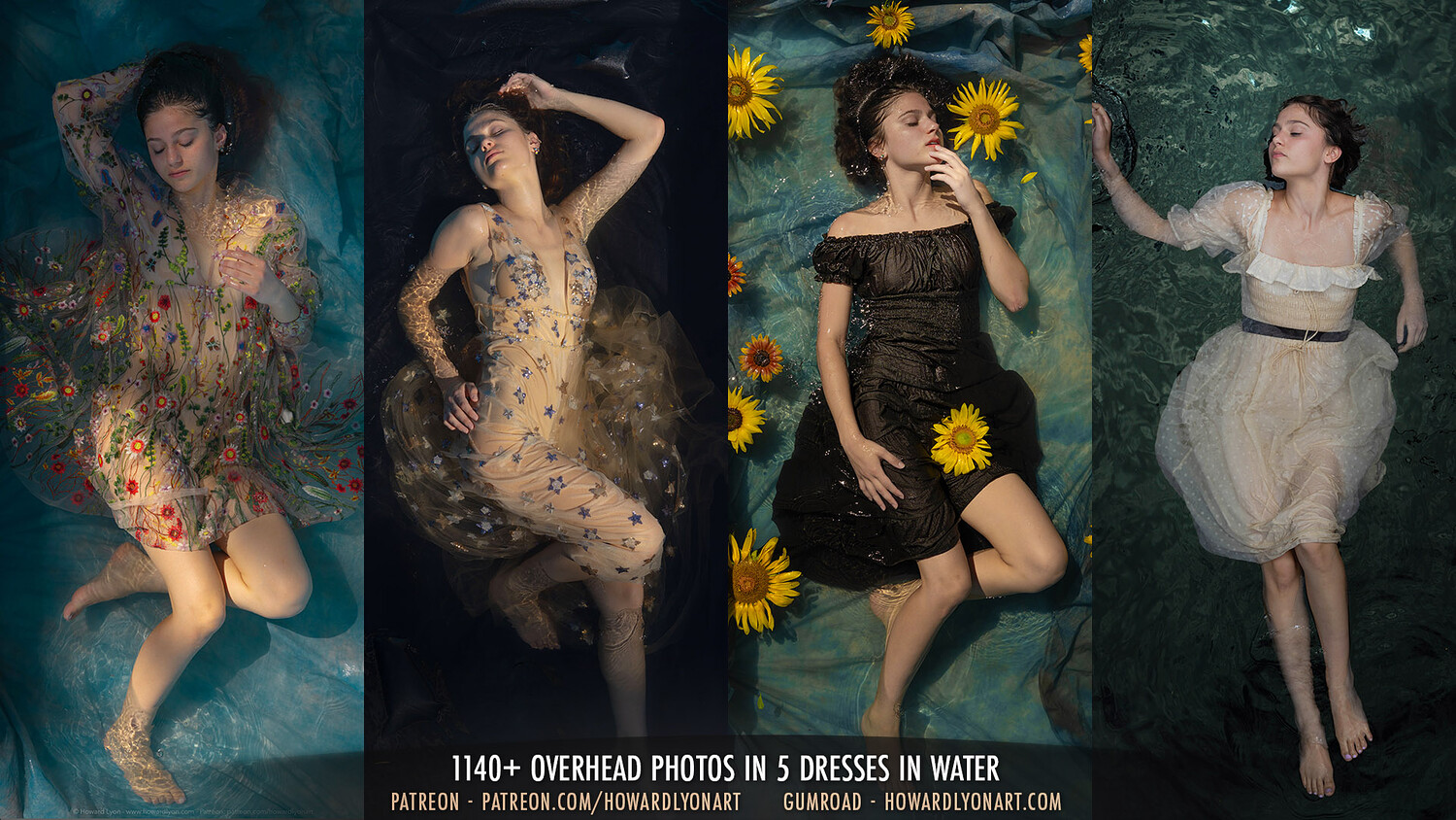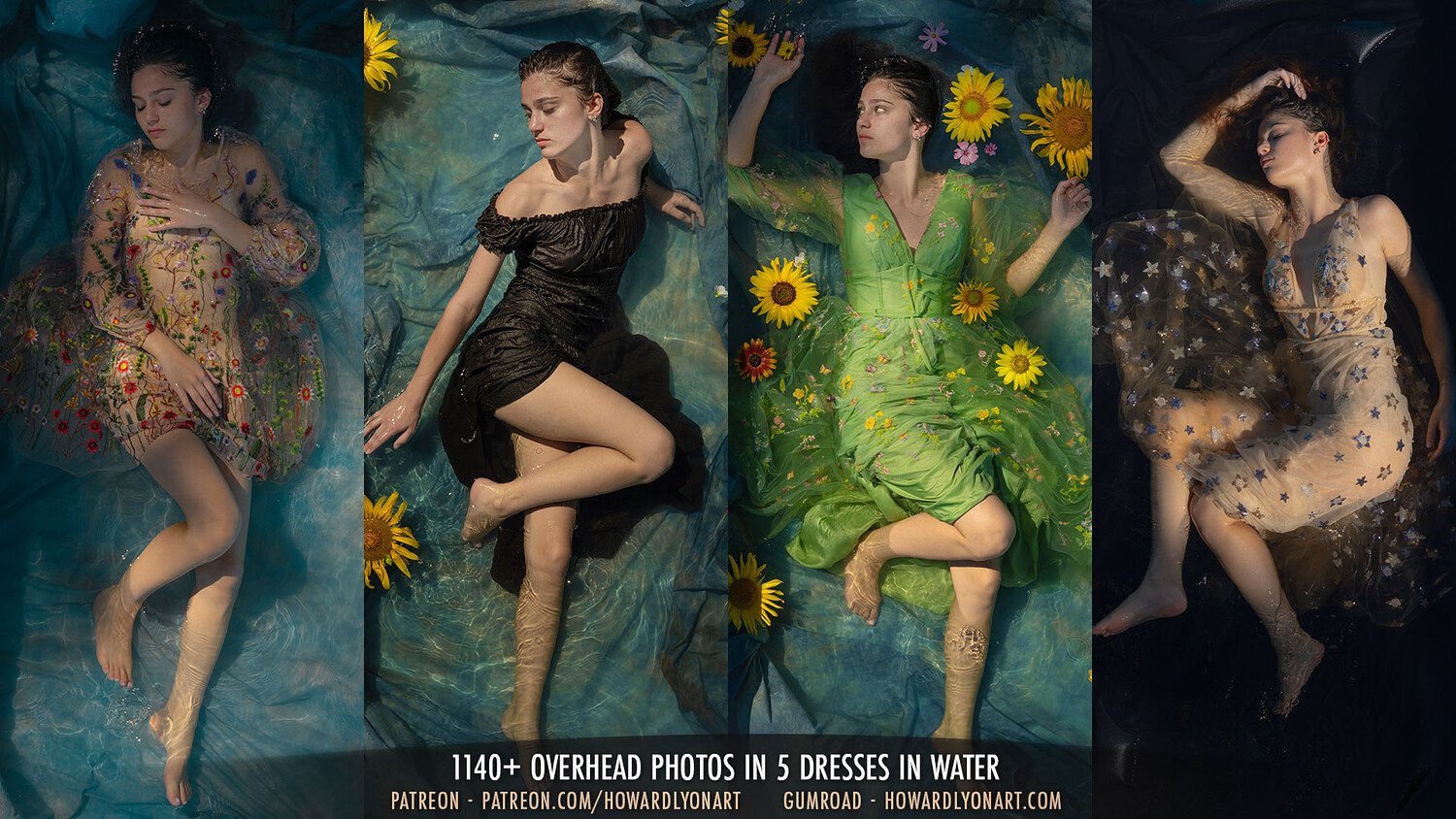 Sarah is back! I am so thrilled with this set. It was more than a year in the making, gathering the supplies and hardware I needed to safely shoot with my camera above Sarah in the pool. I also grew the flowers for the shoot. Sarah was amazing. It is taxing to lay in the water, in the sun for a few hours and it took a couple tries while we figured out how to warm the water enough and how to discreetly keep water out of her ears, among other challenges.