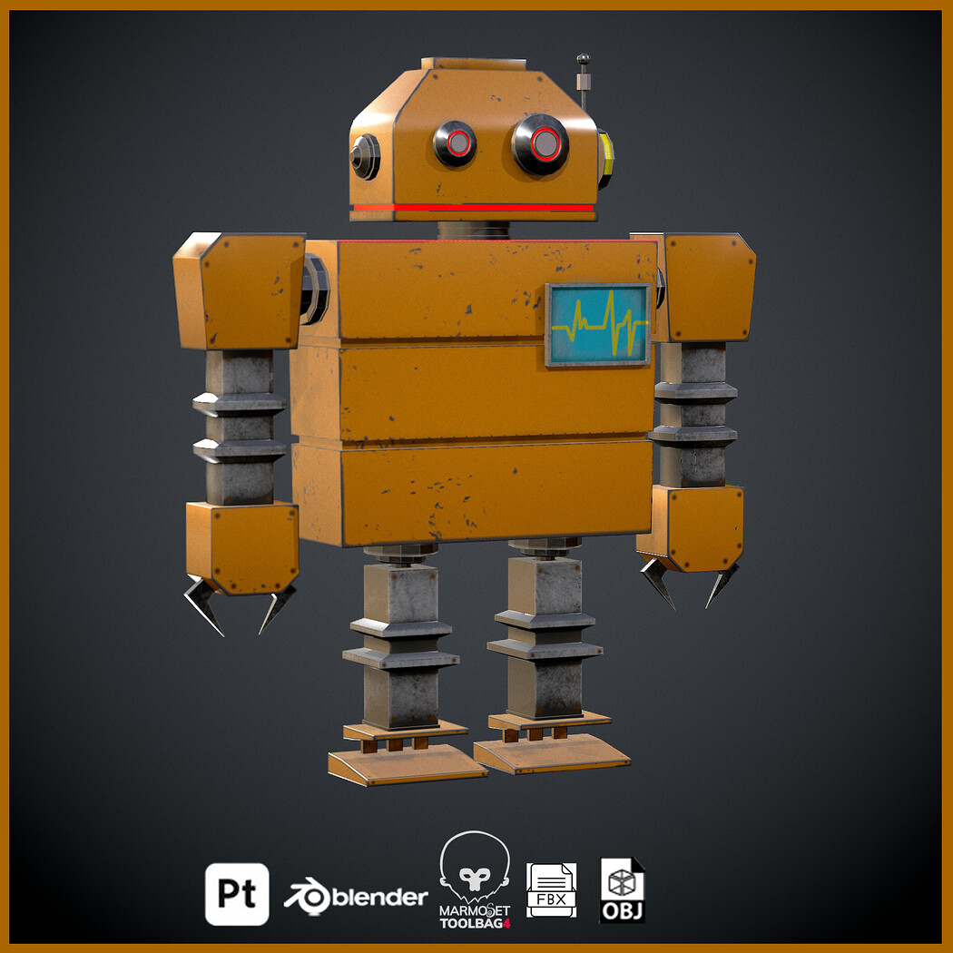 Product Description This is a stylized retro robot 3D model created in Blender, textured in Substance Painter, and rendered in Marmoset Toolbag. The asset is fully PBR textured, optimized, and ready to use in games, animations, cinematics, VR/AR, or as a base for further detailing.