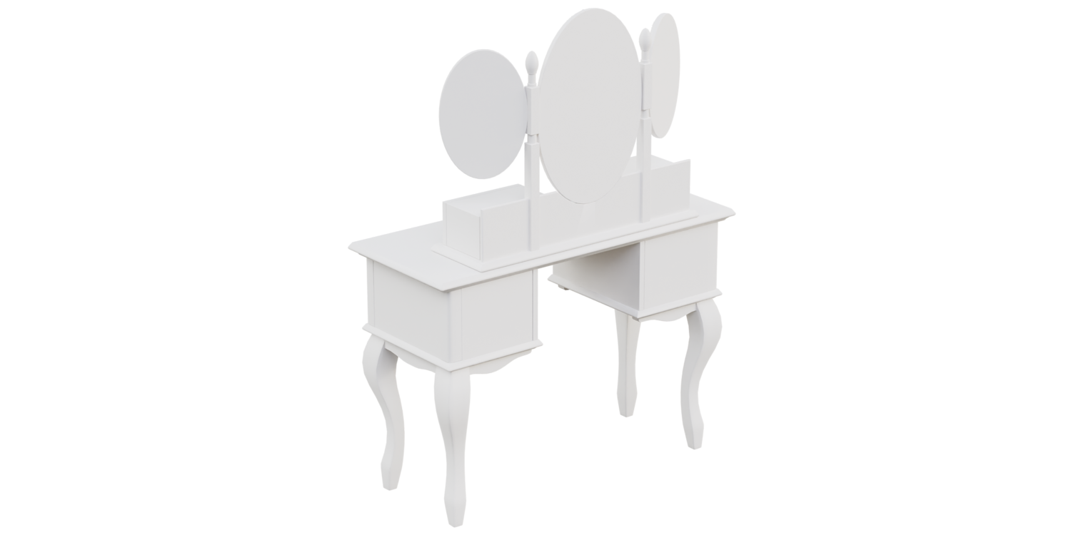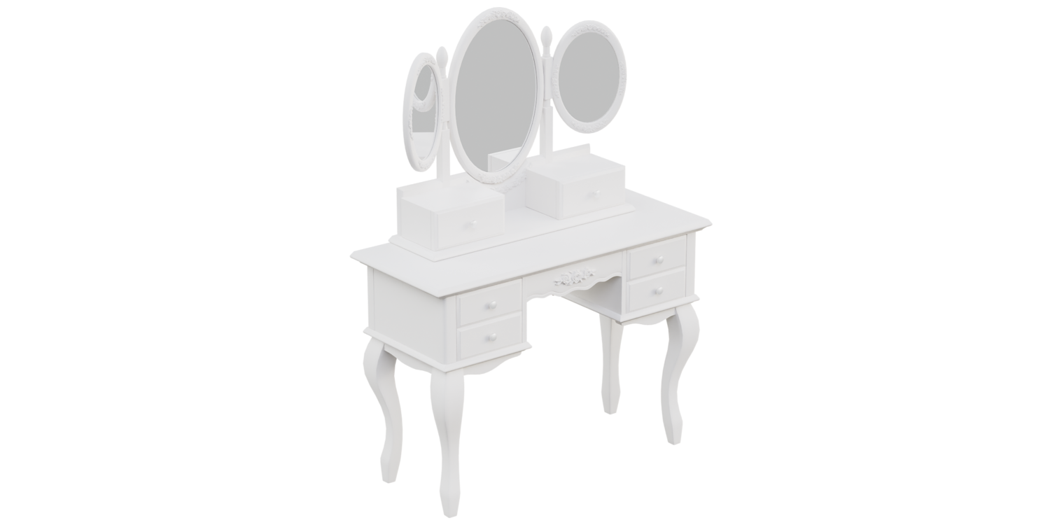 Elegant white vanity with a tri-fold mirror, adding a touch of luxury to dressing areas.