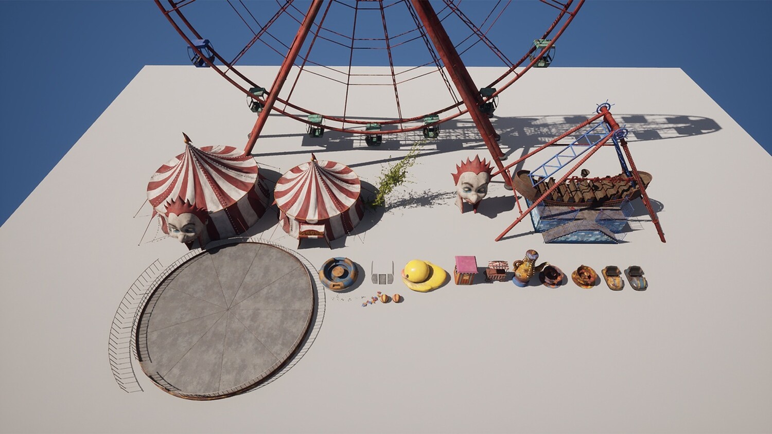 Abandoned Amusement Park Models with a texel density of 512 pixels/m.The included FBX file features quad-based models that are reset to their origin points for easy modification by users.
