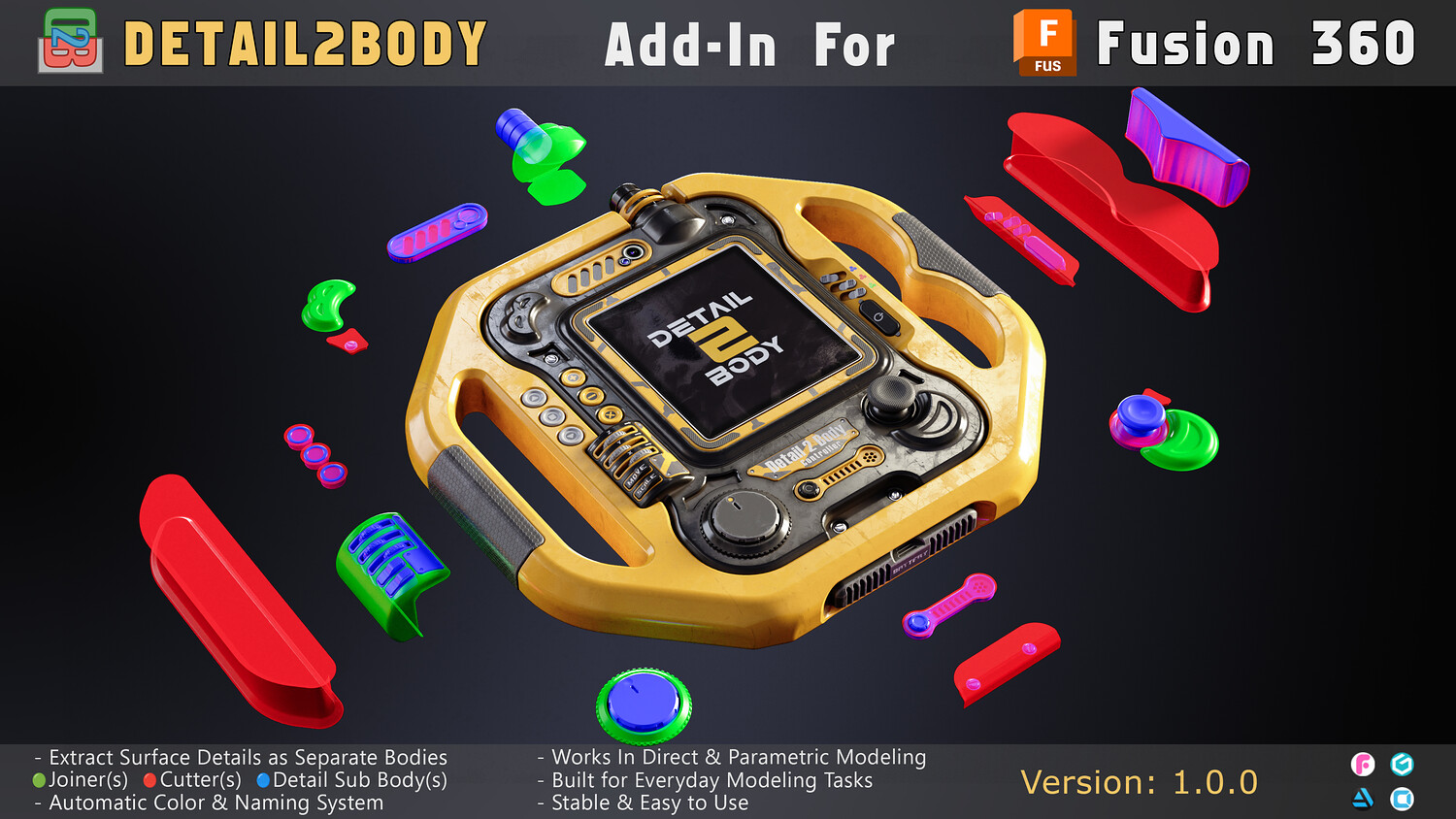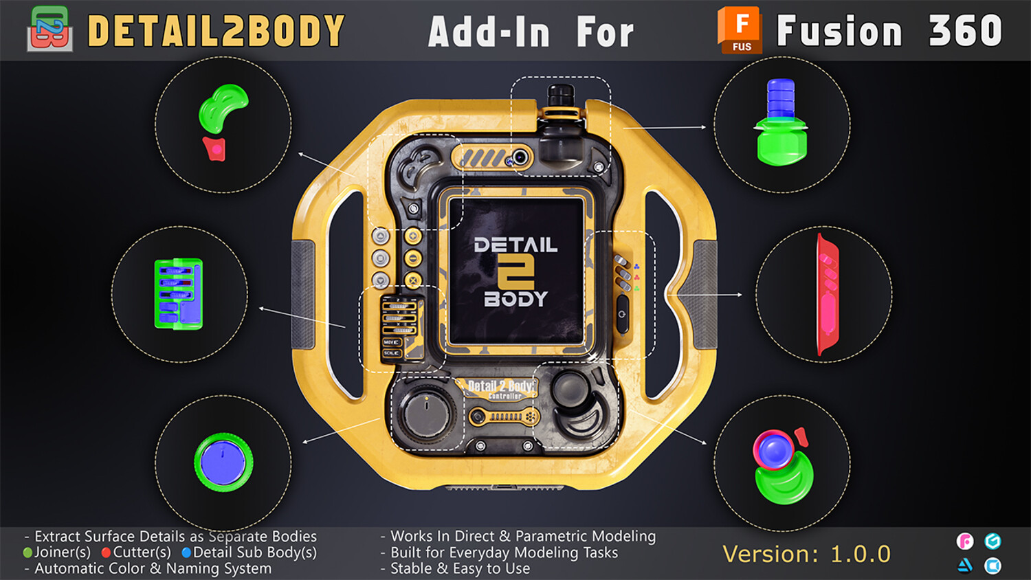 Detail2Body is a powerful Fusion 360 add-in that extracts surface details from solid bodies and converts them into separate Joiner and Cutter bodies. Perfect for kit-bashing, 3D printing, and design reuse.
